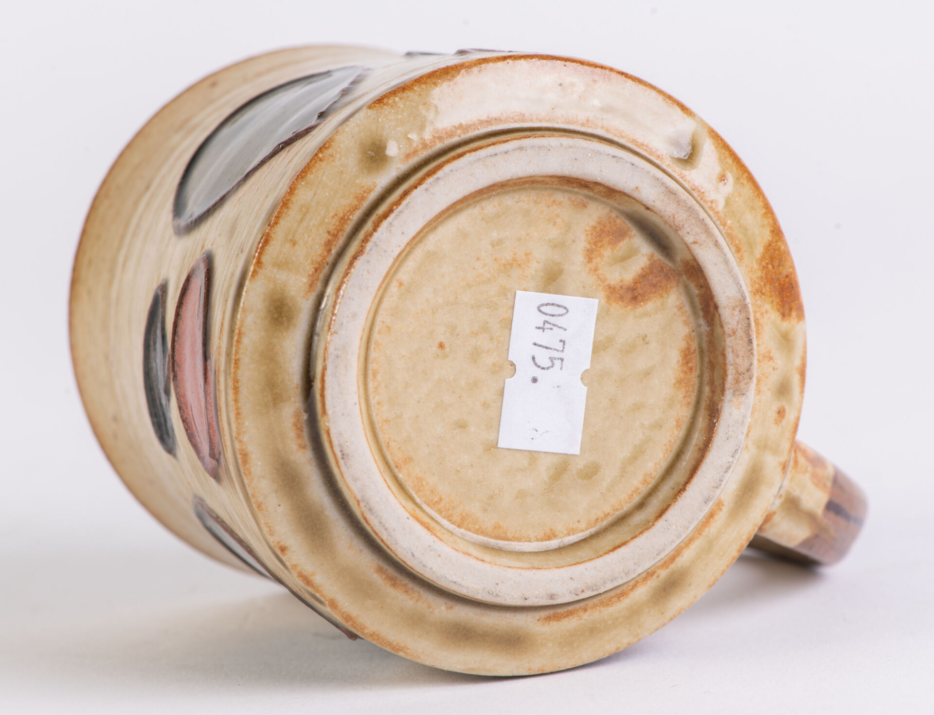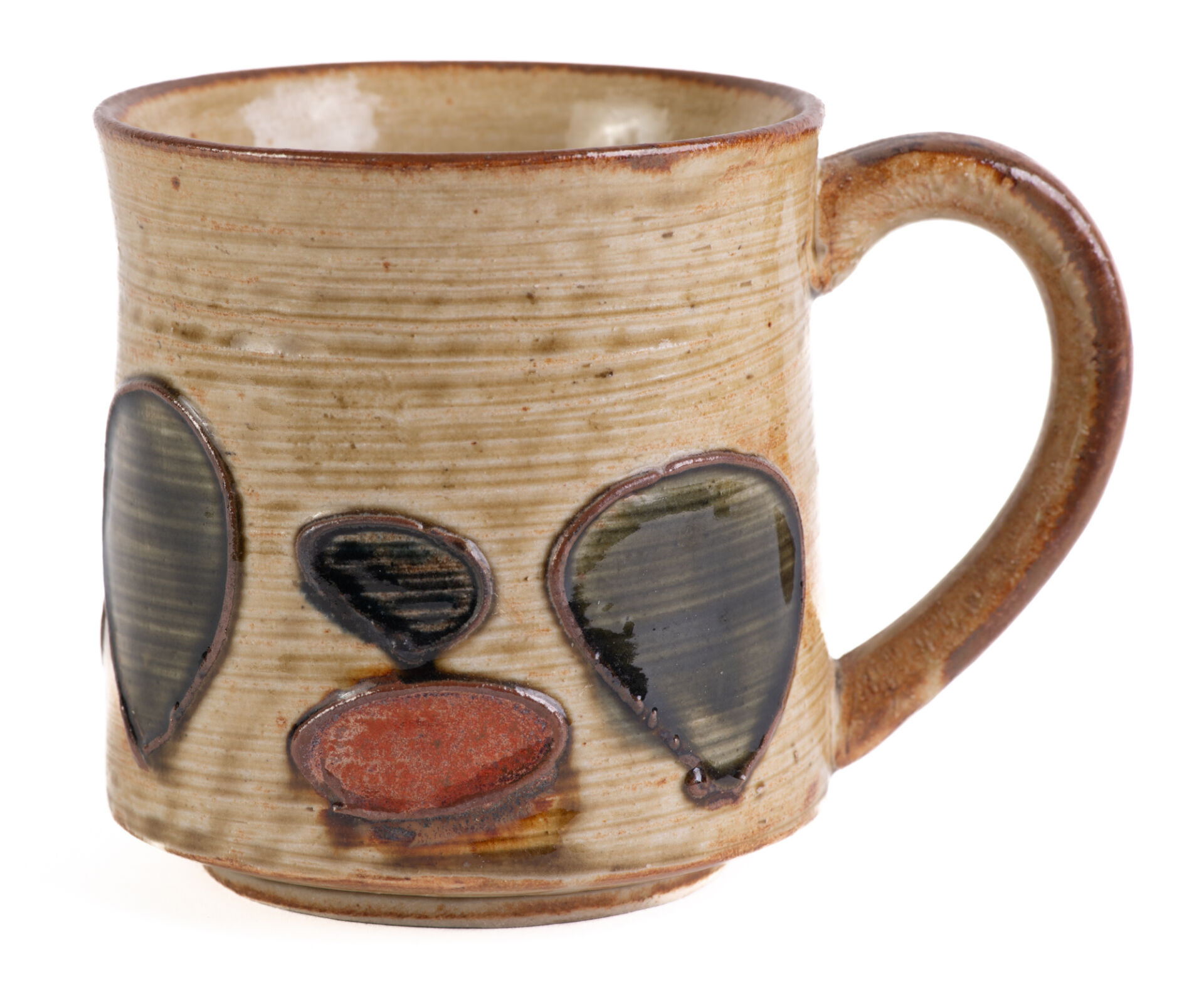 Tasse en grès émaillé à décor de formes rondes noires et rouges. H : 8,7 cm ; D : 8 cm