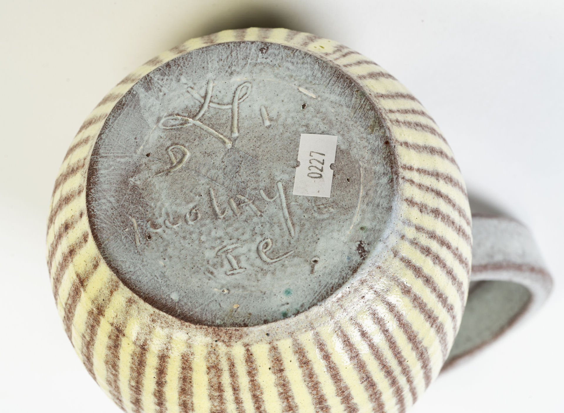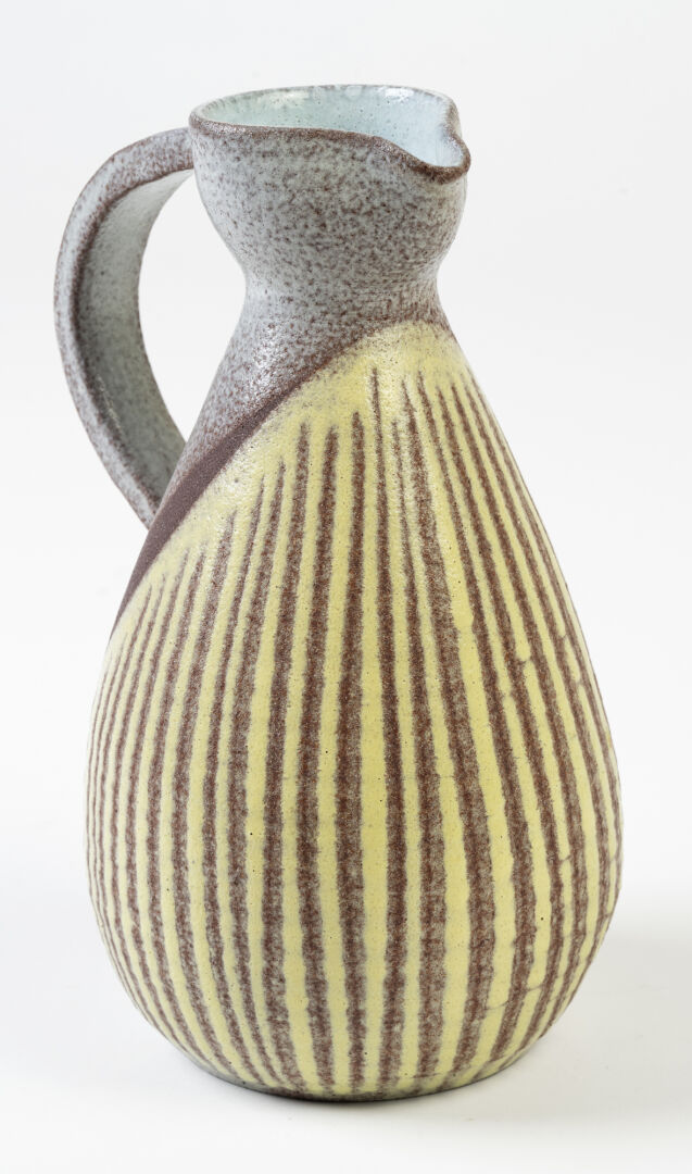 Accolay. Verseuse en grès émaillé à décor de rayures. Située et monogrammée sous la base "D. I" et "I.E". H : 25 cm ; D : 14 cm