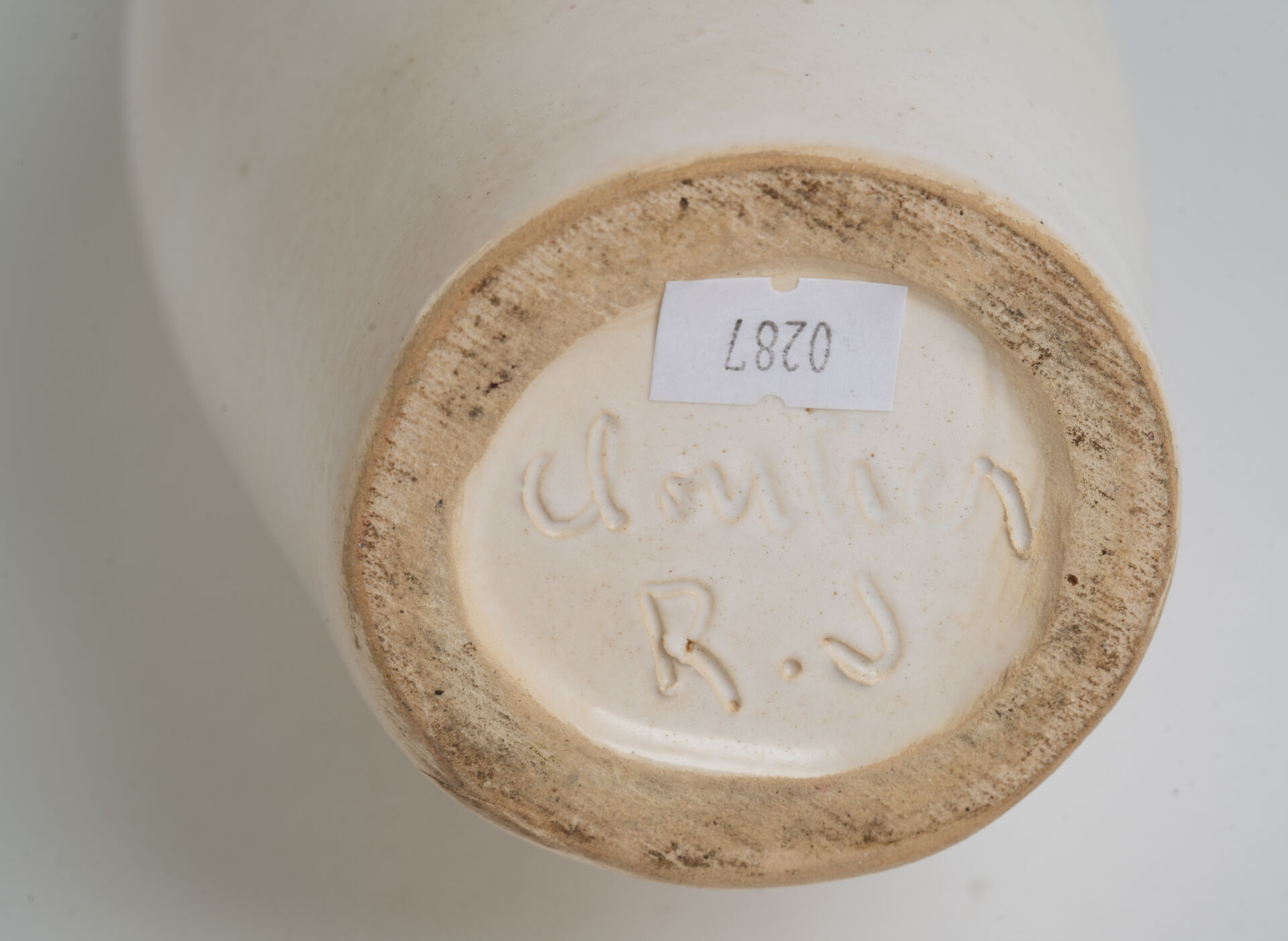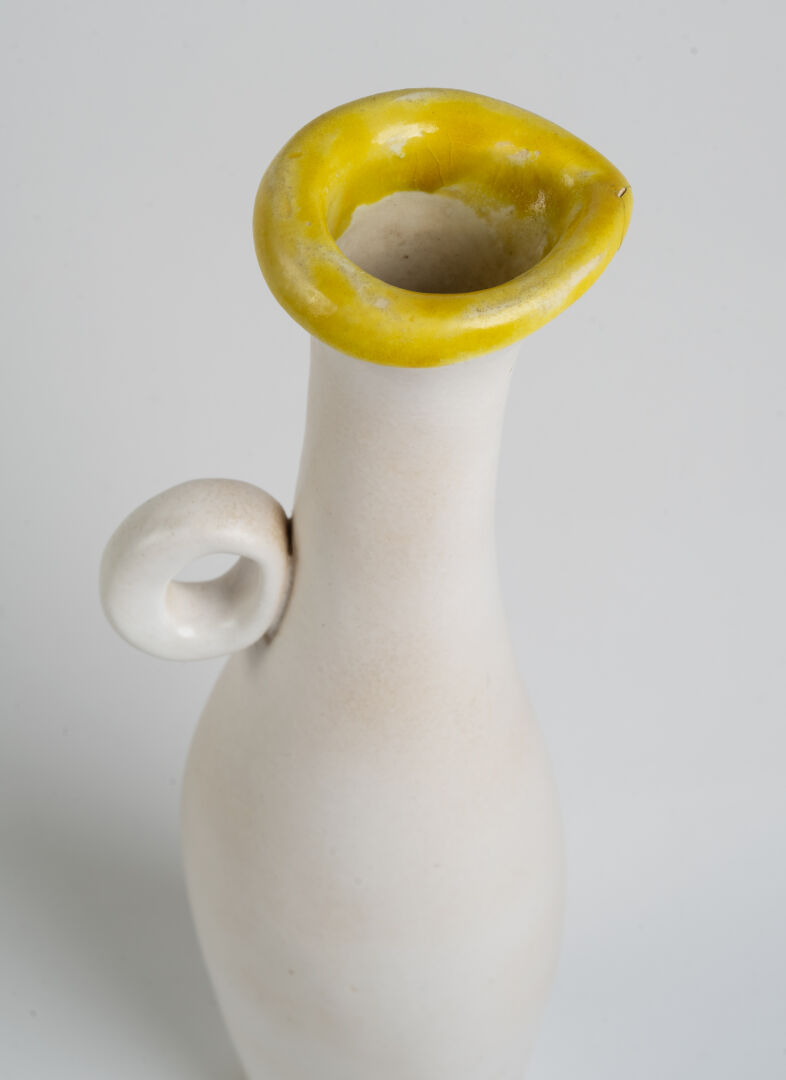 Jean et Robert CLOUTIER (1930-2015 et 1930-2008). Verseuse en céramique émaillée jaune et blanche. Signée "Cloutier R.J" sous la base. Vers 1960. Restaurations au col. H : 39 cm ; D : 10 cm