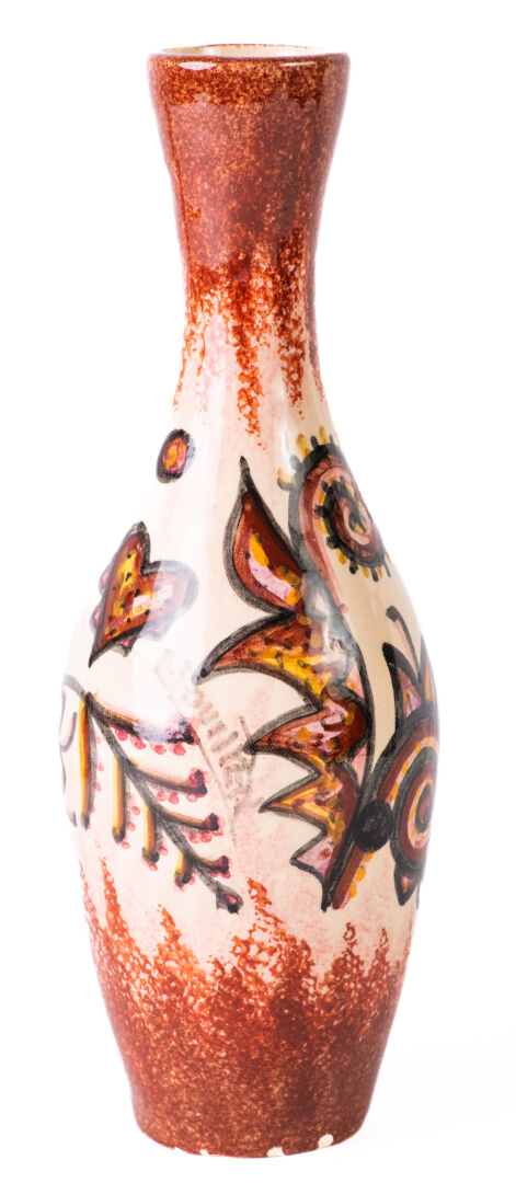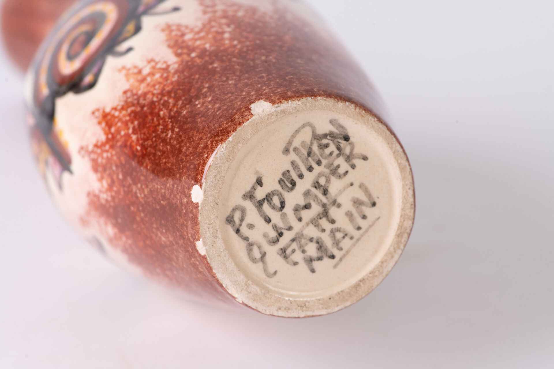 P. FOUILLEN, Quimper. Soliflore en faïence émaillée à décor floral et de coeur. Signé sous la base. H : 22,5 cm ; D : 4,8 cm