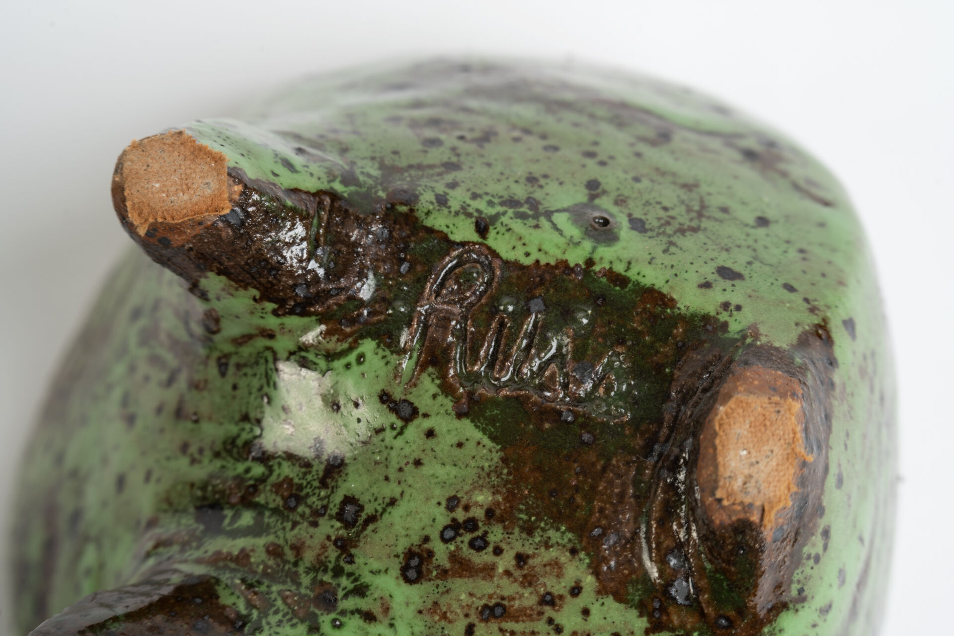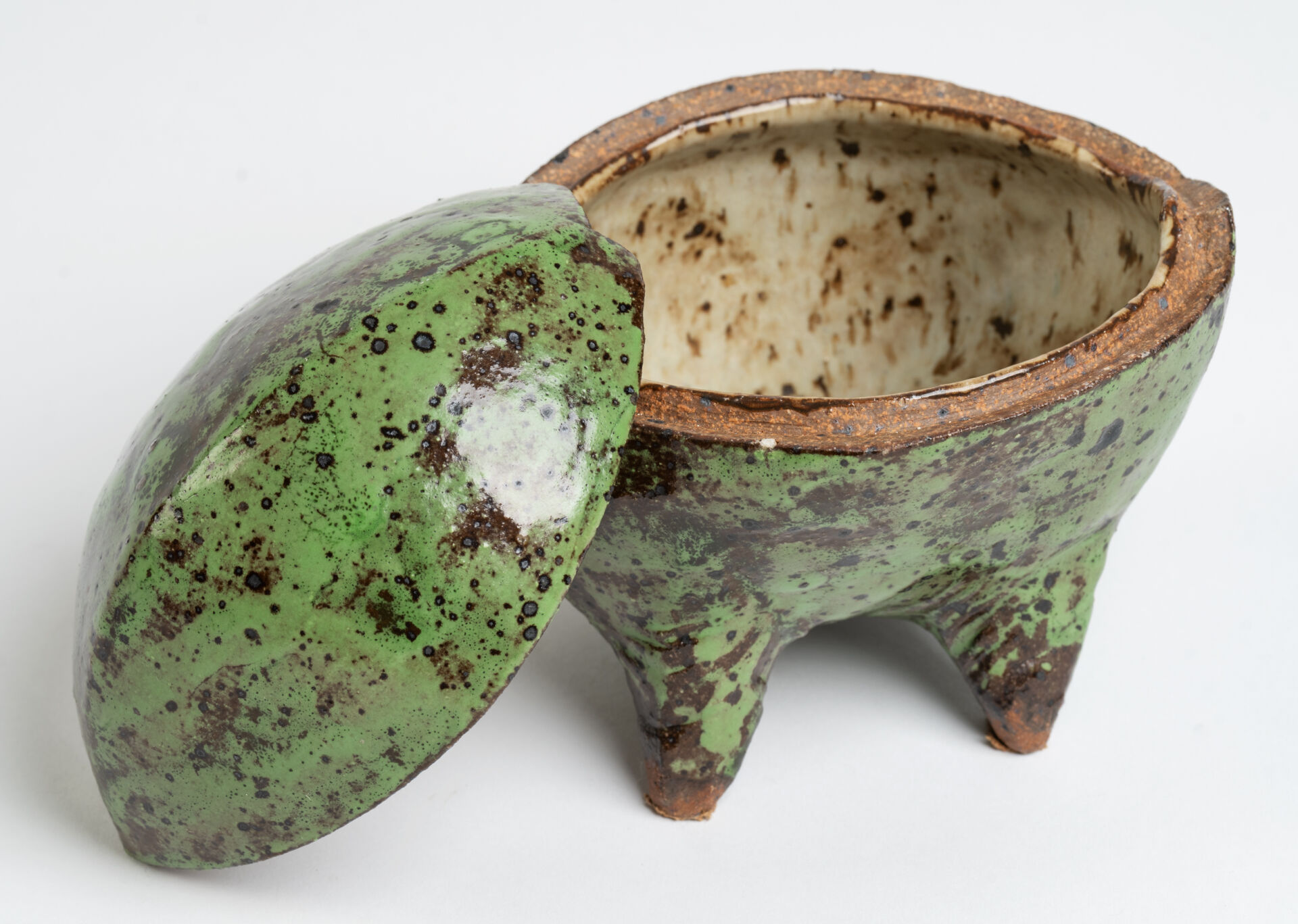 Bonbonnière sur pieds en grès émaillé vert et marron. Signée sous la base. Vers 1960. H : 15 cm ; L : 15 cm ; P : 12 cm