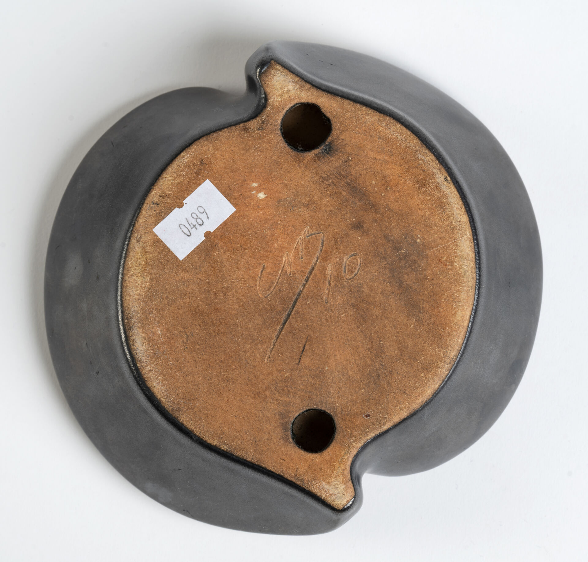 Dans le goût d'Elchinger. Vide poche en céramique émaillée rose et noire. Monogrammé sous la base. H : 4.5 cm ; D : 14.5 cm