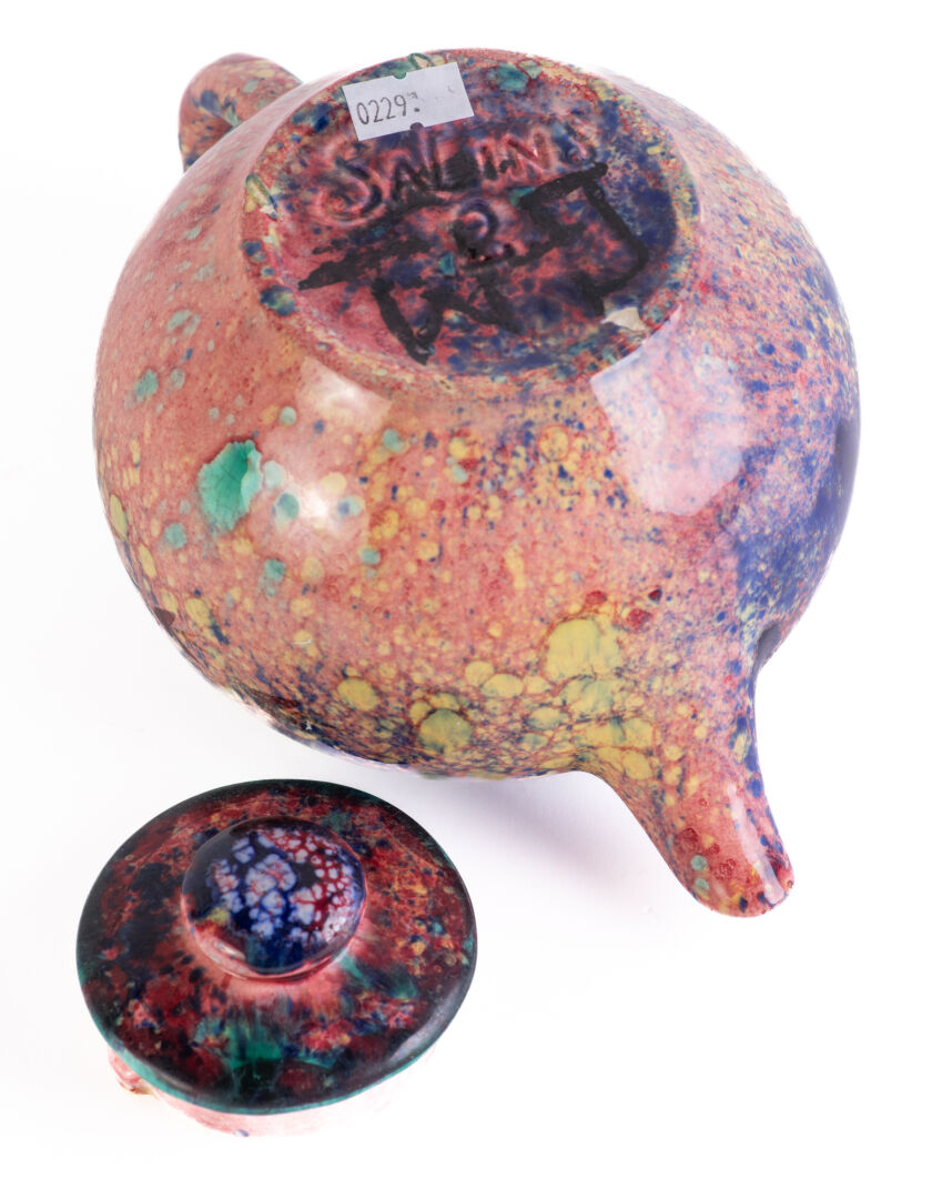 Salins. Théière en céramique émaillée multicolore. Marquée et monogrammée "G.M". H : 12,5 cm ; L : 20 cm ; l : 13,5 cm