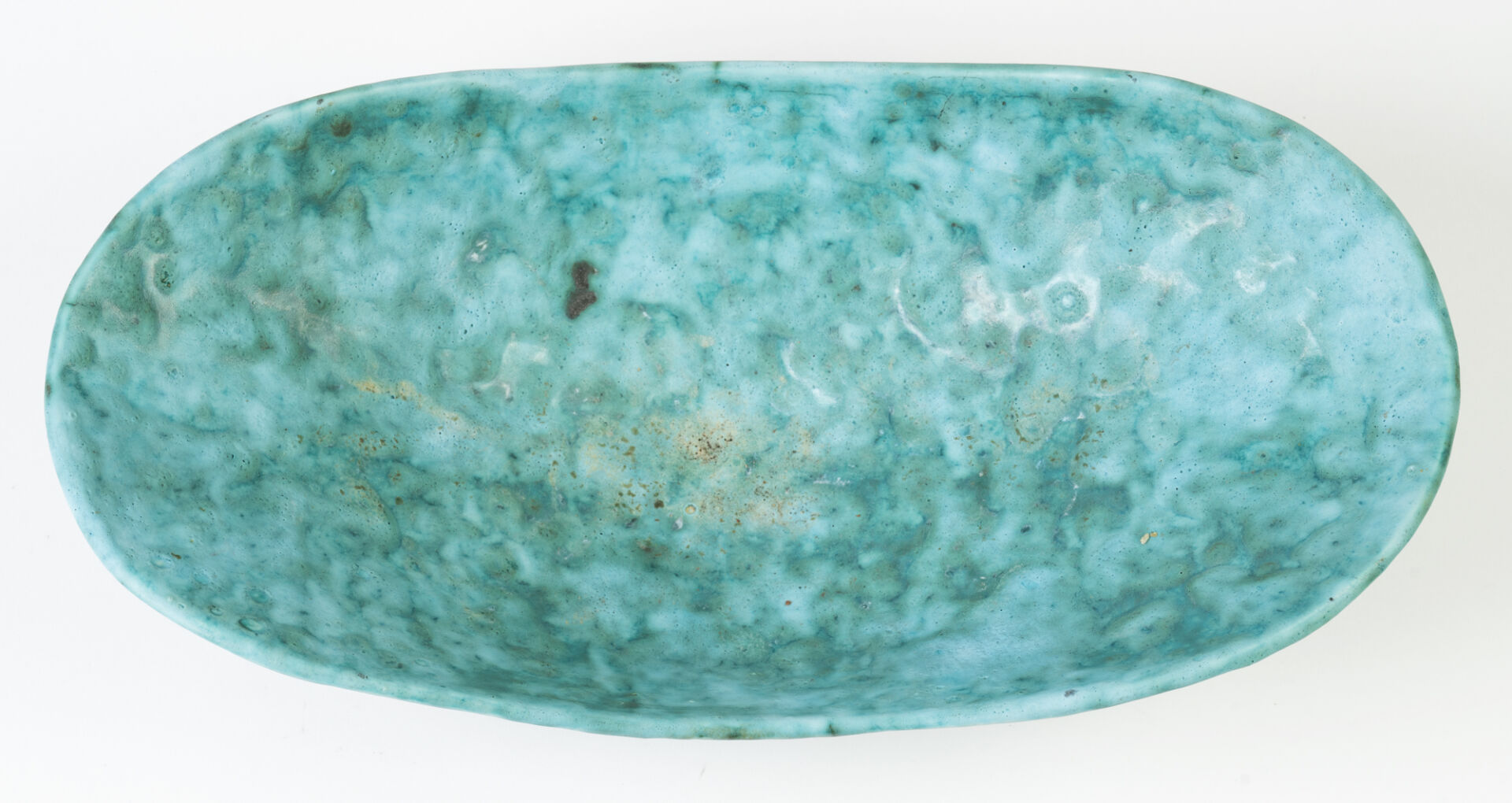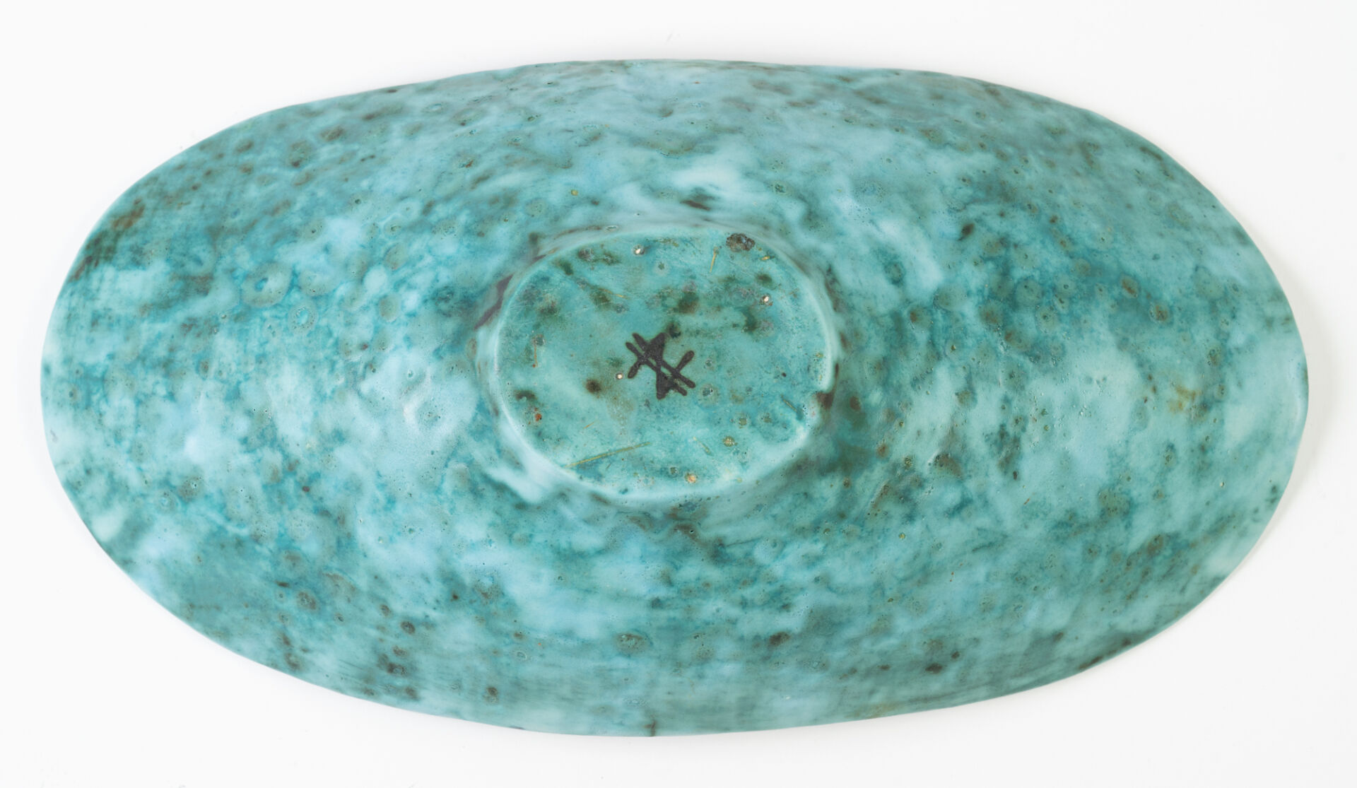Dans le goût de Jérôme MASSIER (1850-1926). Coupe en céramique émaillée imitant le jaspe. Monogrammée sous la base. H : 12 cm ; L : 41 cm ; l : 22 cm