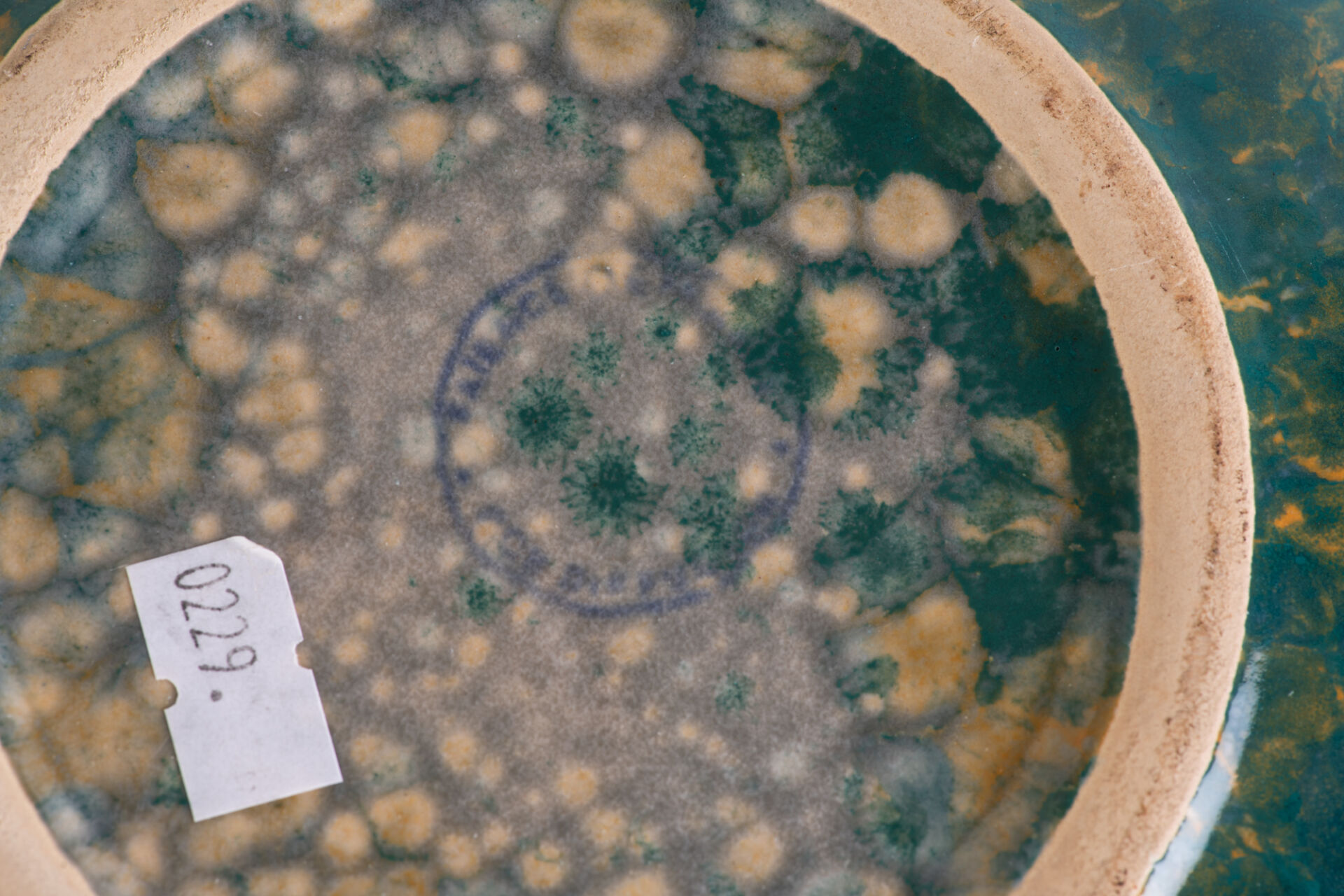 Vase boule en faïence émaillée verte et jaune. Marqué d'un cachet sous la base. H : 21 cm ; D : 11,3 cm