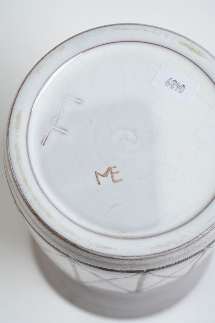 Émile MASSON à Vallauris. Vase en céramique émaillée blanche et noire. Signé et monogrammé "ME" sous la base. H : 18.5 cm ; D 11 .5 cm