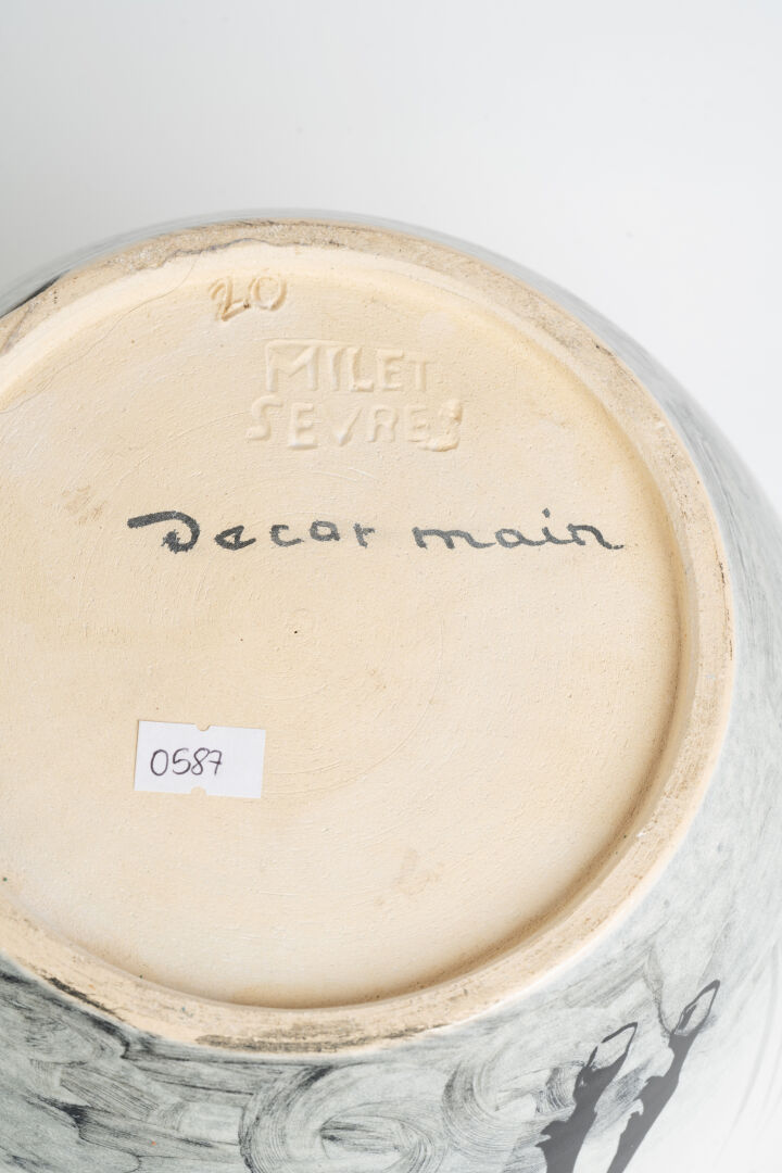 Paul MILLET (1870-1950) pour Sèvres. Cache-pot en faïence émaillée à décor de cheval. Signé sous la base. H : 24 cm ; D : 25.5 cm