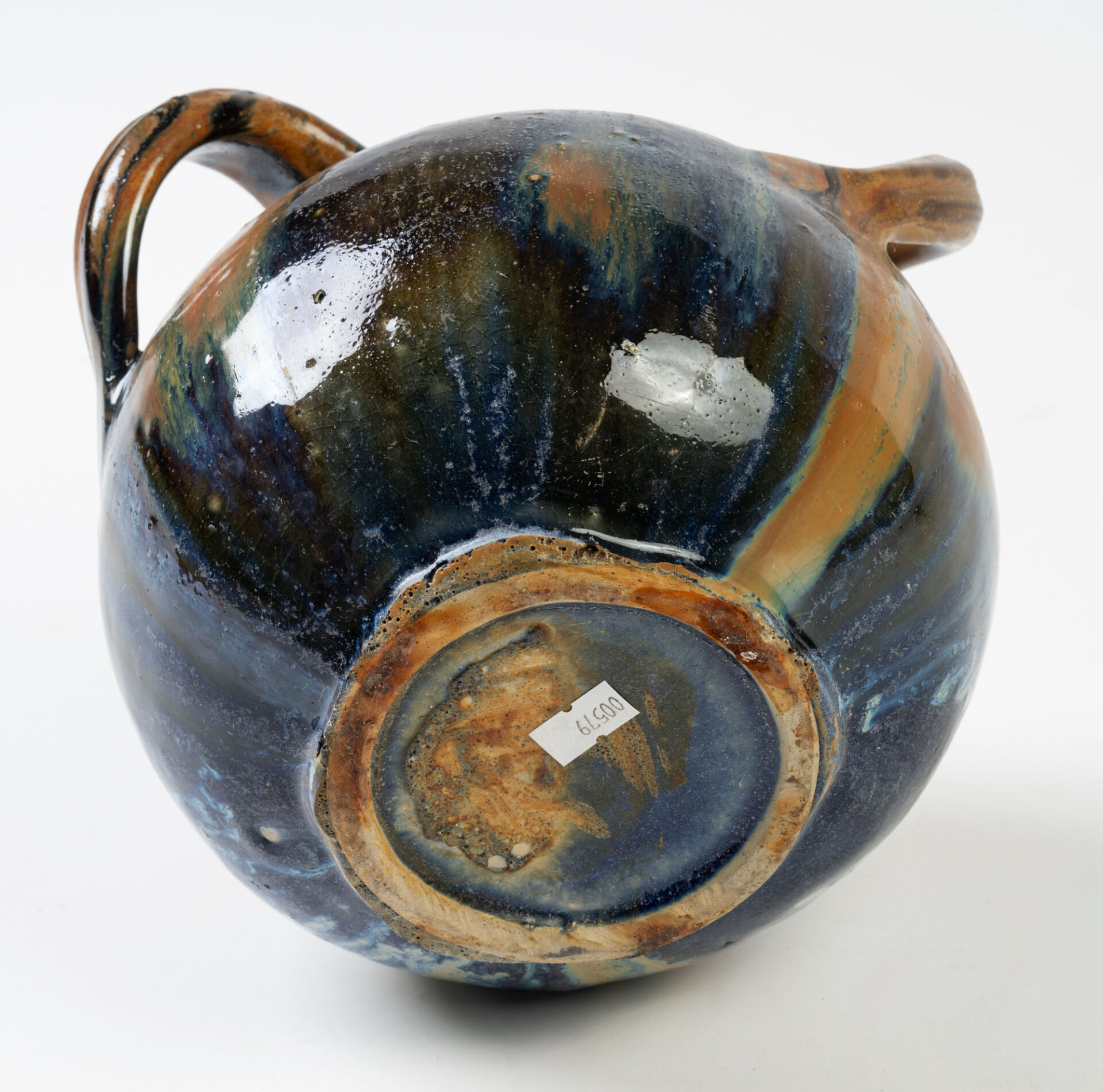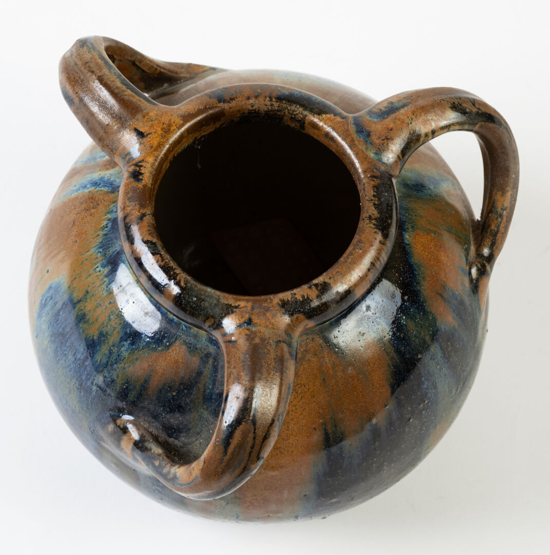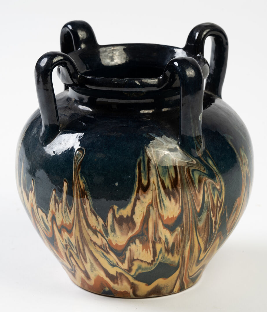 Dans le goût de Vallauris. Ensemble de deux vases à trois anses pour l'un et quatre pour l'autre en céramique émaillée. H : 19 cm et 18, 5 cm.