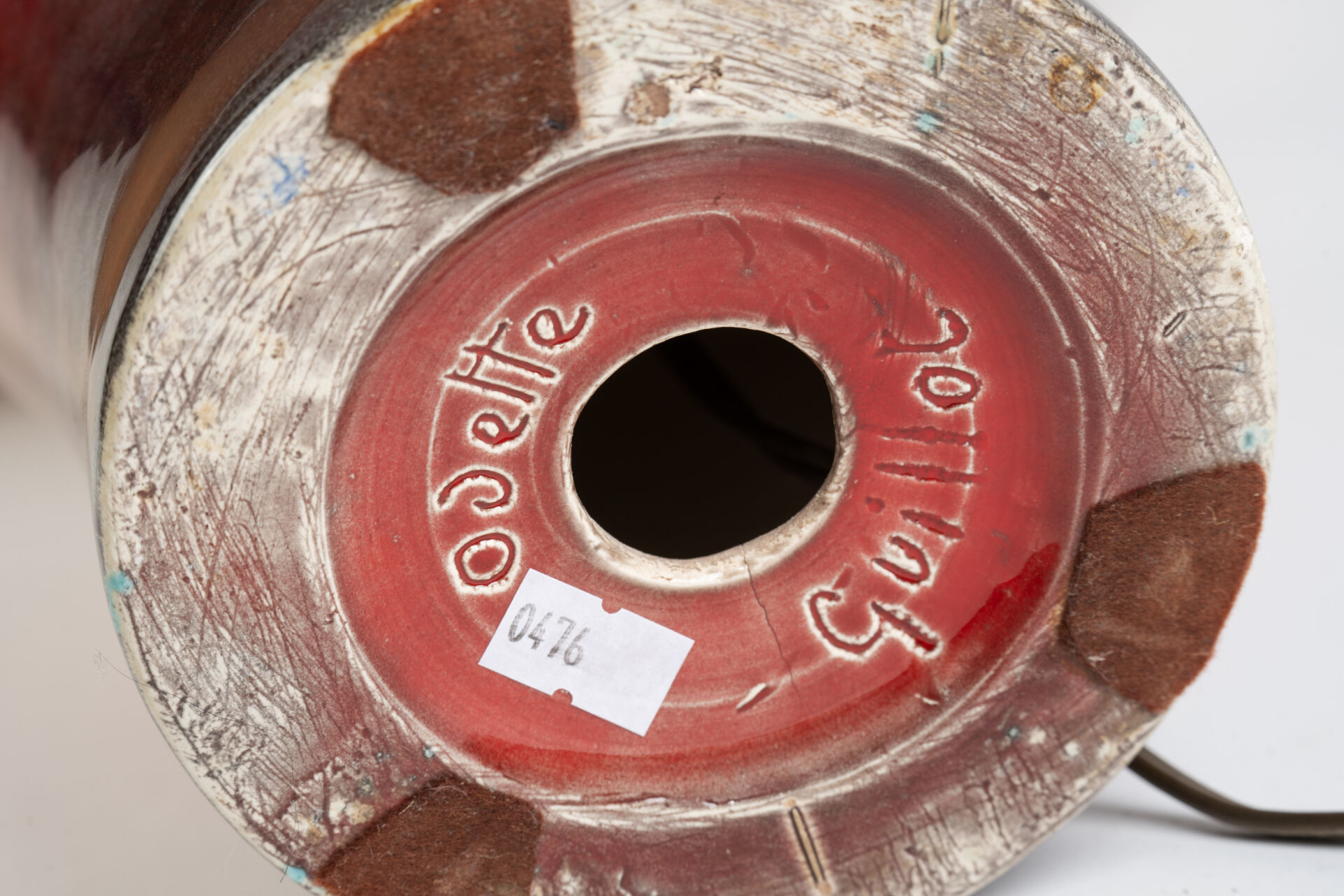Odette LEPELTIER (1914-2006) et Marcel GUILLOT (1910-1985). Pied de lampe en céramique émaillée rouge. Signé "Odette" et "Guillot" sous la base. H : 72 cm ; D : 30 cm