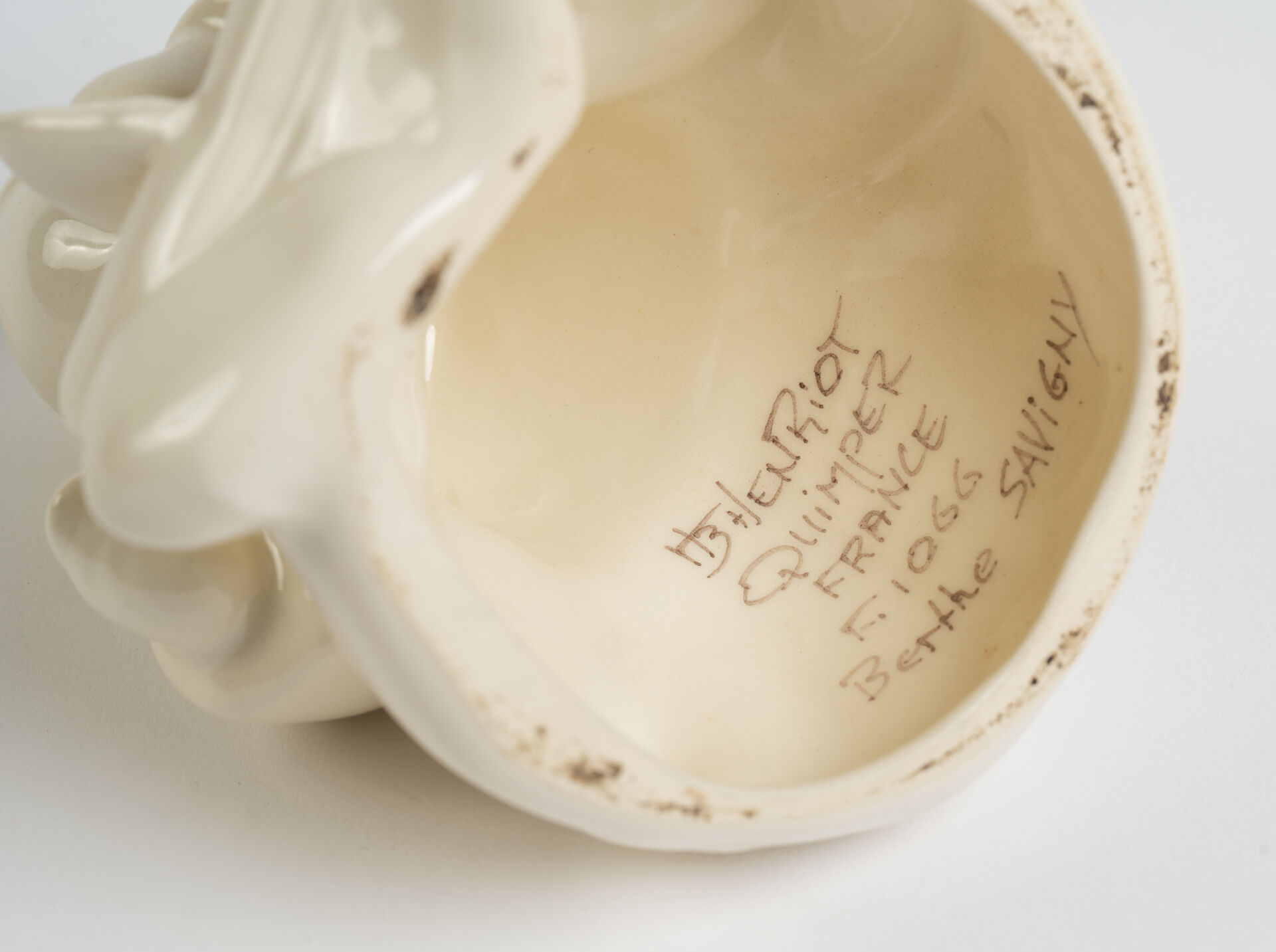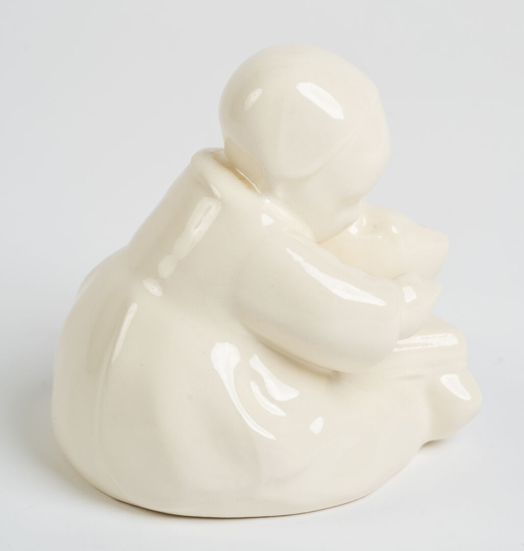 Berthe SAVIGNY pour Henriot Quimper. "Bébé au livre". Sujet en faïence émaillée blanche signé et situé sous la base. H : 12 cm ; L : 11 cm ; l : 10 cm
