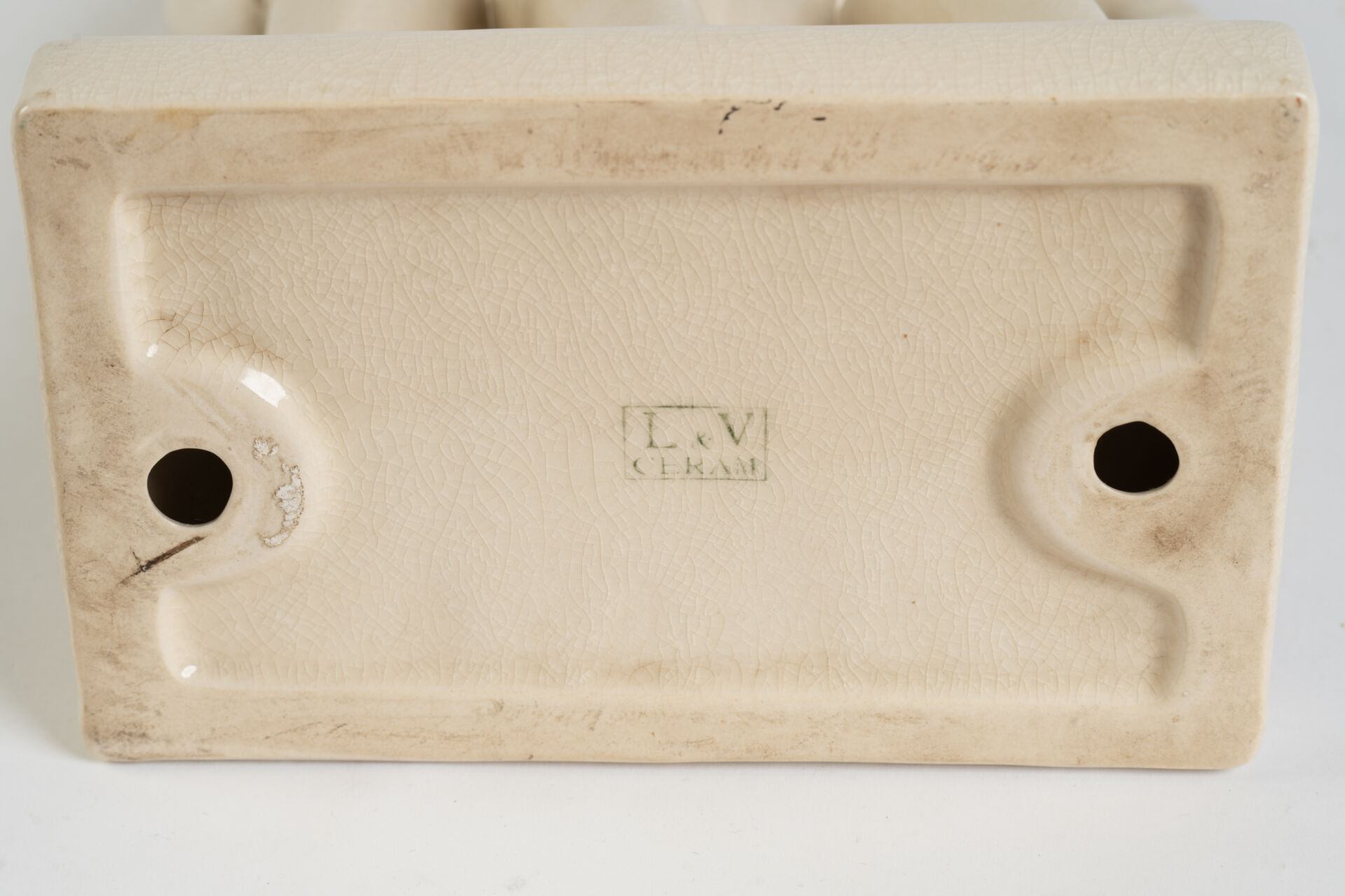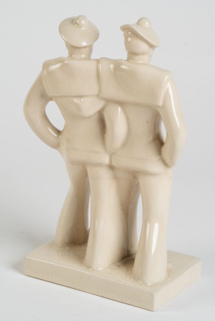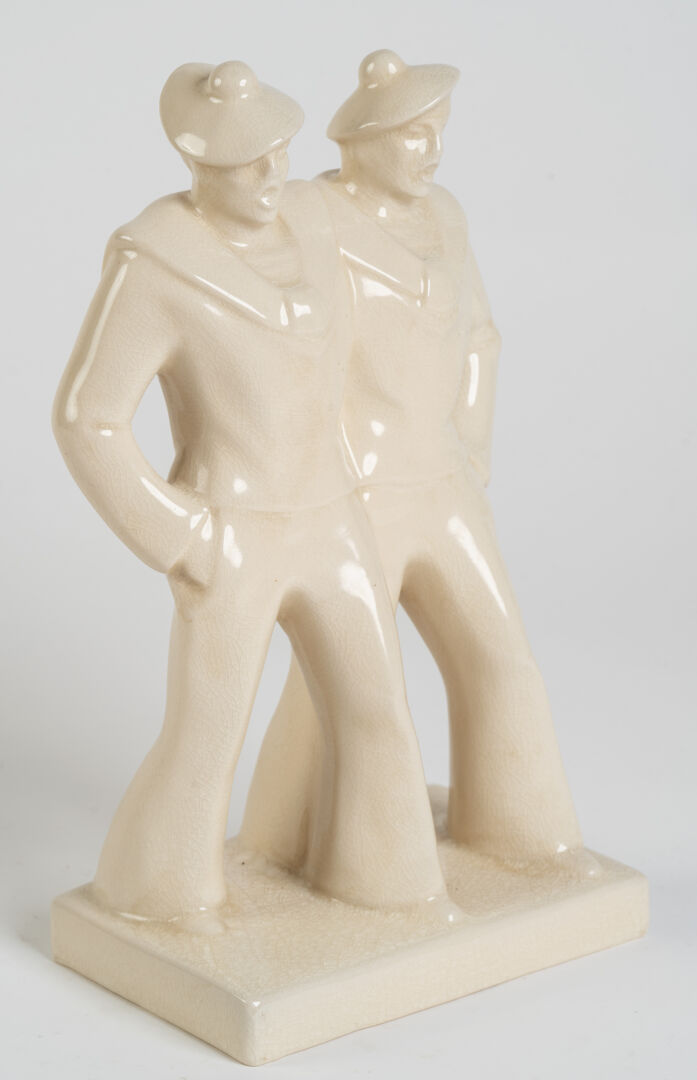 Dans le goût de Jim SEVELLEC (1897-1971). "Marins en goguette". Sujet en faïence émaillée blanche marqué "L&V Ceram" sous la base. H : 37 cm ; L : 19,5 cm ; l : 12 cm