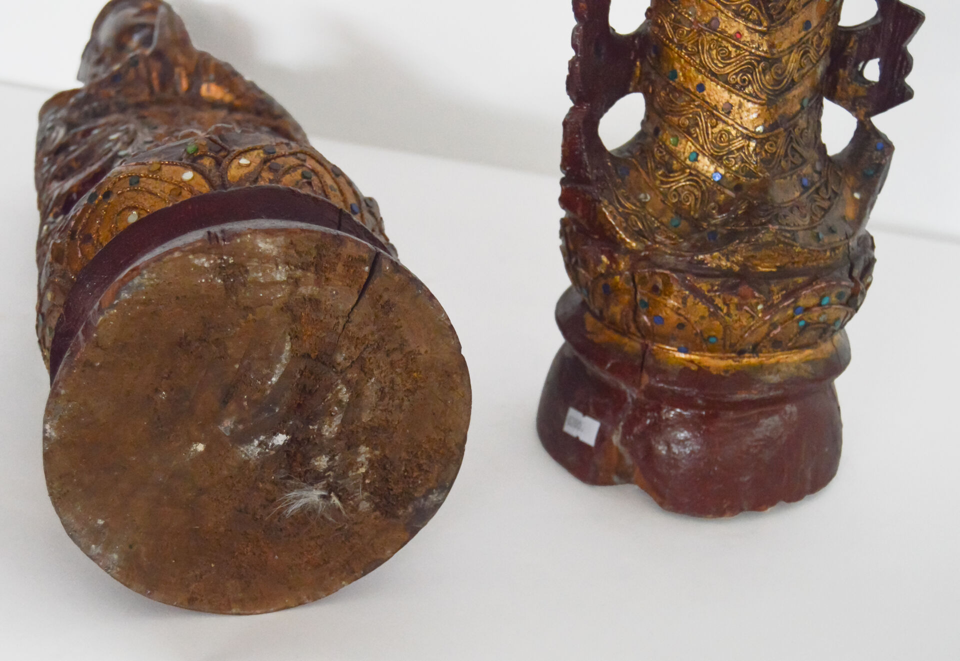 Birmanie, XXème siècle. Couple de danseurs en bois sculpté et doré à décor de verroterie. H : 63 cm.