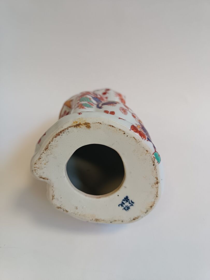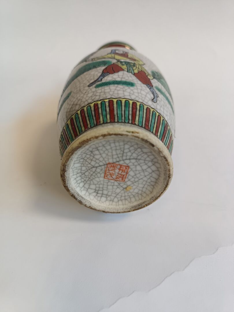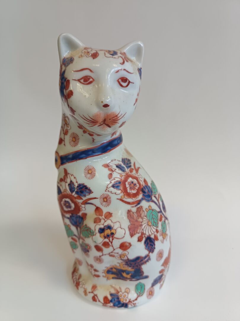 Chine. Lot comprenant un vase en porcelaine émaillée à fond craquelé et un chat en porcelaine émaillé dans le goût Imari.