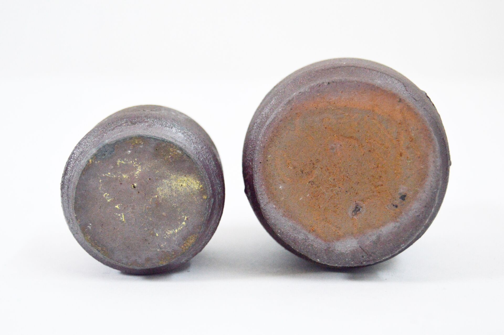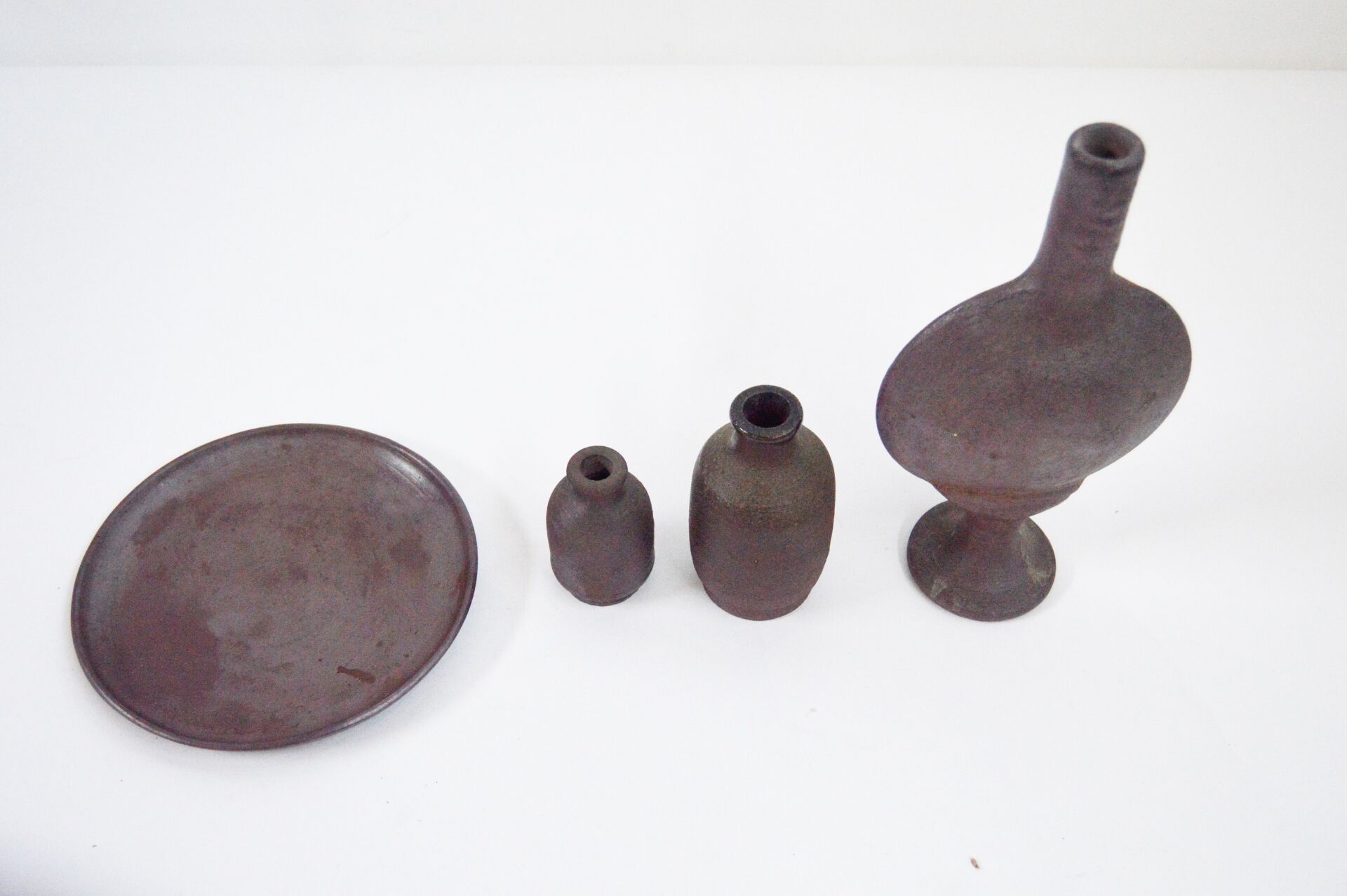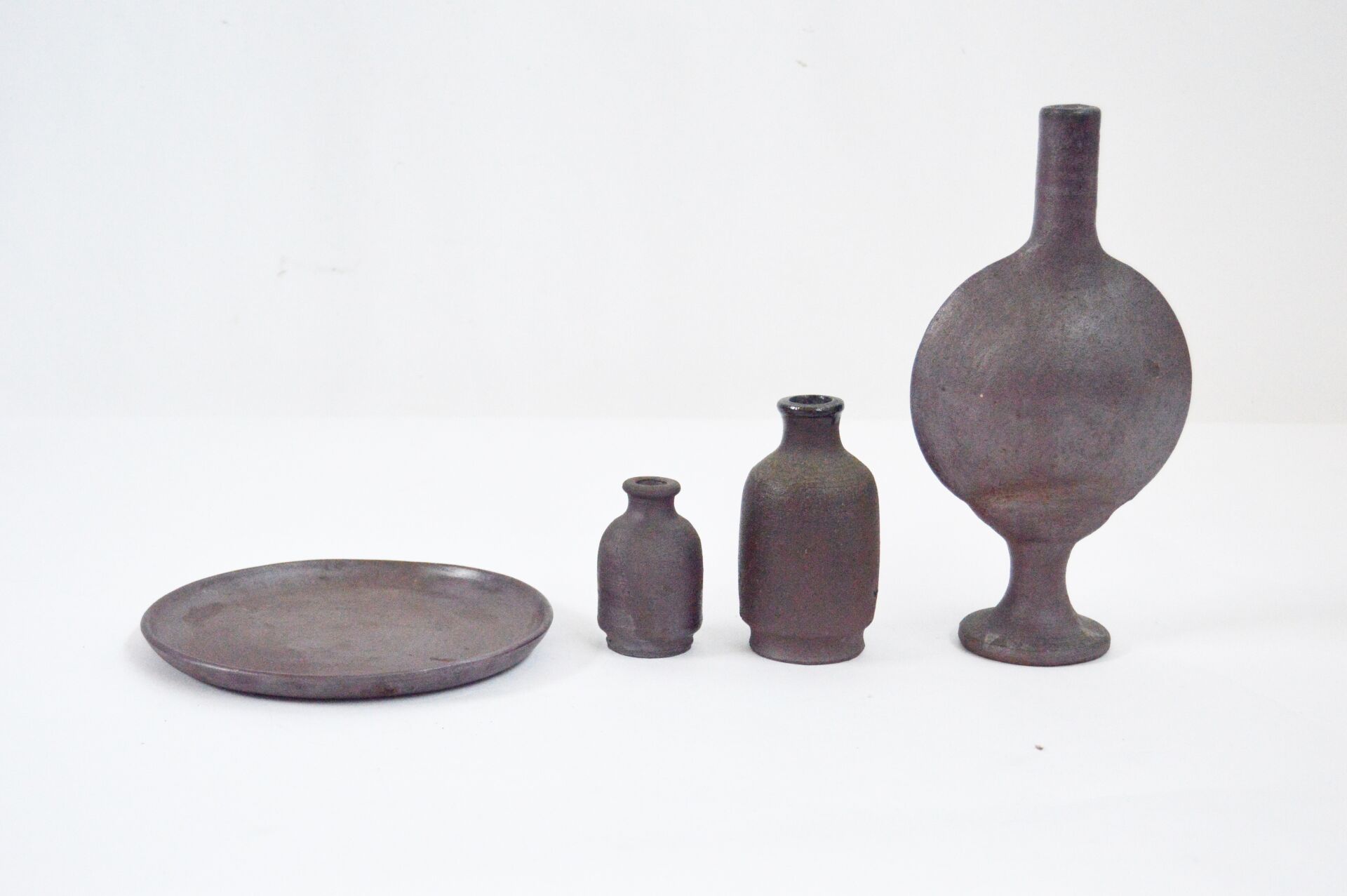 Normandie. Trois vases et un plat en terre cuite. Vases: H max : 25, 5 cm ; H min : 8 cm ; D max : 14 cm ; D min : 5 cm Plat : H : 2 cm ; D : 19 cm