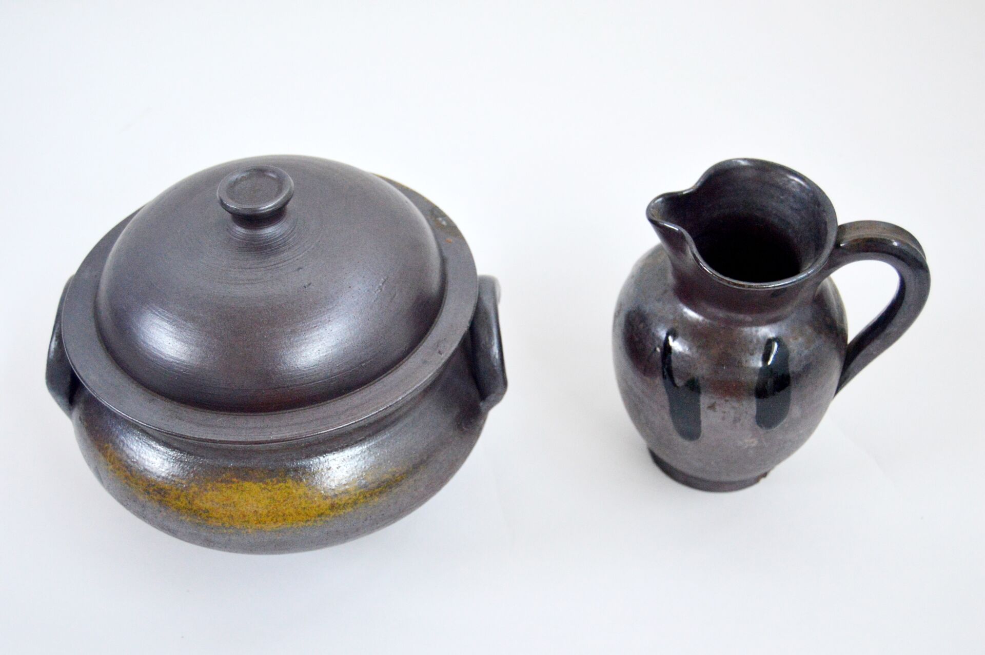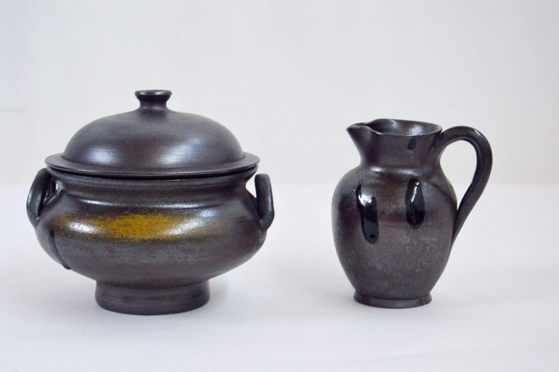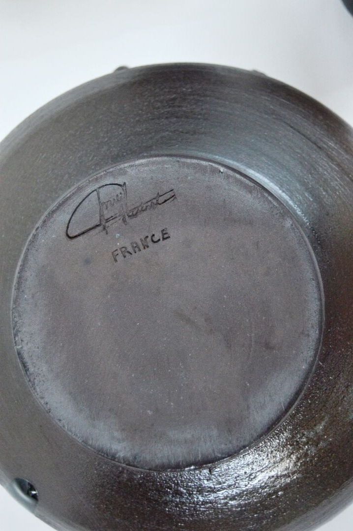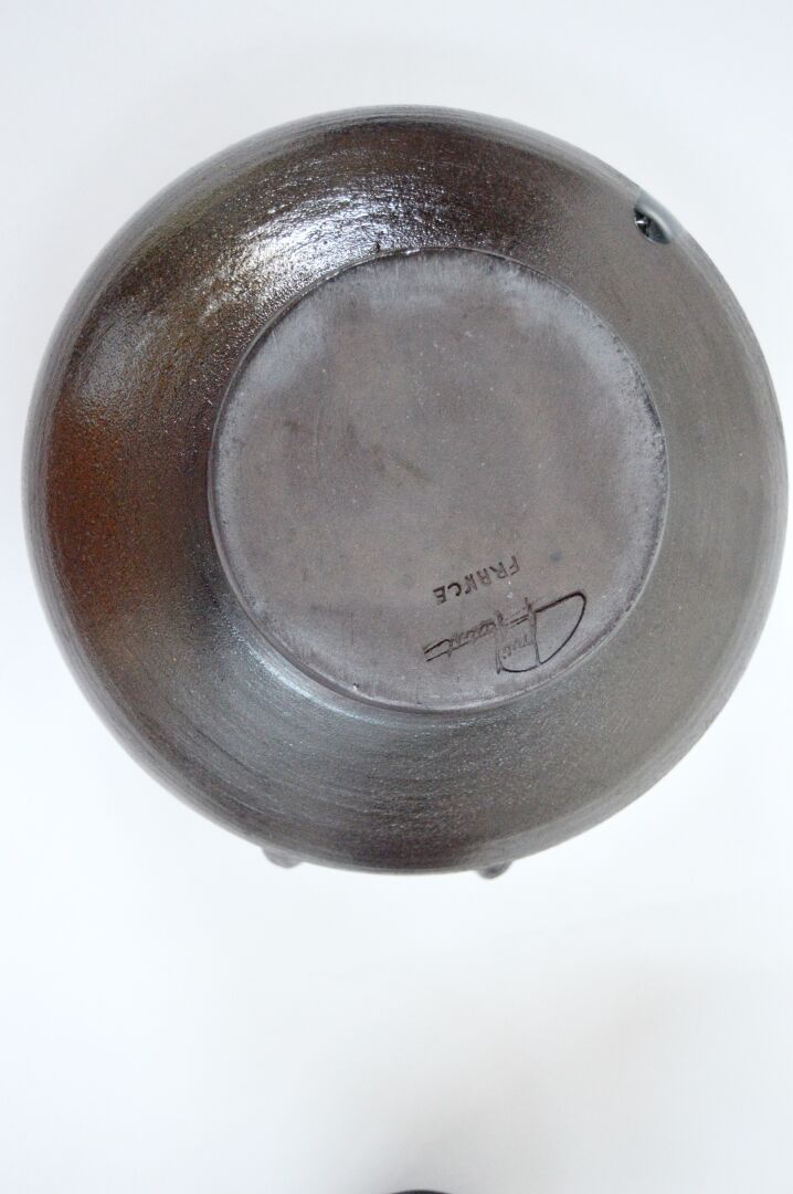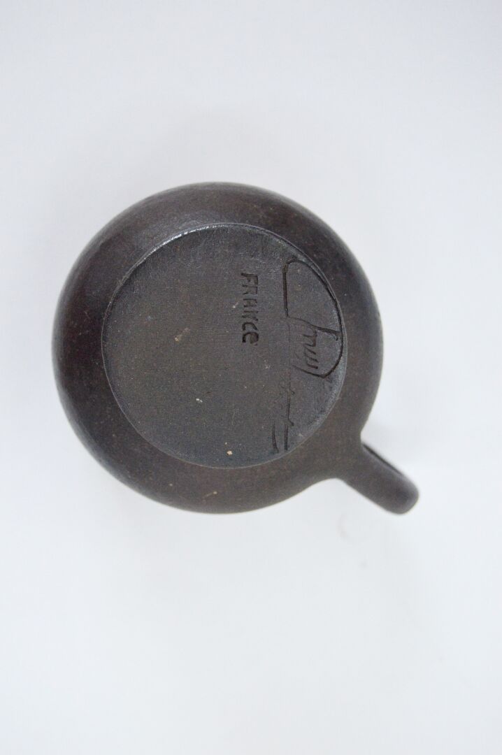 Néhou. Lot comprenant une soupière, une verseuse et deux tasses. Signé sous la base Soupière : H : 19 cm ; D : 20 cm Verseuse : H : 15,5 cm ; D : 14 cm avec anse Tasses : H : 5,5 cm ; D : 9 cm avec anse