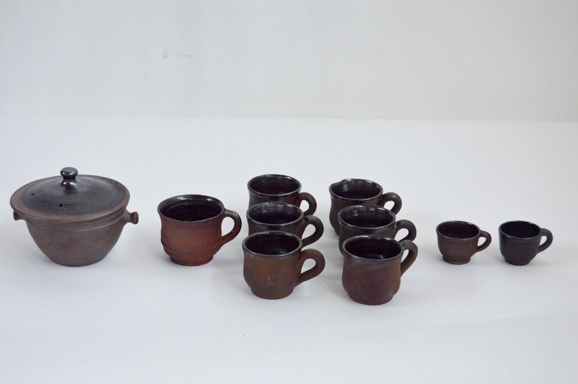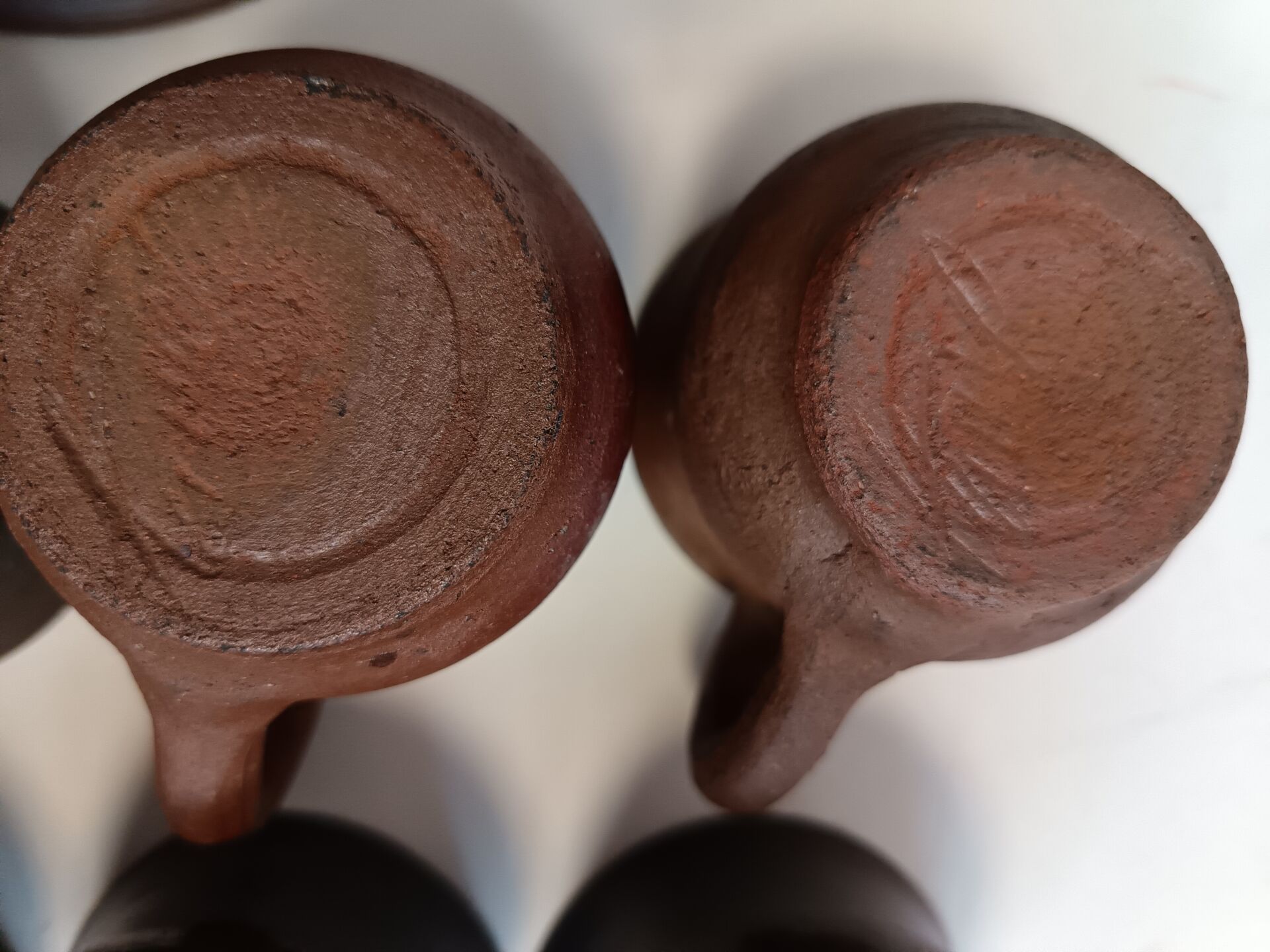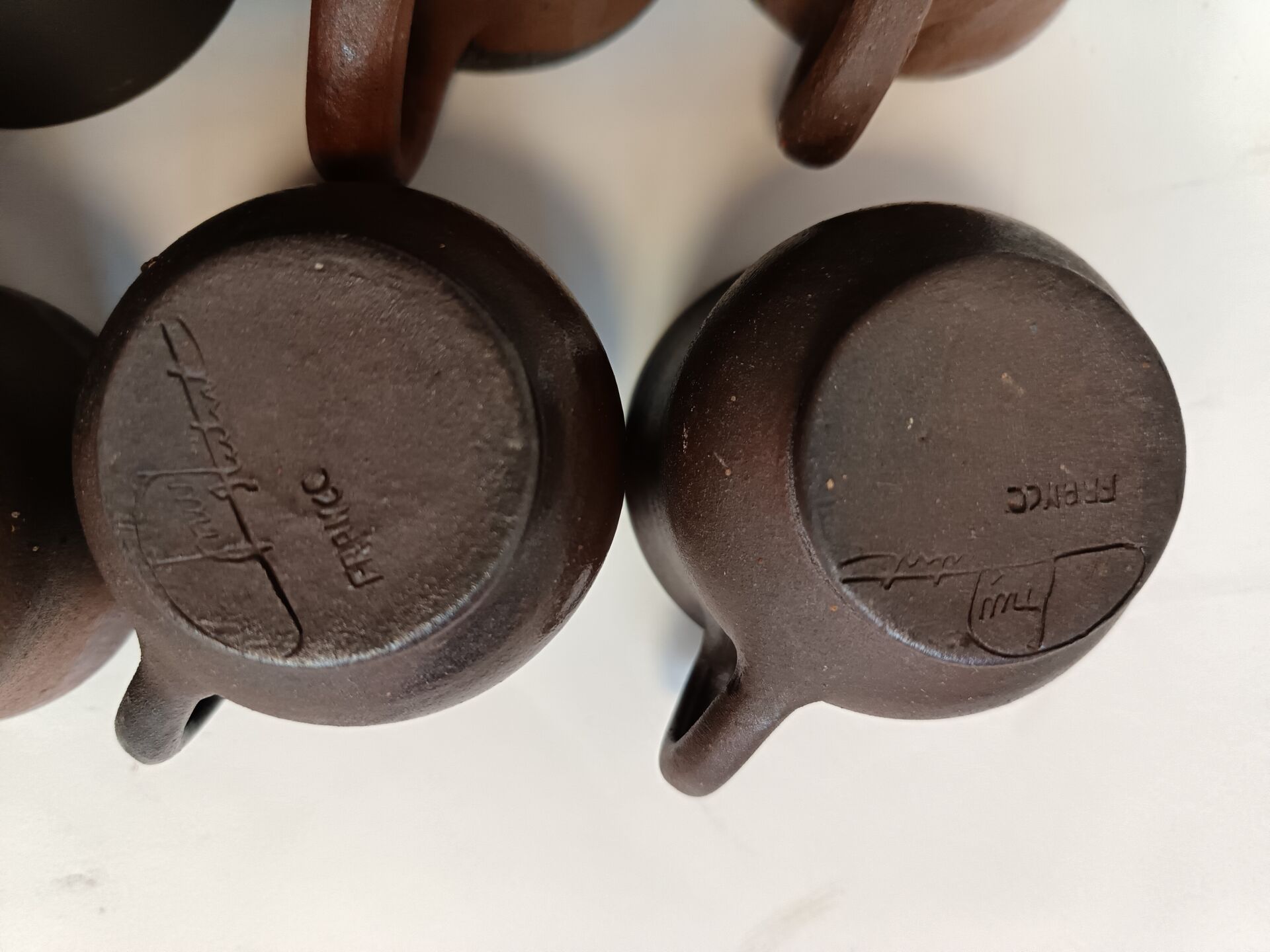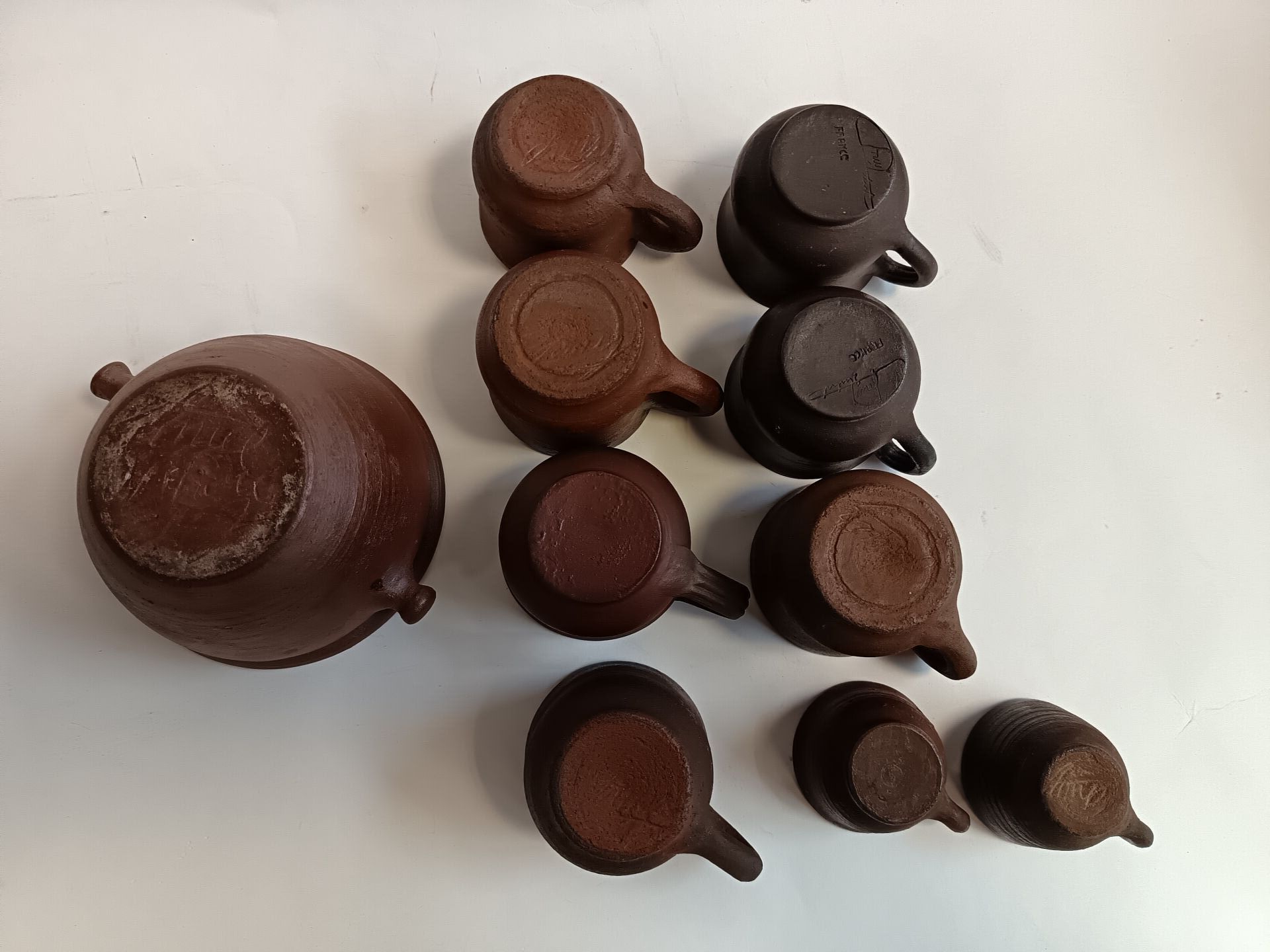 Normandie dont Néhou. Lot de neuf tasses en terre cuite. On y joint un pot couvert. Pots : H : 13 cm ; D : 15 cm Tasses : H max : 6 cm ; D max : 9,5 cm avec anse / H min : 4 cm ; D min : 7 cm avec anse