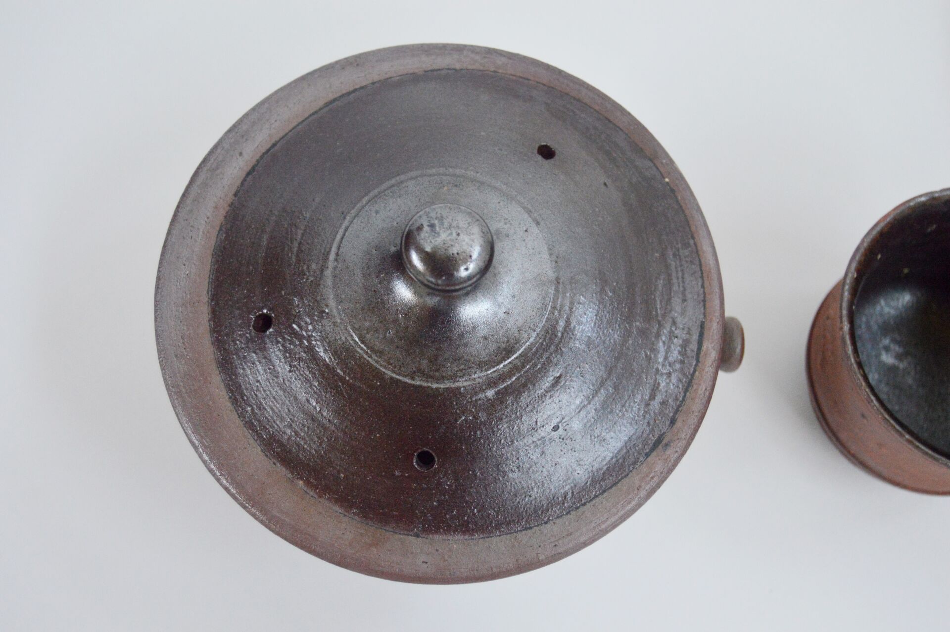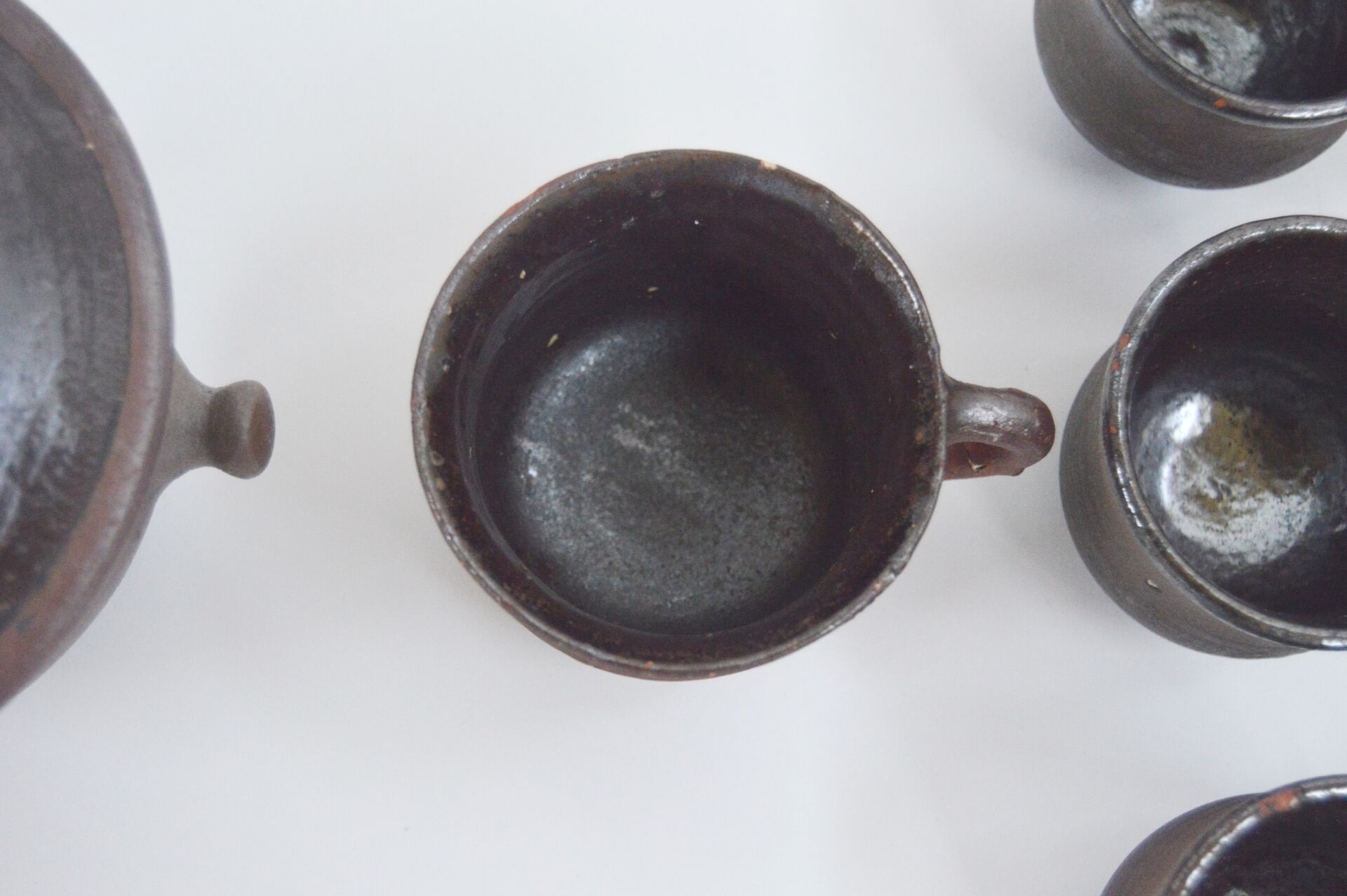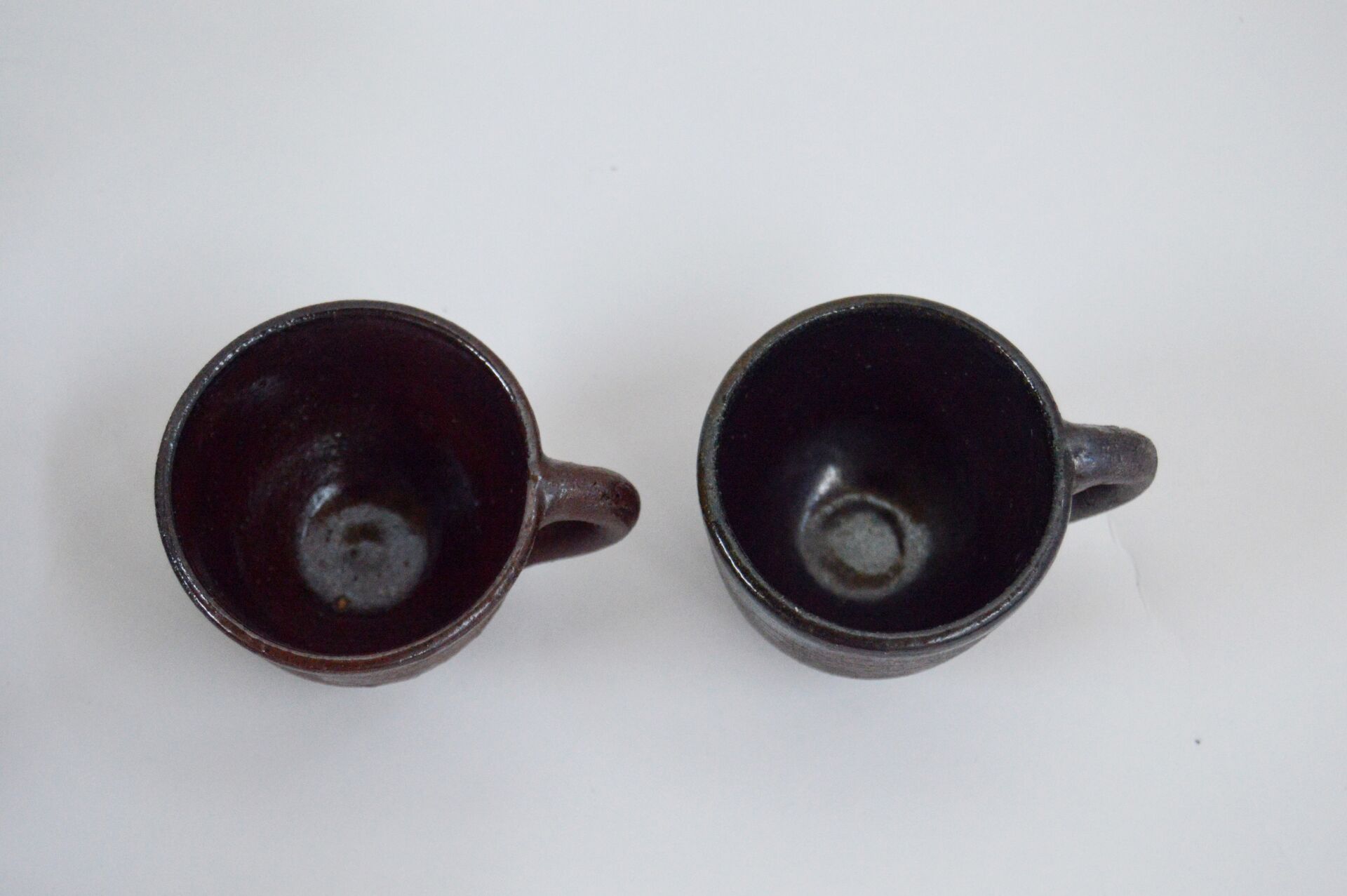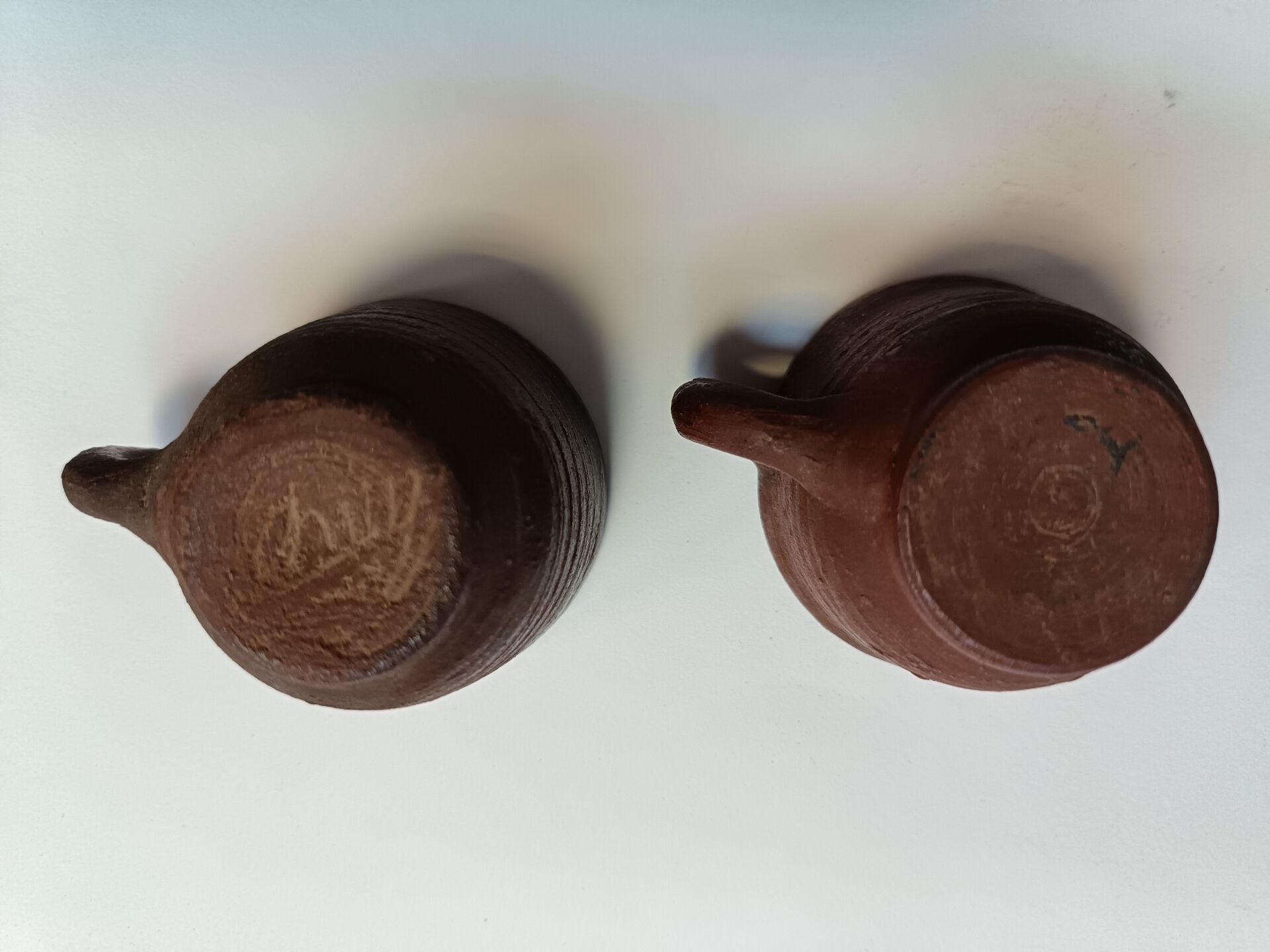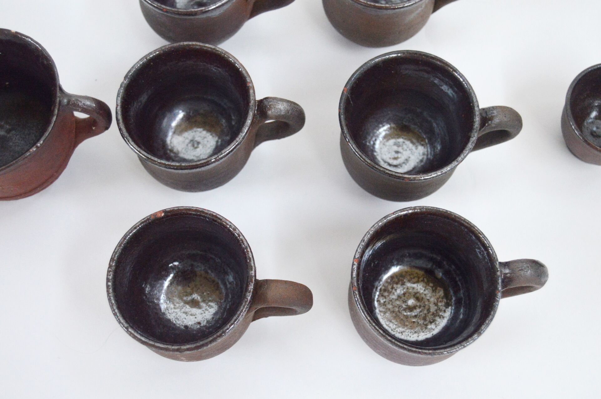 Normandie dont Néhou. Lot de neuf tasses en terre cuite. On y joint un pot couvert. Pots : H : 13 cm ; D : 15 cm Tasses : H max : 6 cm ; D max : 9,5 cm avec anse / H min : 4 cm ; D min : 7 cm avec anse
