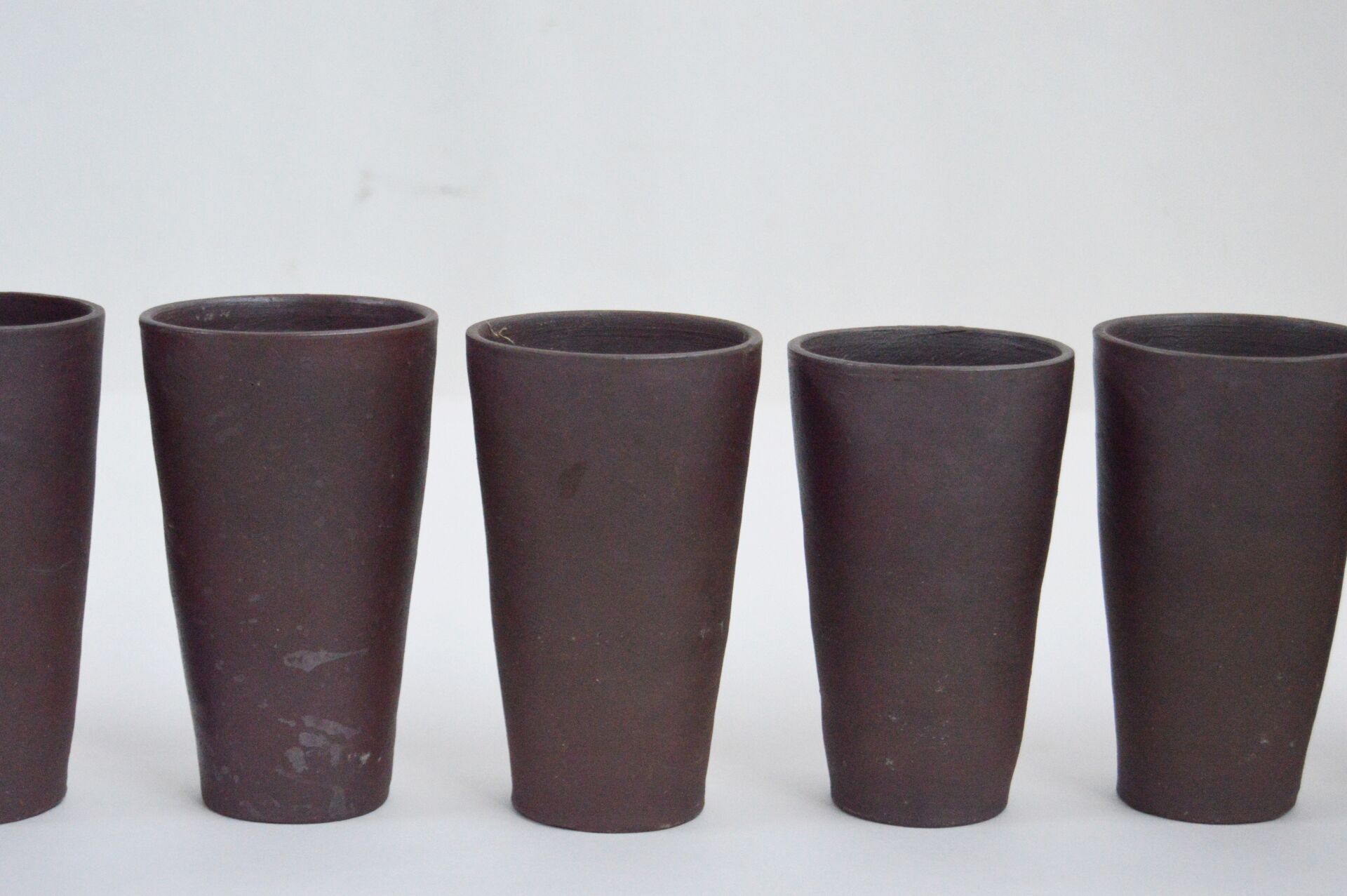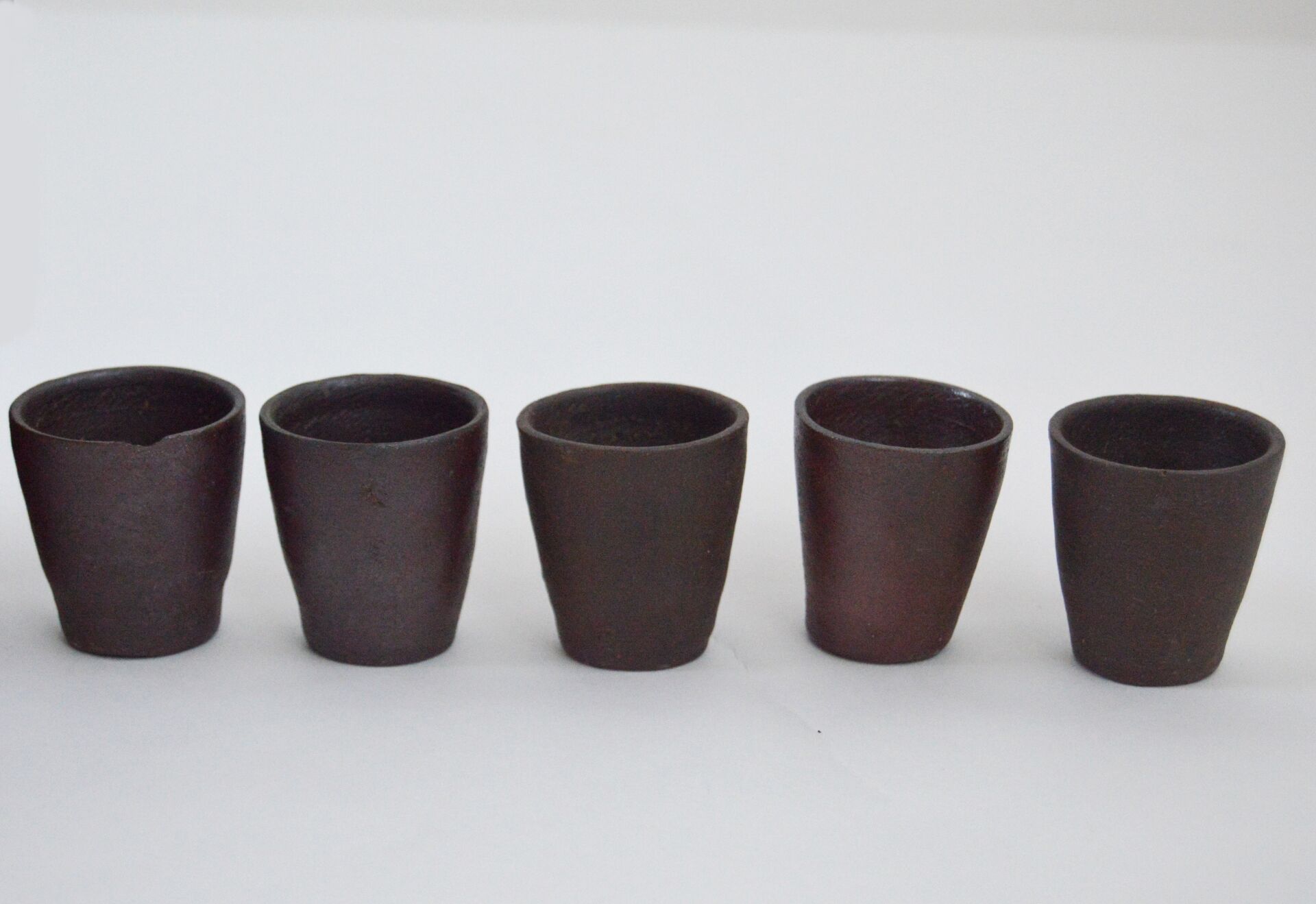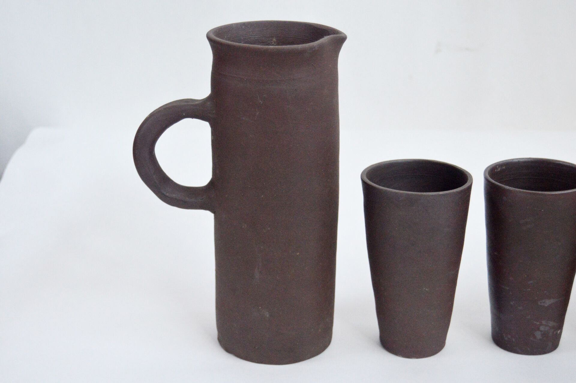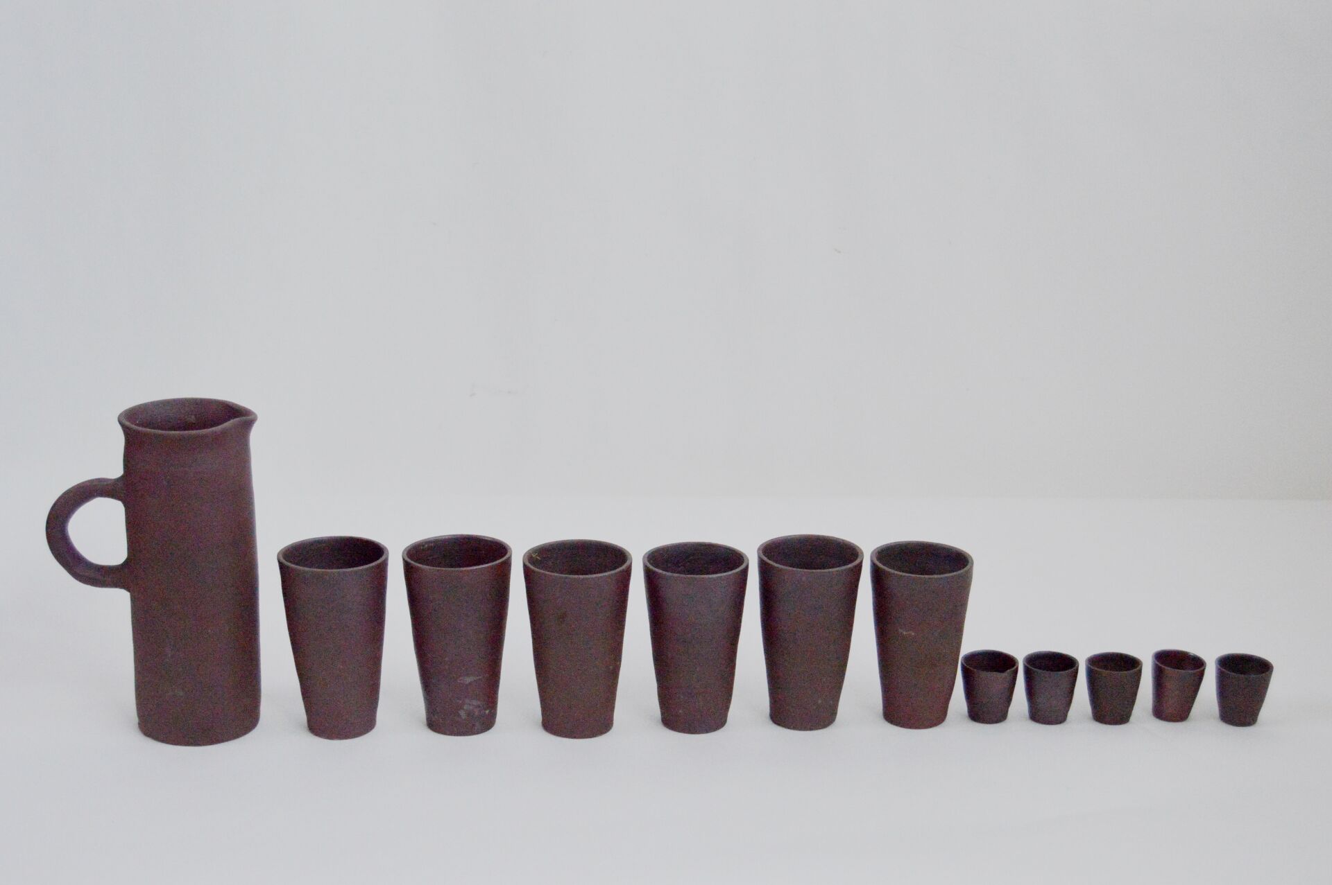 Noron La poterie. Service en terre cuite comprenant une verseuse, six gobelets et six verres à liqueur. Verseuse : H : 23,5 cm D : 9 cm (14 cm avec anse) Gobelets : H : 12,5 cm ; D : 7,5 cm Verres à liqueur : H : 4 cm ; D : 4 cm