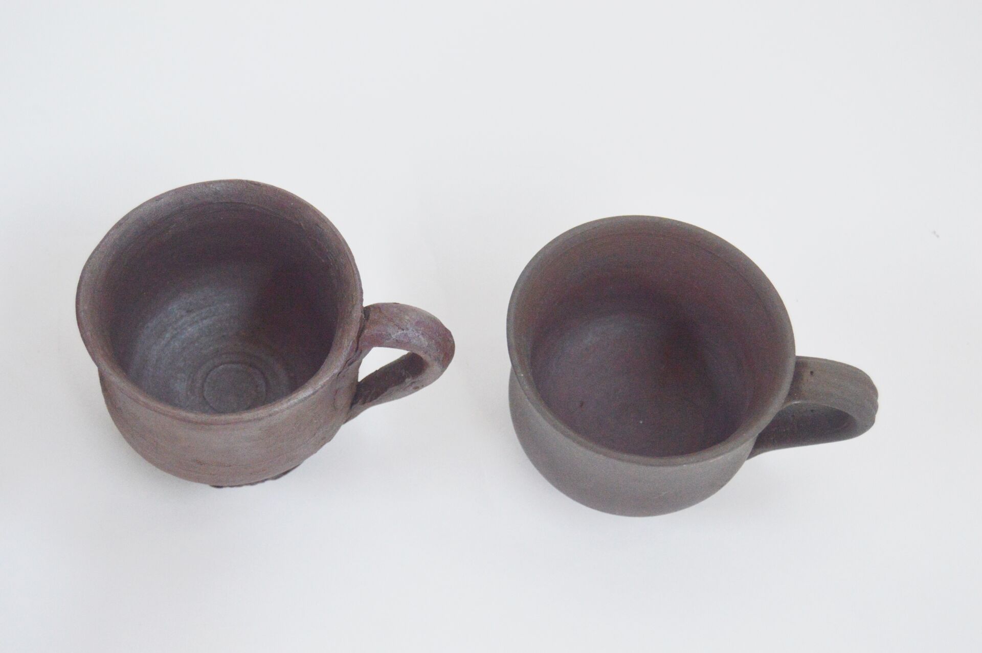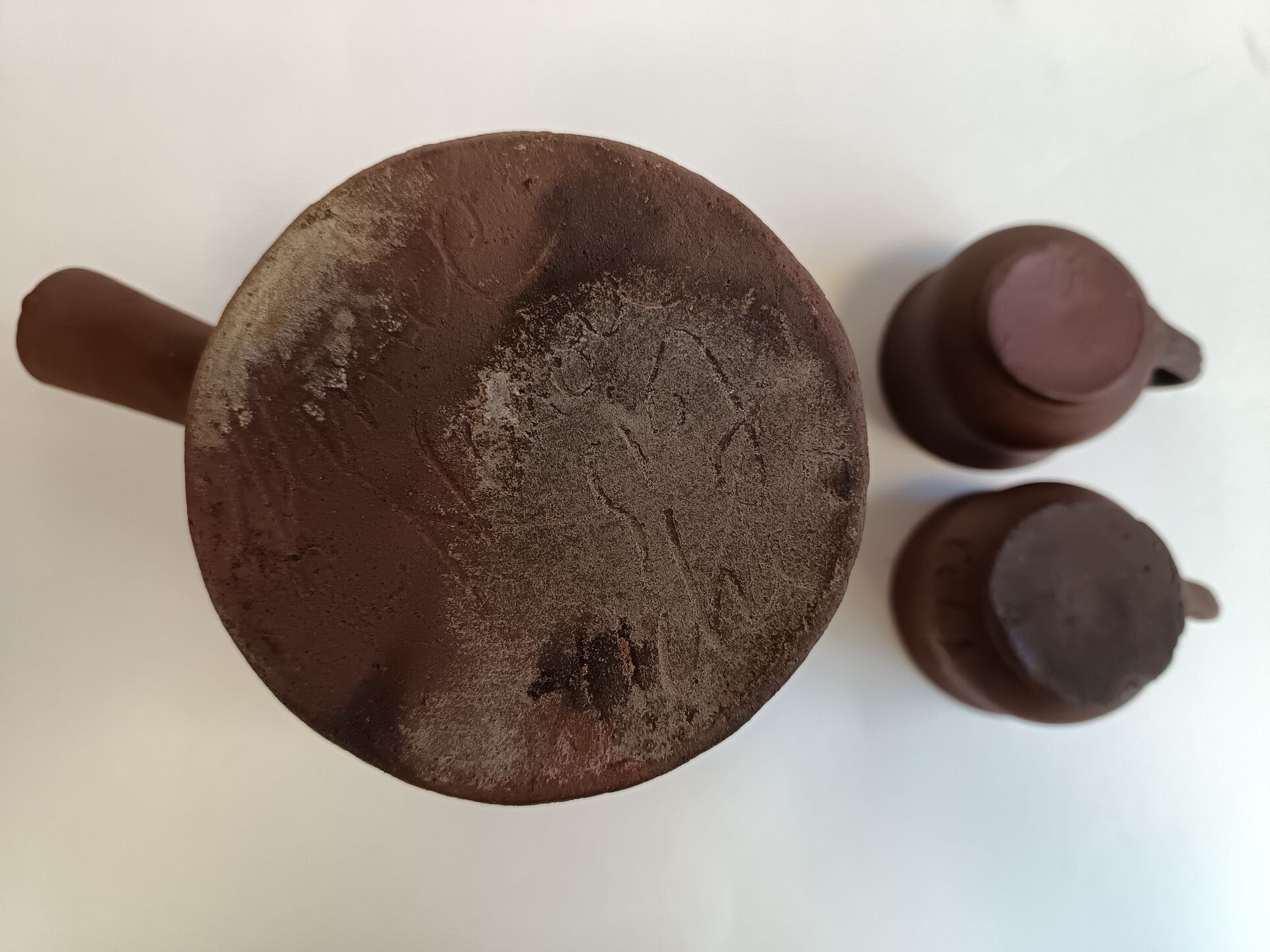 Néhou et Normandie. Théière et deux tasses en terre cuite. La théière est signée "Hamel". Théière : H : 19 cm ; D : 18 cm avec anse Tasse : H : 6 cm ; D : 7 cm (10 cm avec anse)