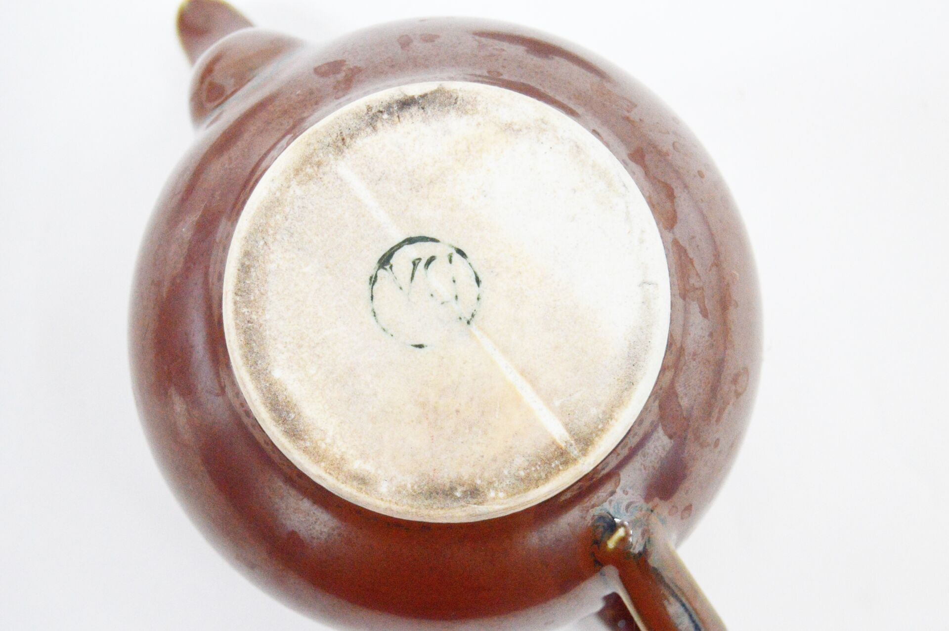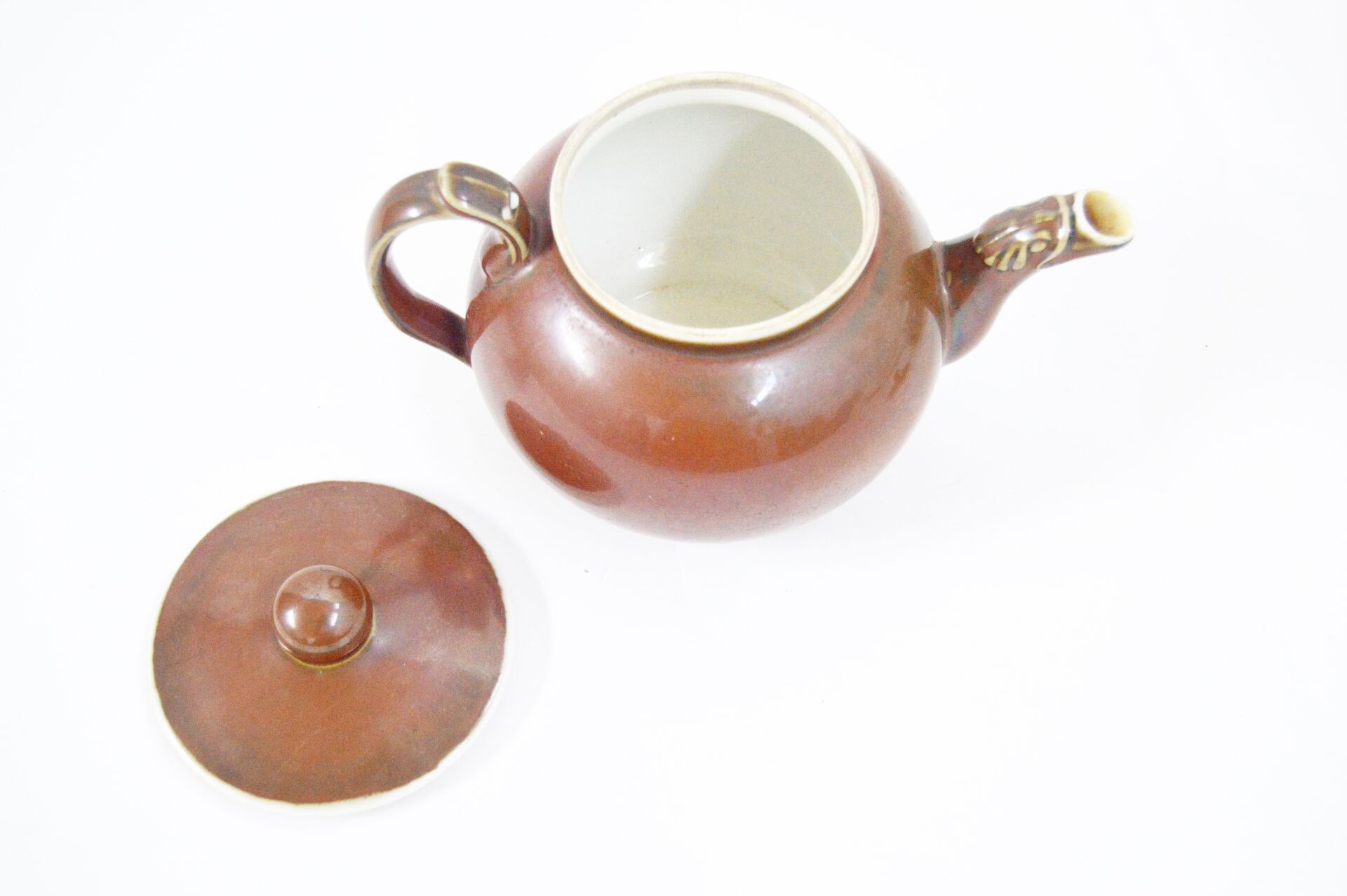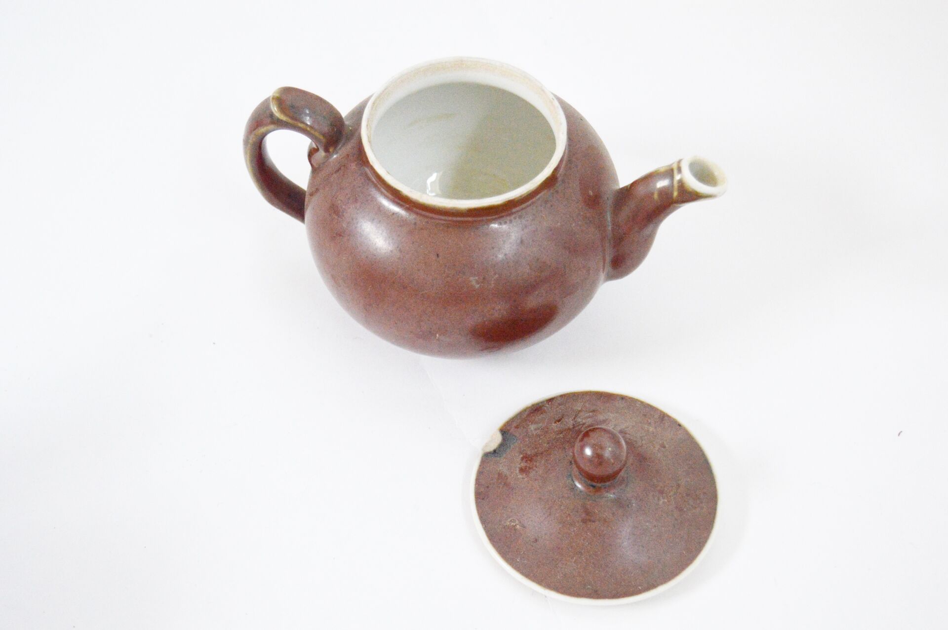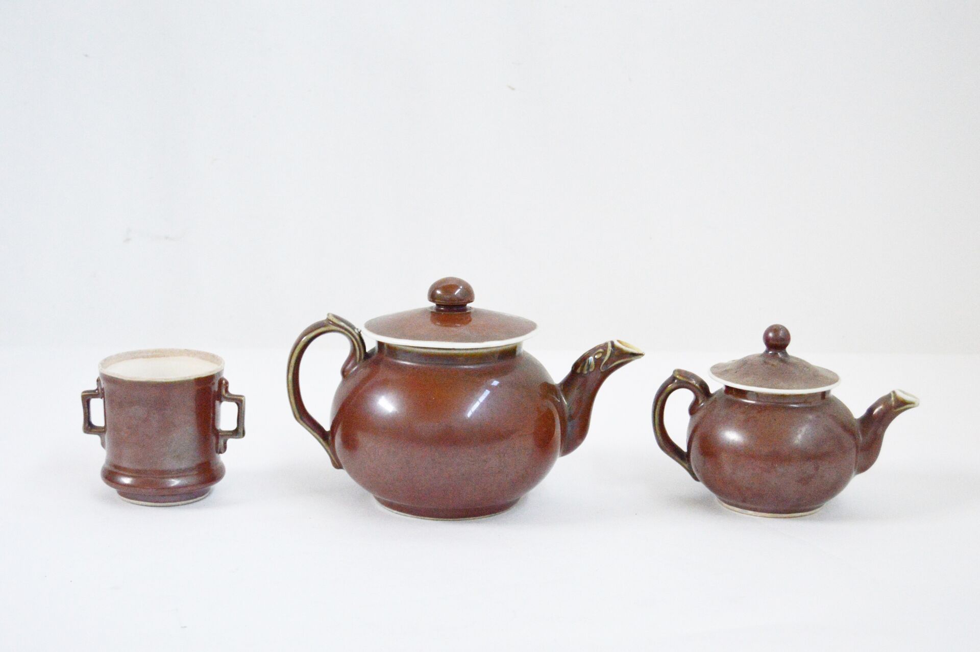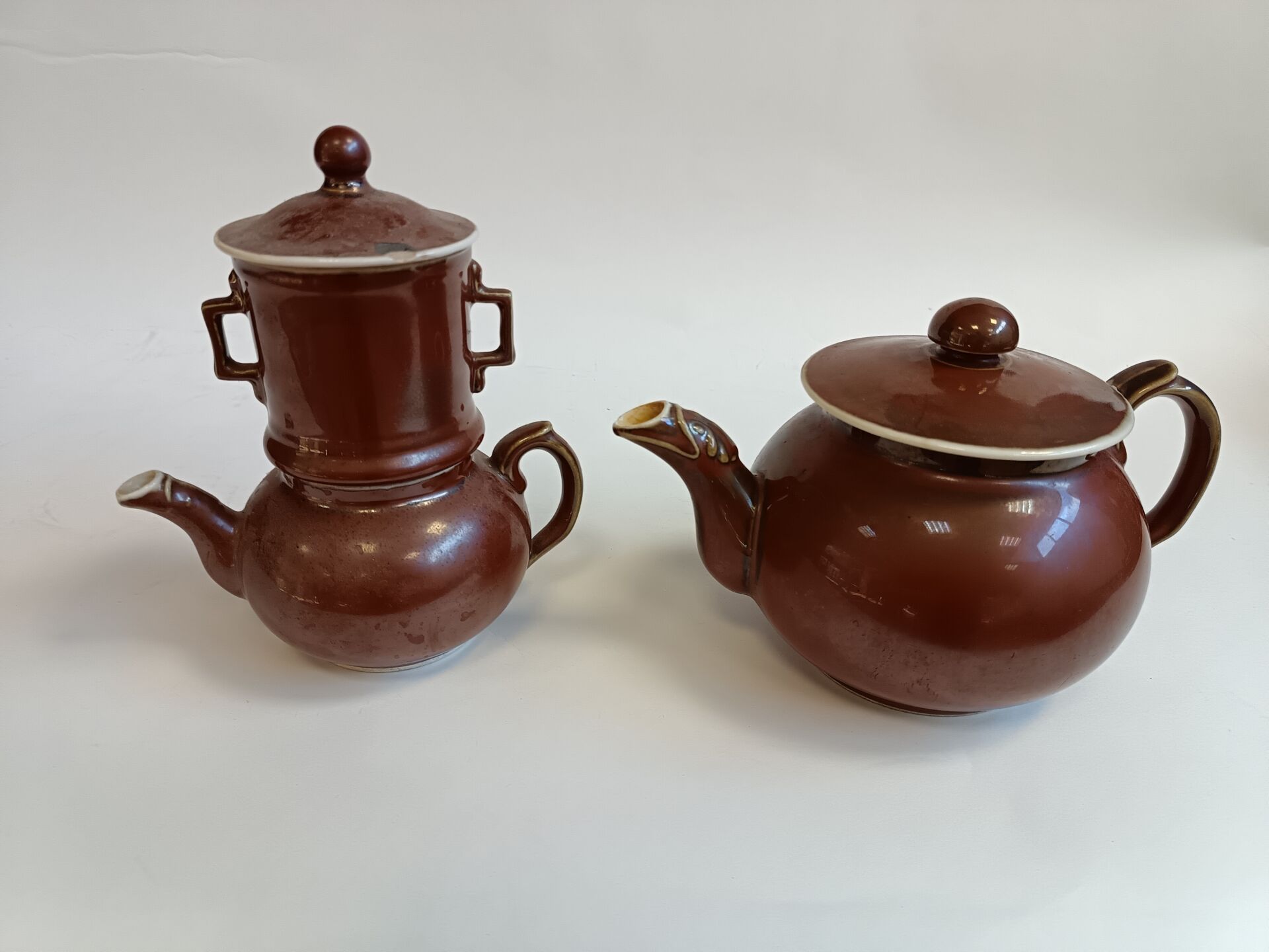 Bayeux. Lot comprenant une théière et une cafetière en porcelaine émaillée marron. Ébréchures. Théière : H : 21 cm ; D : 17 cm (avec bec et anse) Cafetière : H 16 cm ; D : 23 cm (avec bec et anse )