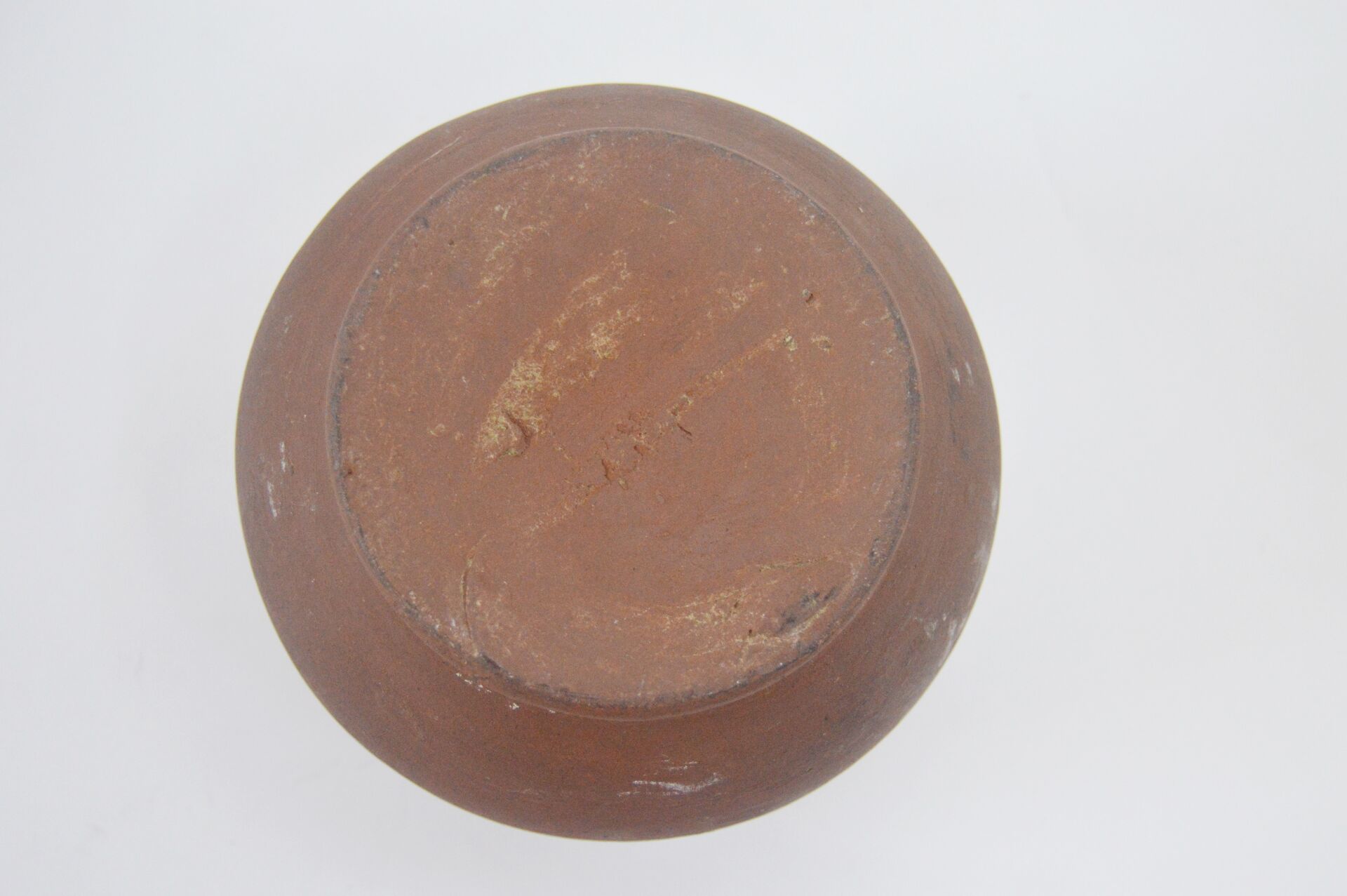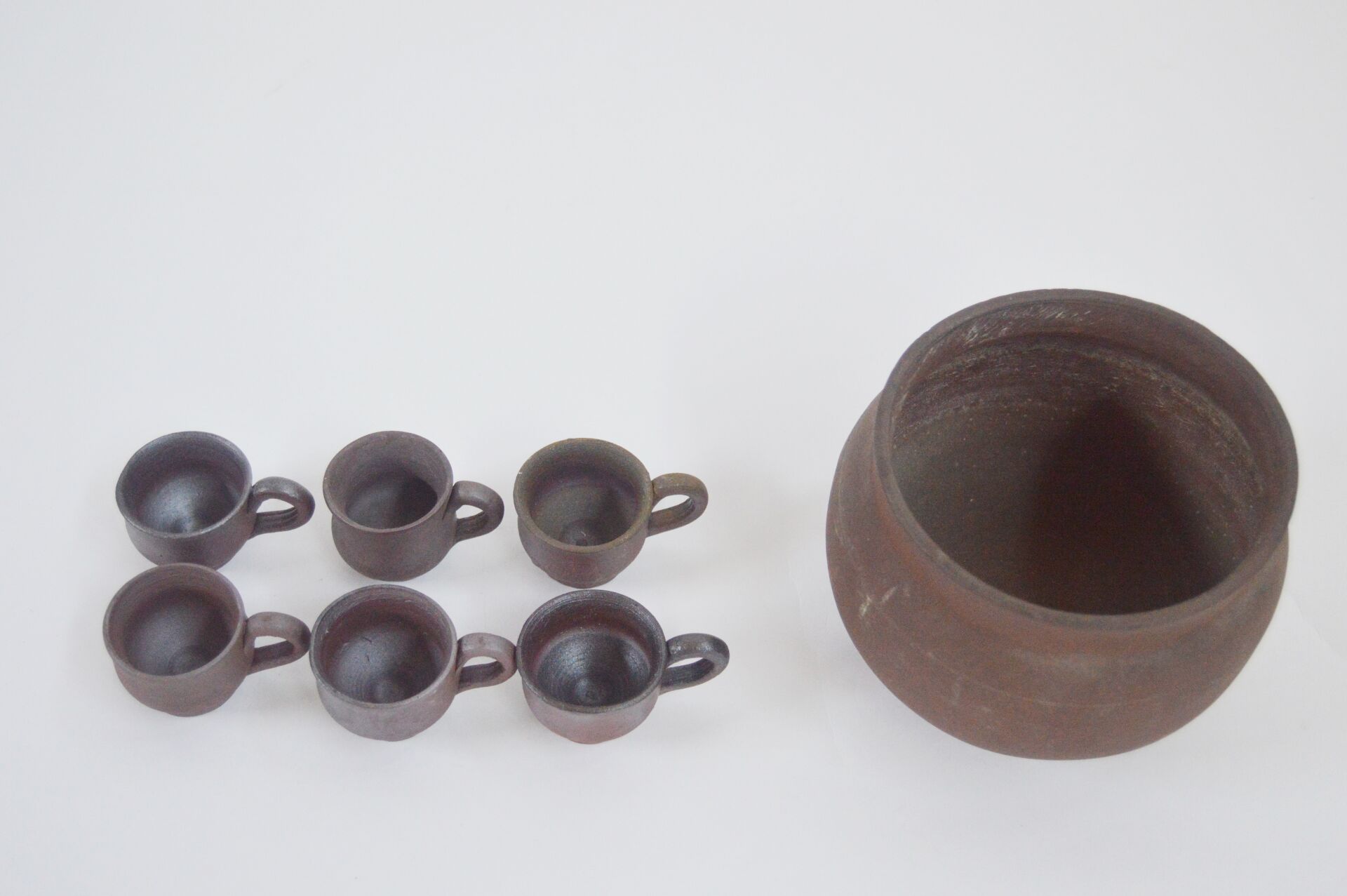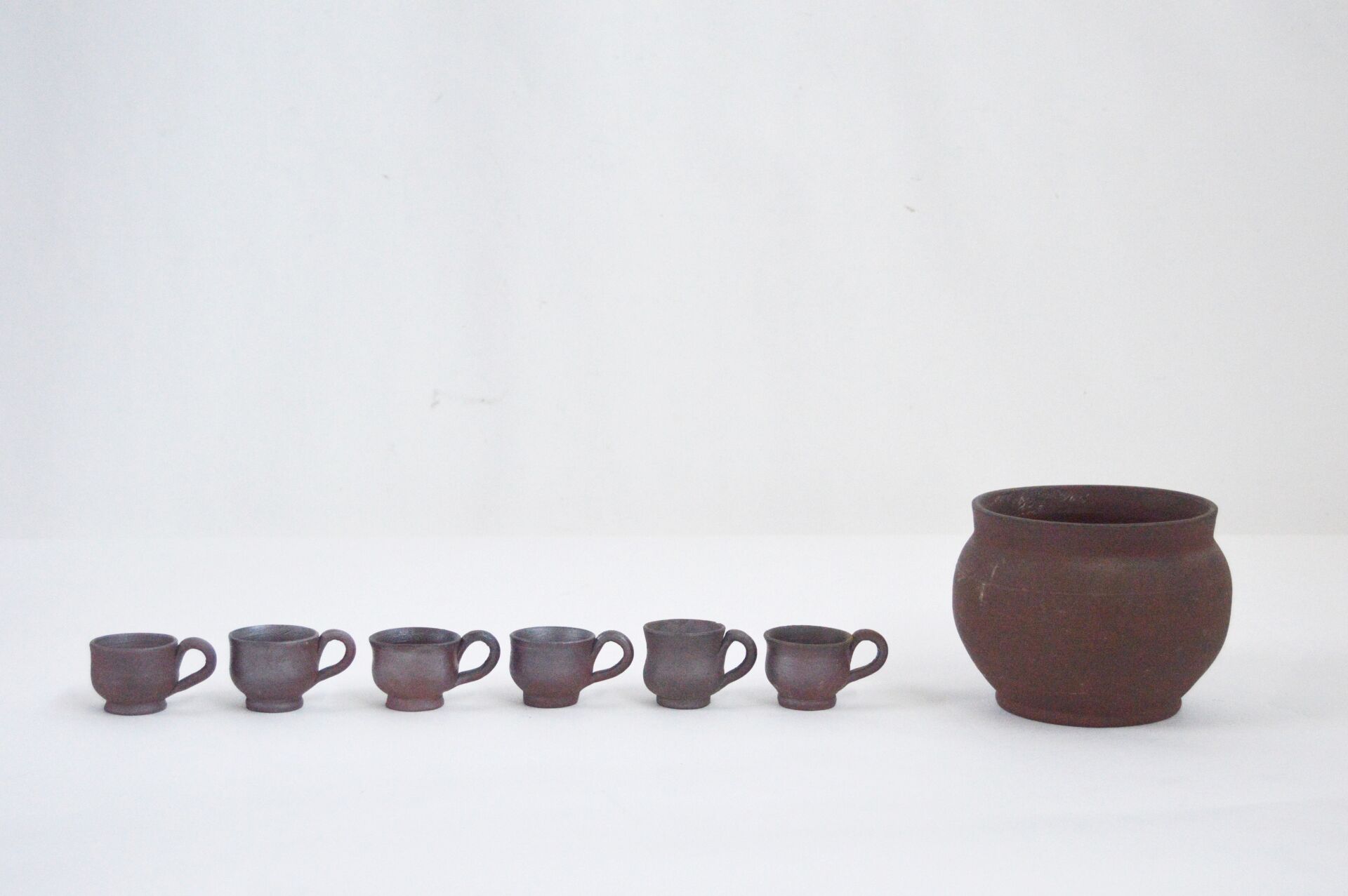 Normandie. Lot comprenant six tasses et un pot en terre cuite. Pot : H : 11 cm ; D : 15 cm Tasses : H : 3,5 cm , D : 4,5 cm (7 cm avec anse)