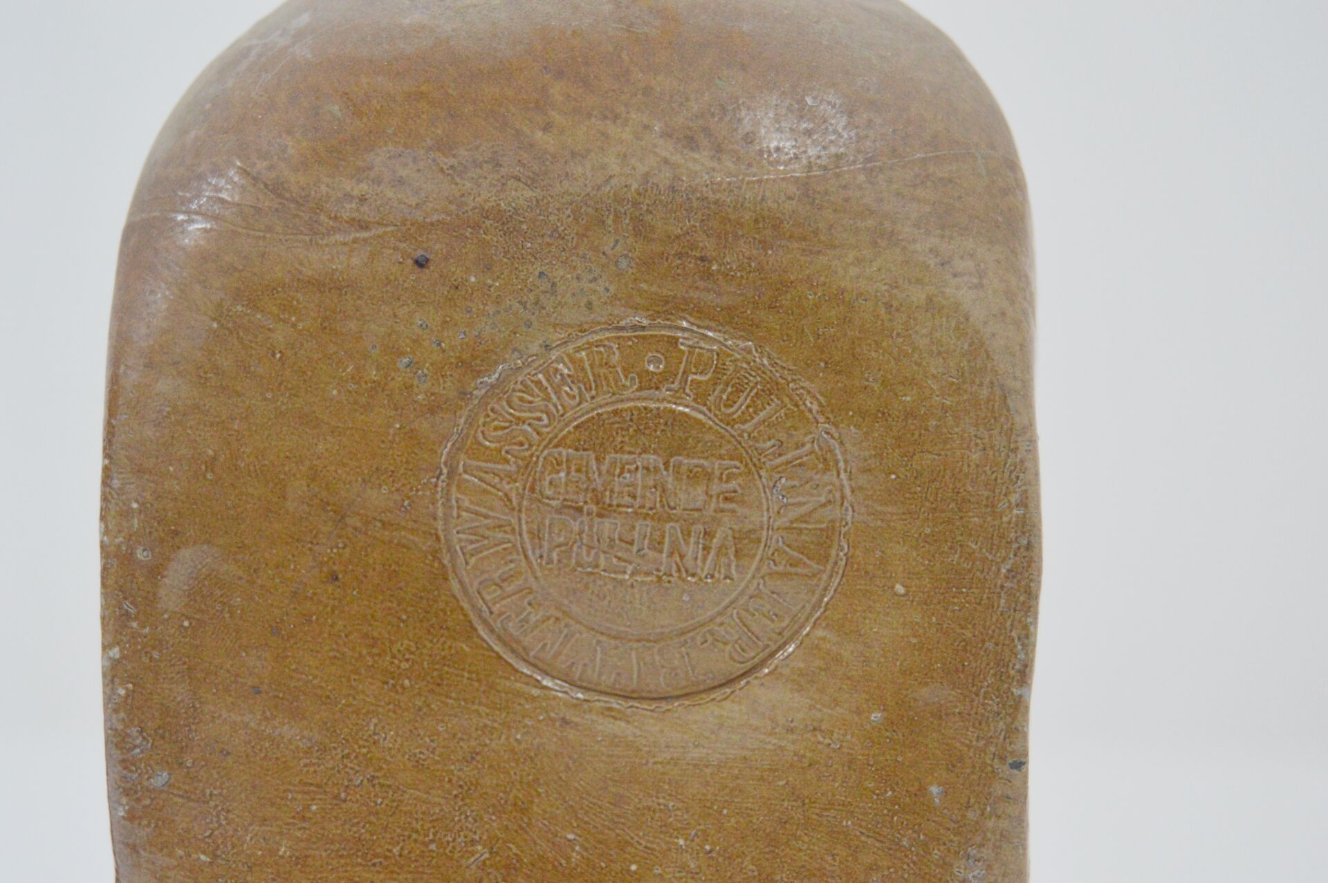 Allemagne. Bouteille en terre cuite vernissée marquée "Pullnaer Bitterwasser Gemeinede Pullna". On y joint une verseuse en terre cuite. Bouteille : H : 22 cm ; D : 12 cm Verseuse : H : 14 cm ; D : 13 cm