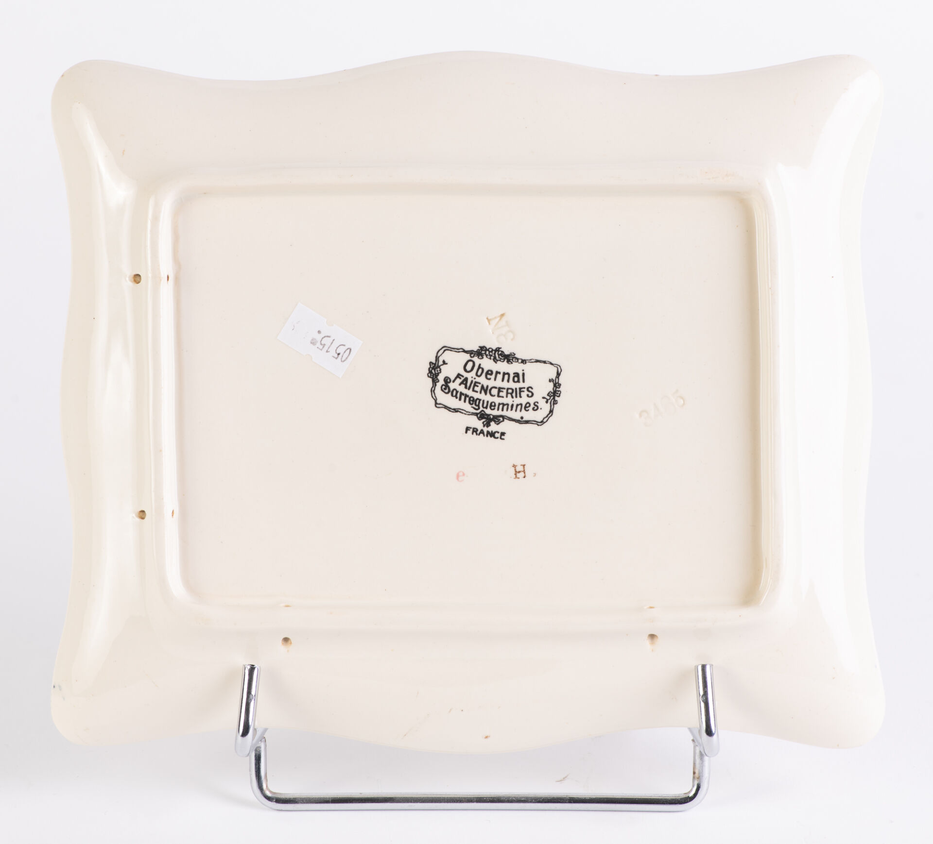 Sarreguemines. Rare cadre de présentation en faïence modèle "Obernai". Marqué au tampon et de la lettre "H" et "e", et numéroté "3465" et "N3". 19,5 cm x 22,5 cm Représenté après folle enchères.