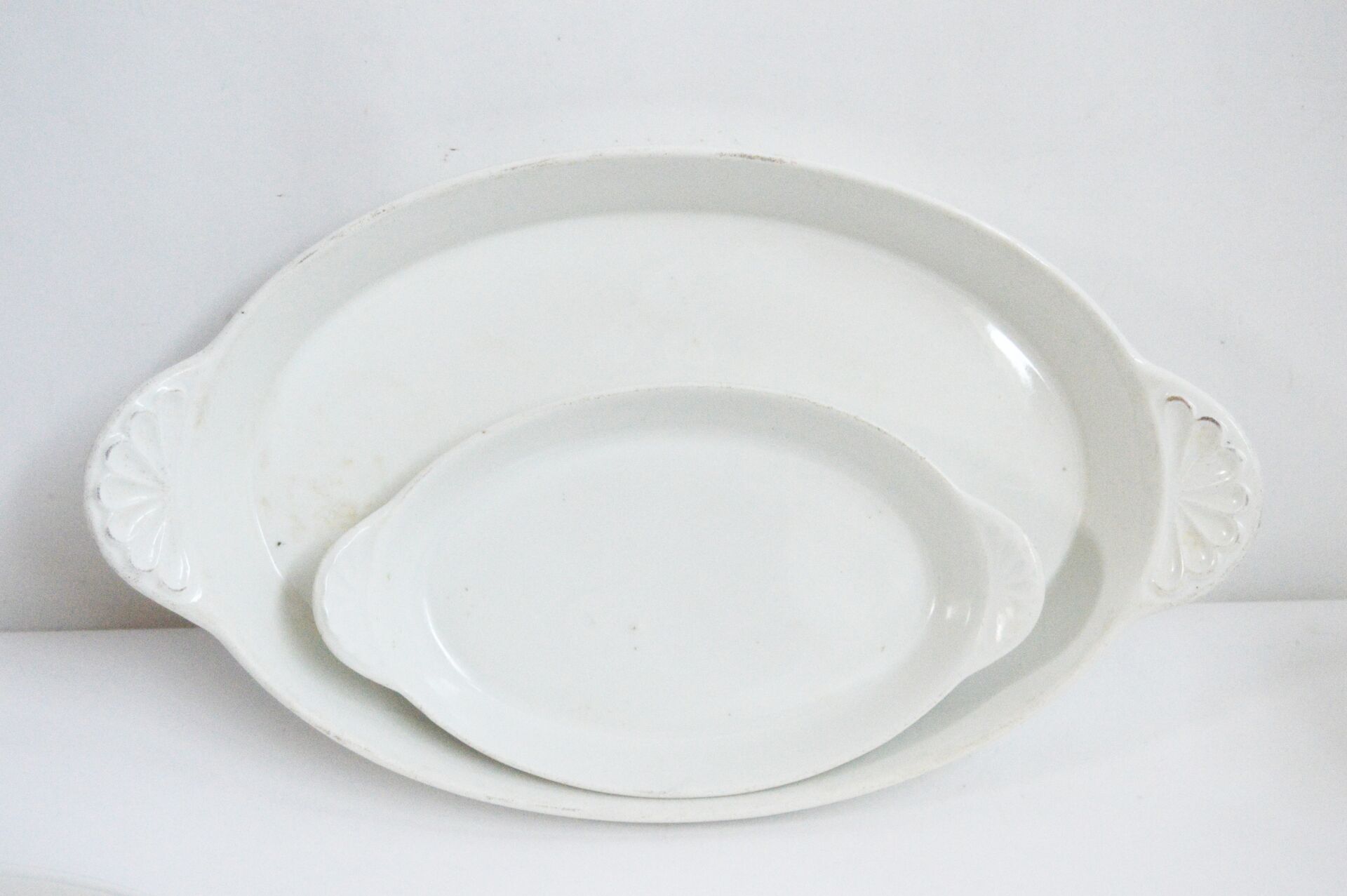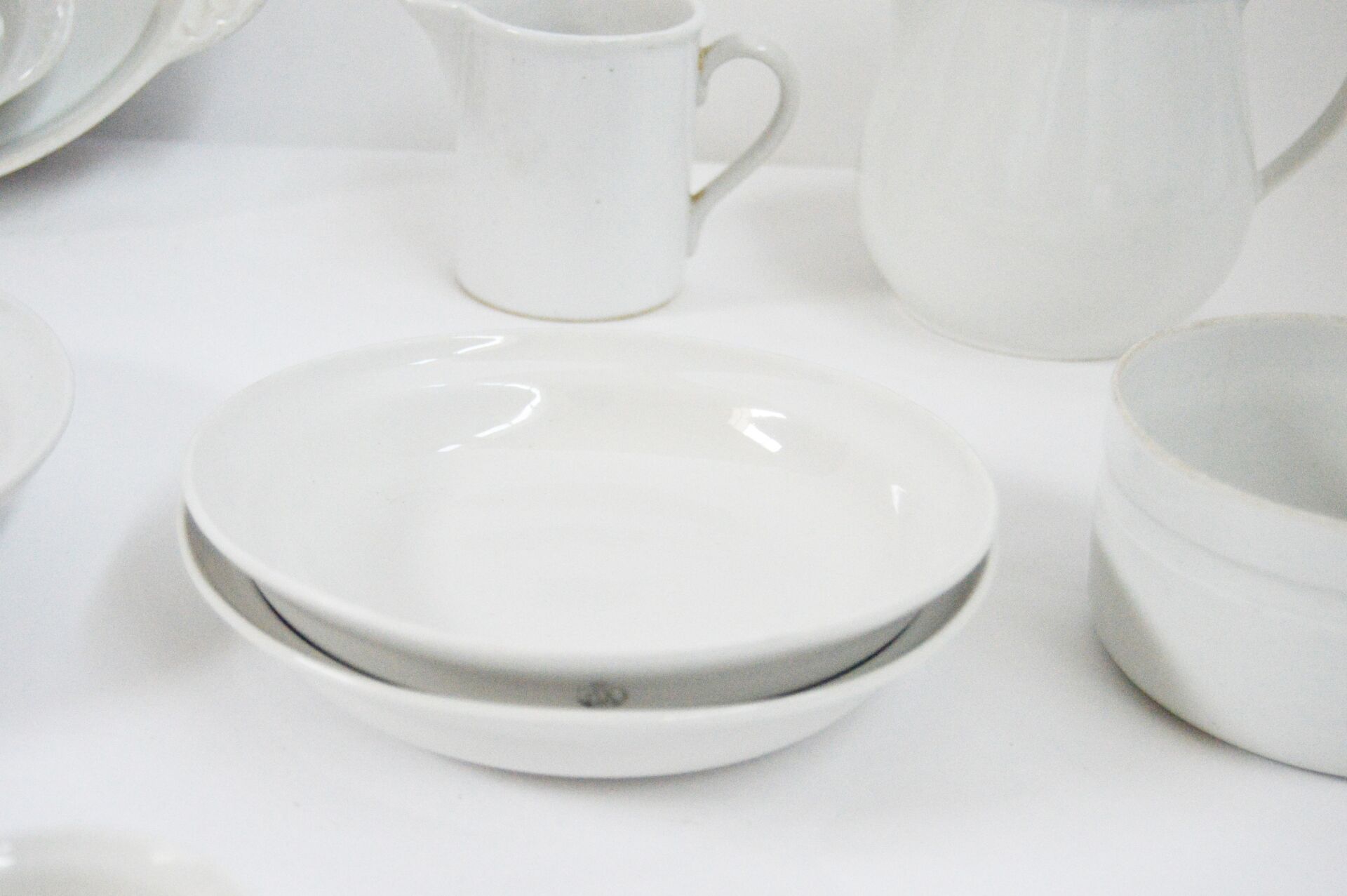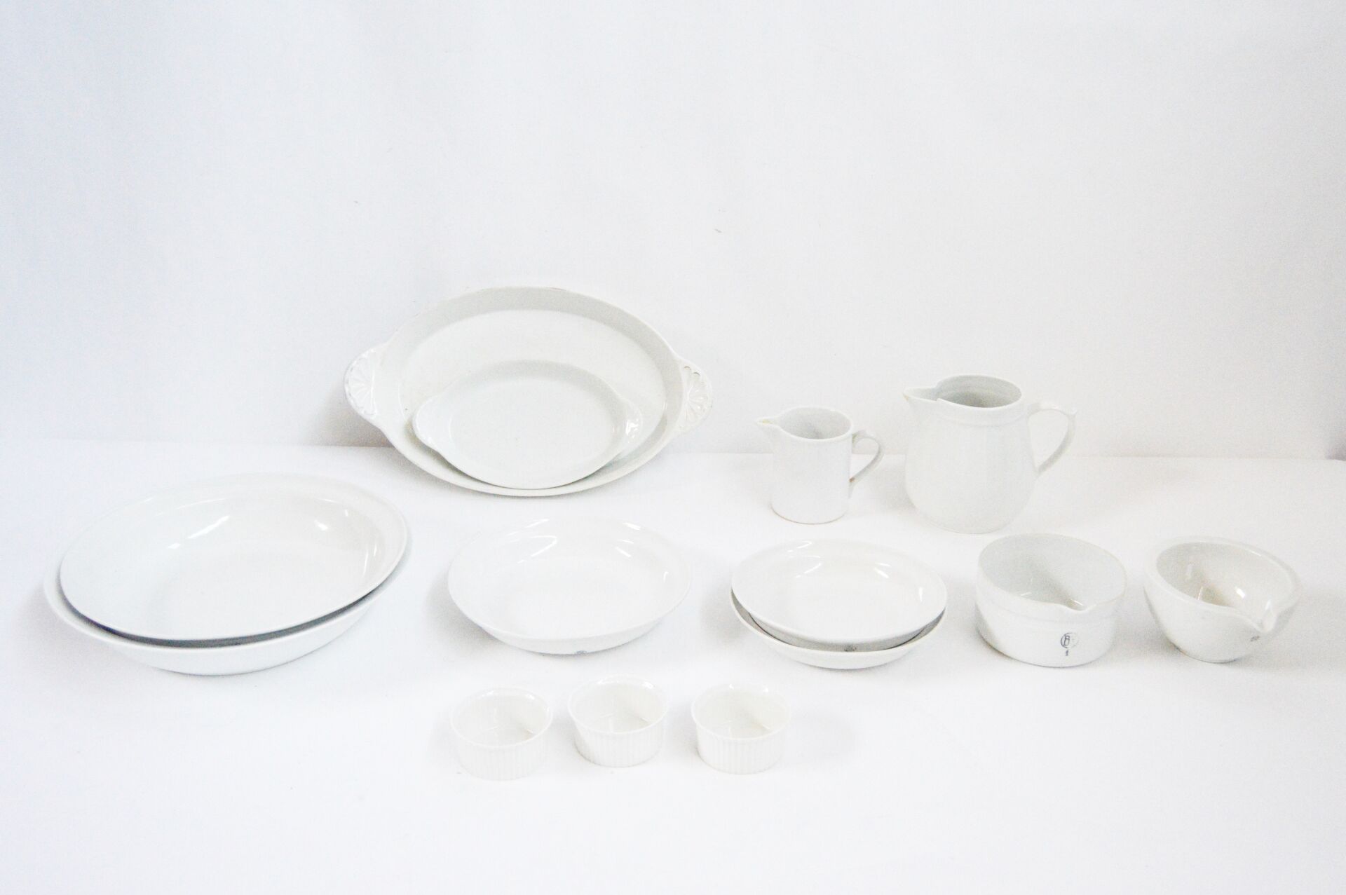 Bayeux. Lot de porcelaine émaillée blanche. 2 Plats : H : 4 cm ; L : 36 cm ; l : 21 cm H : 3 cm ; L : 23 cm ; l : 13 cm 2 plats creux: H : 5,5 cm ; D : 30 cm H : 5 ,5 cm ; D : 28 cm Ramequins : H : 3,5 cm ; D : 7,5cm 2 bols verseurs : H :7 cm , D : 12,5 cm Assiettes creuses : H max : 4 cm ; D max : 20 cm (la grande est ébréchée) 2 pichets : H max : 14 cm ; D max : 16 cm