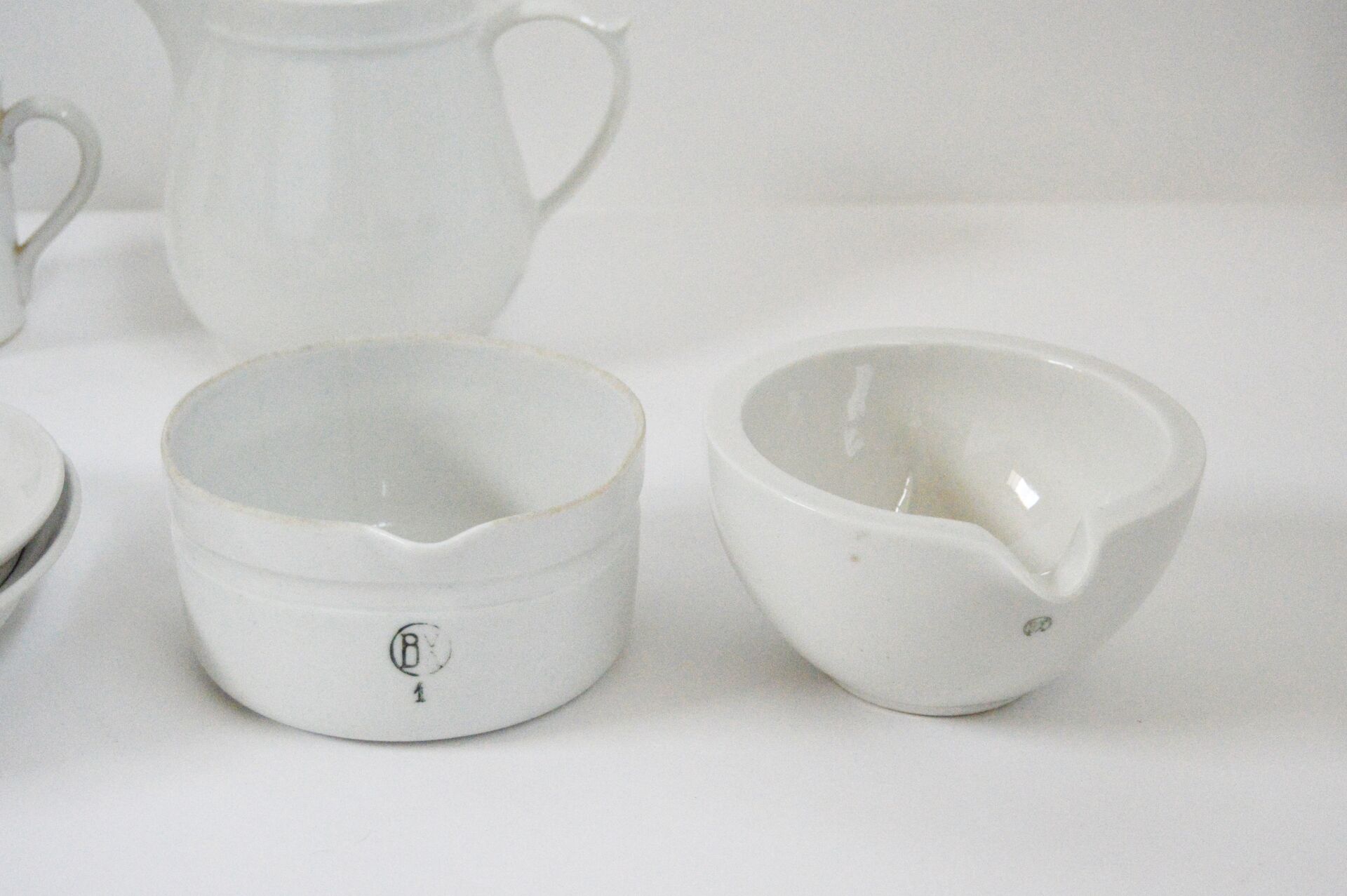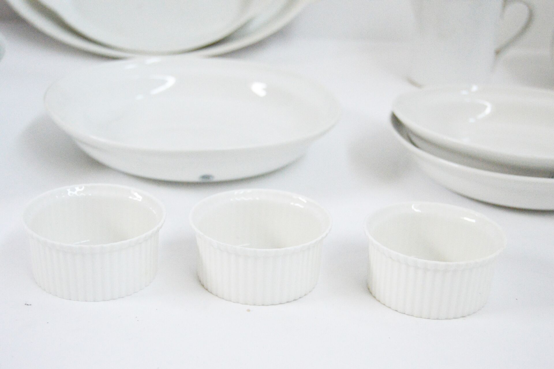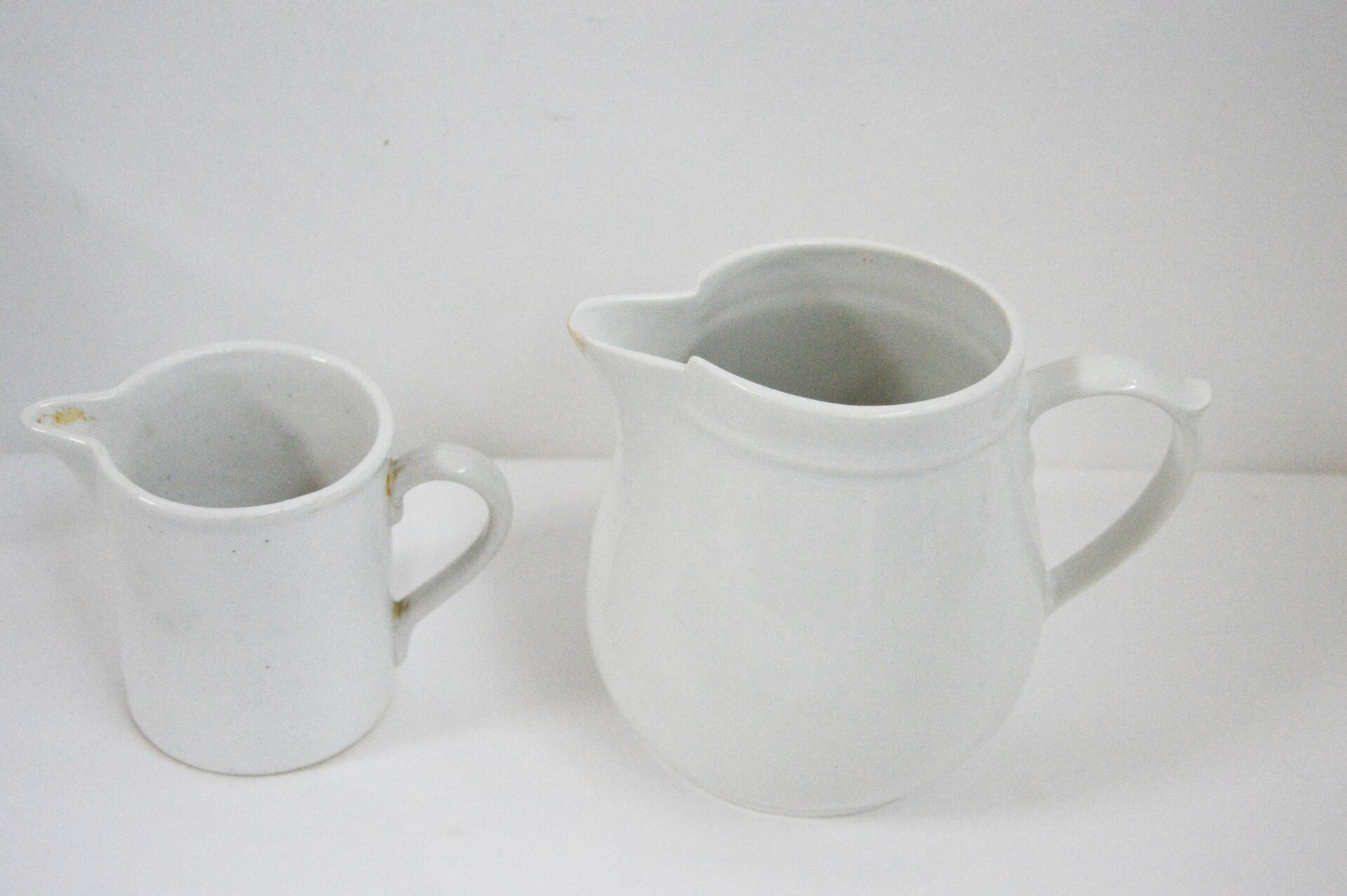 Bayeux. Lot de porcelaine émaillée blanche. 2 Plats : H : 4 cm ; L : 36 cm ; l : 21 cm H : 3 cm ; L : 23 cm ; l : 13 cm 2 plats creux: H : 5,5 cm ; D : 30 cm H : 5 ,5 cm ; D : 28 cm Ramequins : H : 3,5 cm ; D : 7,5cm 2 bols verseurs : H :7 cm , D : 12,5 cm Assiettes creuses : H max : 4 cm ; D max : 20 cm (la grande est ébréchée) 2 pichets : H max : 14 cm ; D max : 16 cm