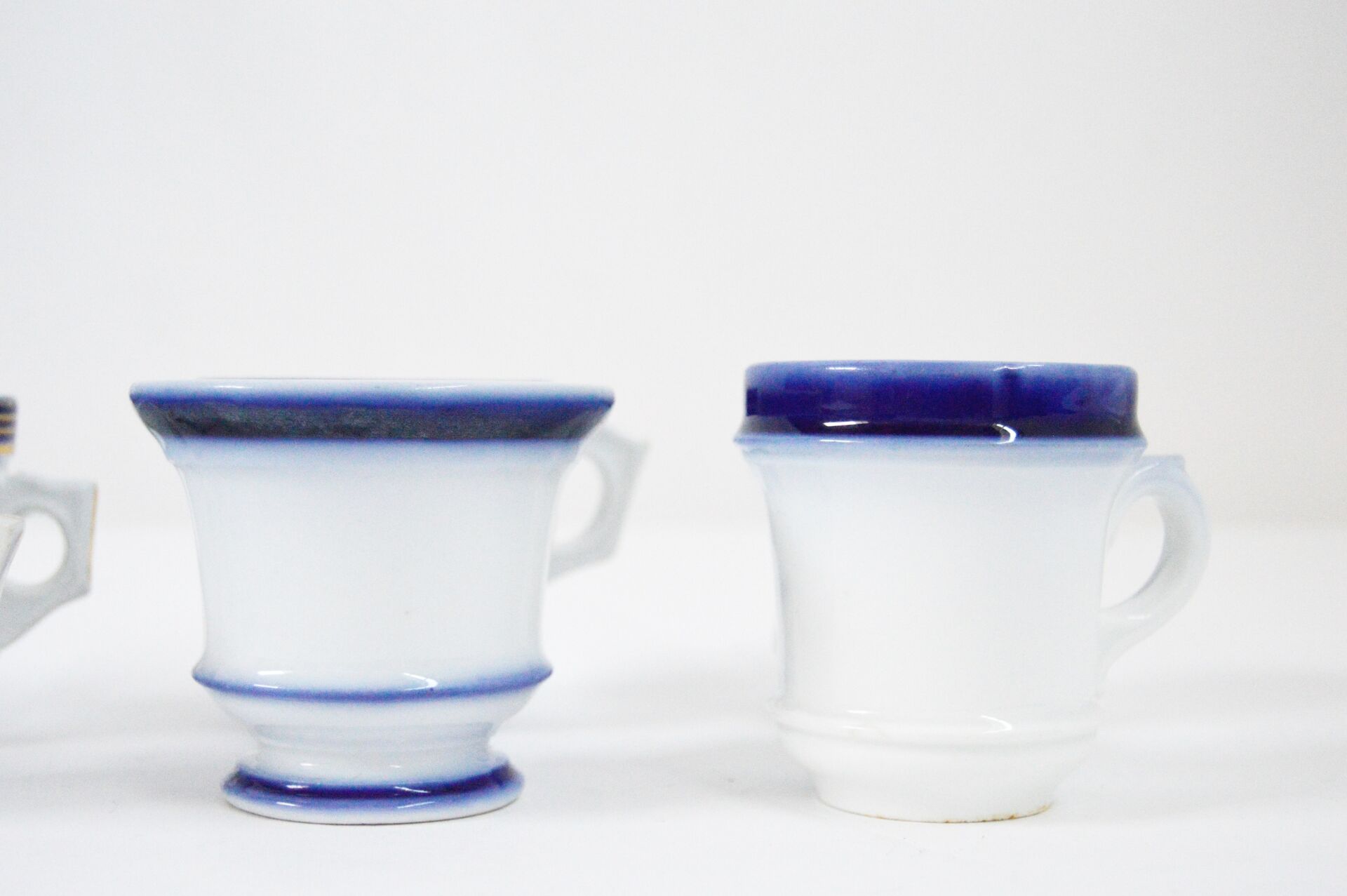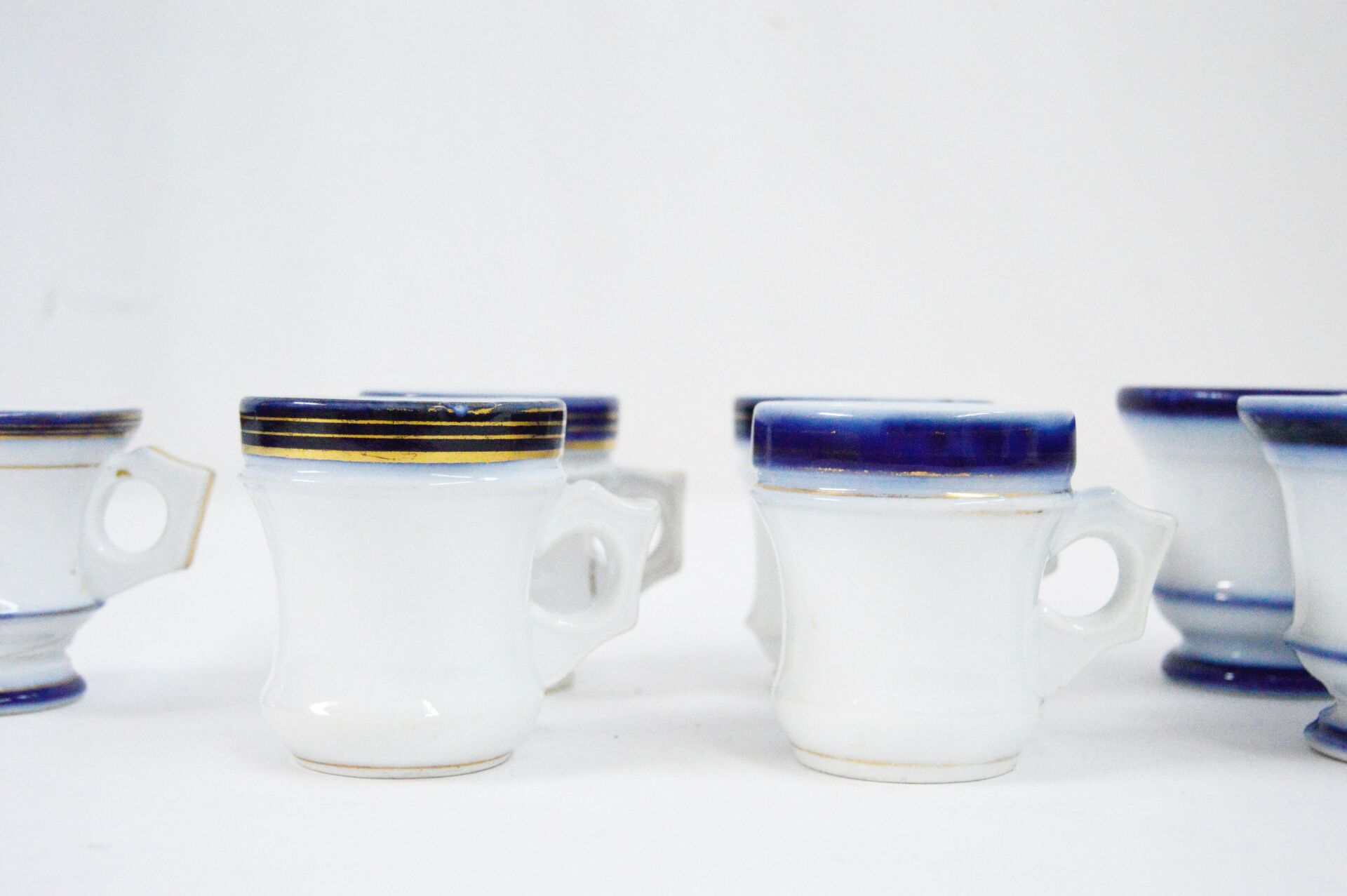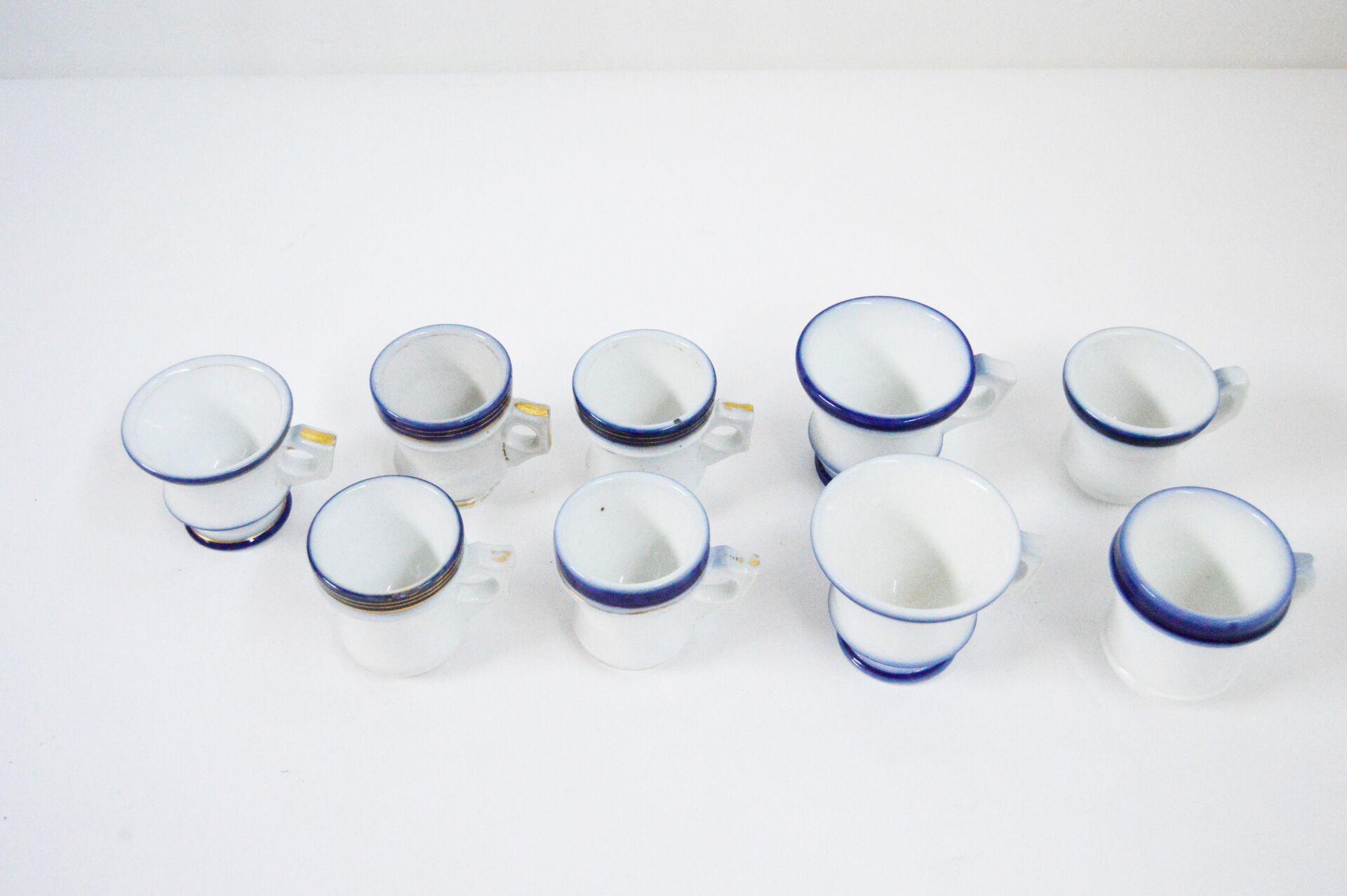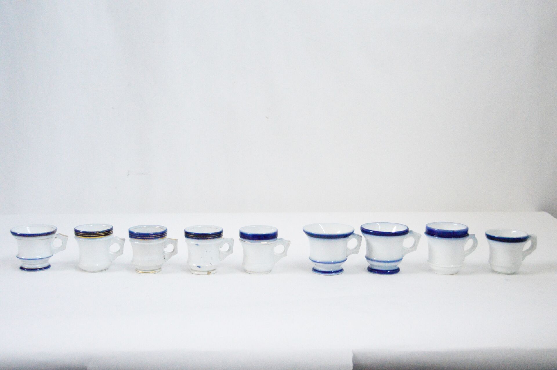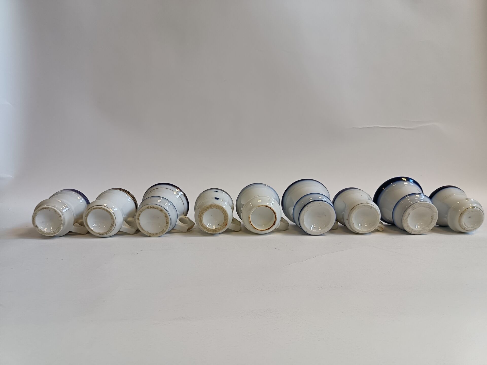 Bayeux. Lot de neuf tasses en porcelaine émaillée blanche et bleue H max : 8,5 cm ; H min : 7 cm D max : 9 cm ; D min : 7 cm