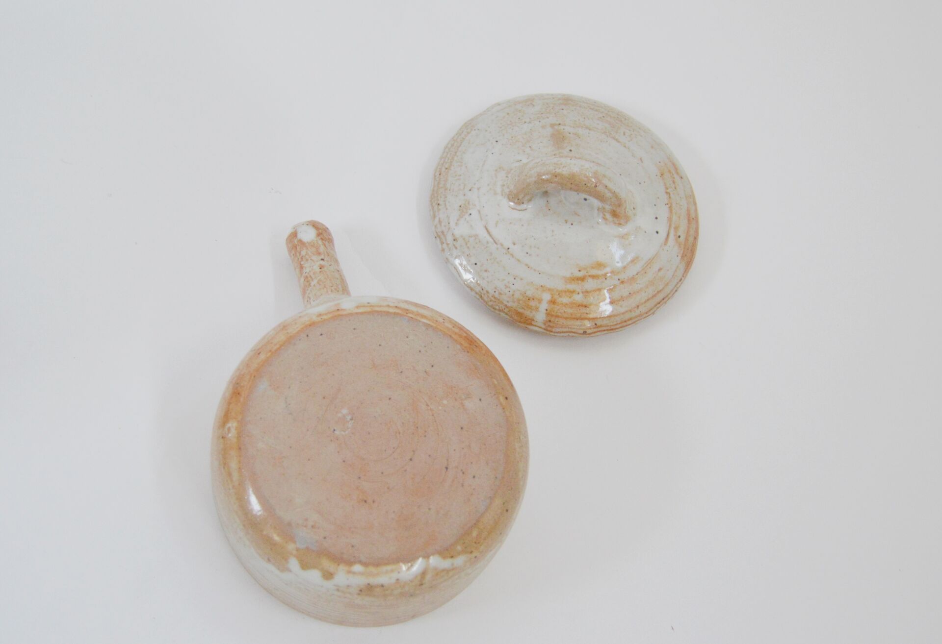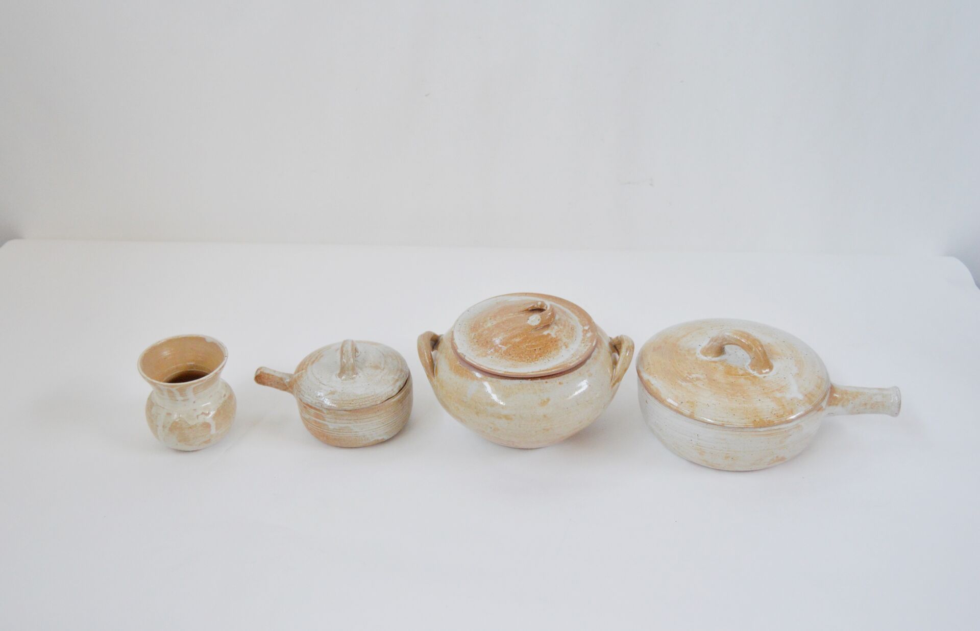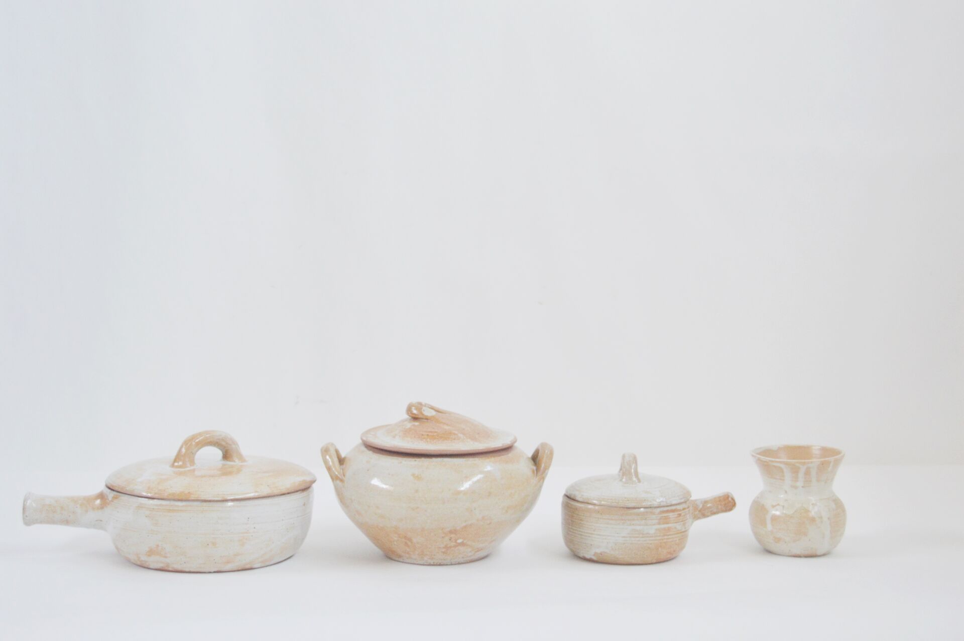 Lot de grès comprenant deux caquelons, un vase et une soupière. Grand caquelon : H : 16 cm ; D : 22 cm (29 cm avec queue) Petit caquelon : H : 10 cm ; D : 13 cm (18 cm avec queue) Vase : H : 11,5 cm ; D : 10 cm Soupière : H : 19 cm ; D : 25 cm