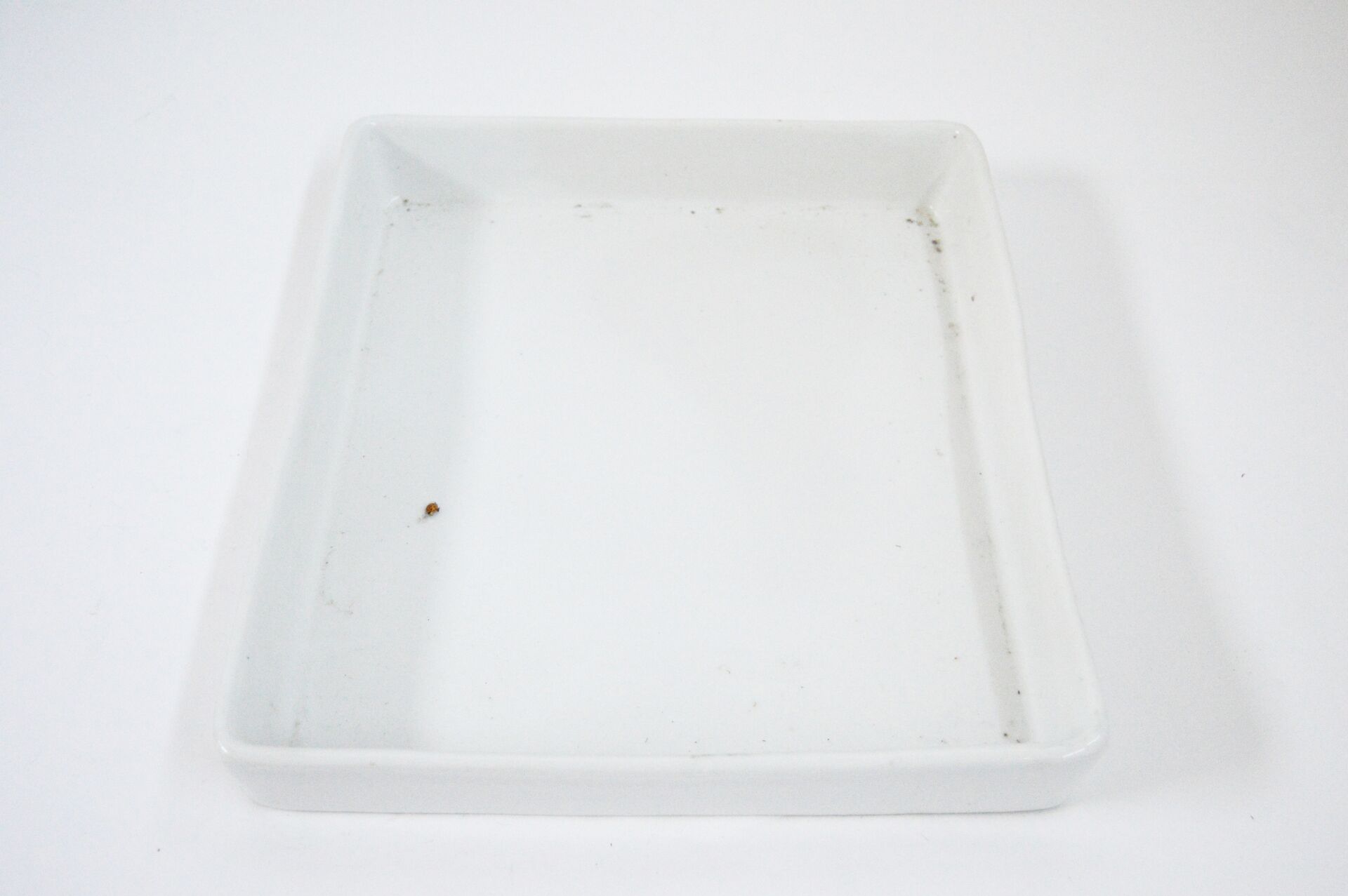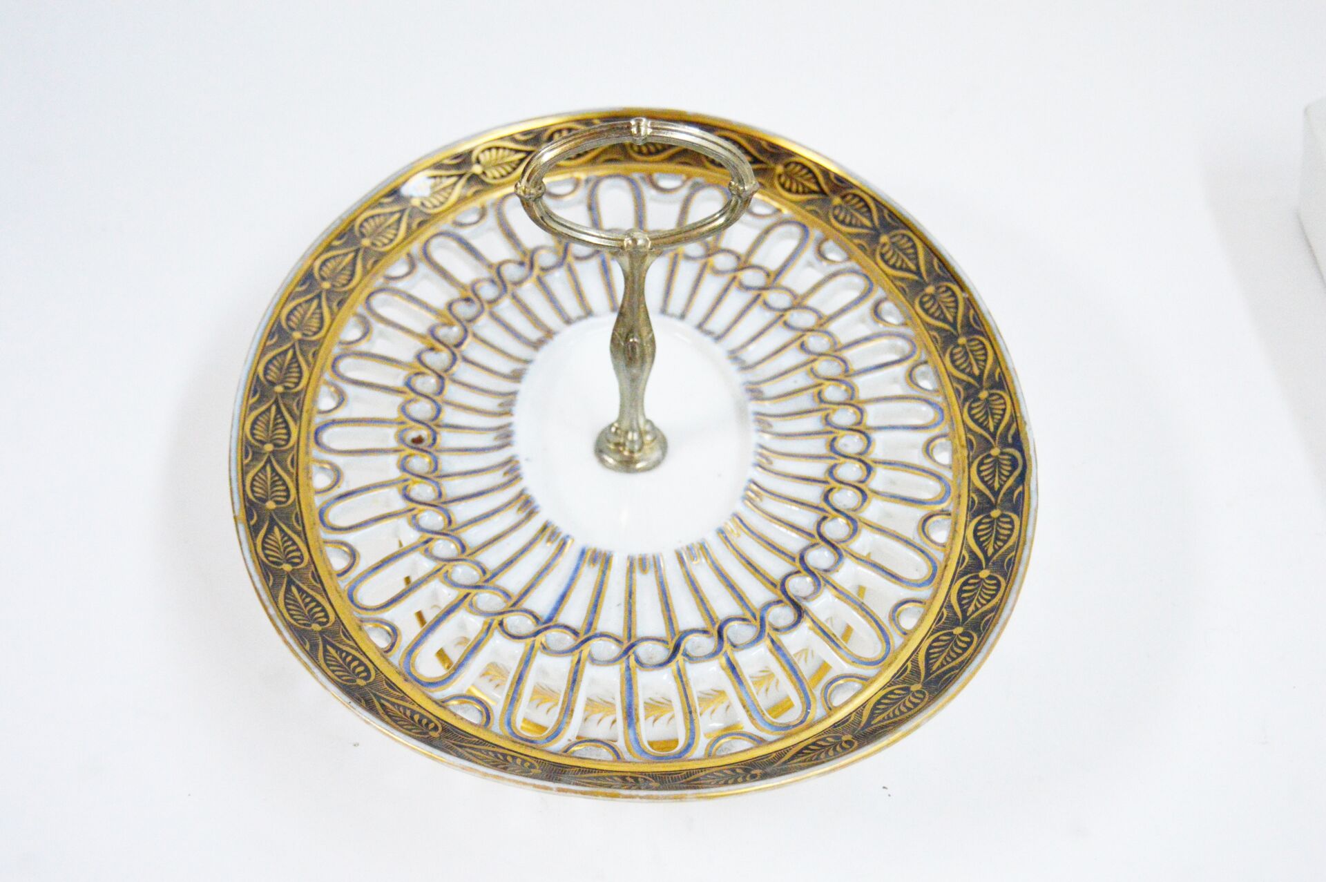 Bayeux. Serviteur en porcelaine émaillée polychrome et dorée H : 16 cm ; L : 33 cm ; l : 26 cm Un plat en porcelaine émaillée blanche. H : 5 cm ; L : 36,5 cm ; l : 32 cm