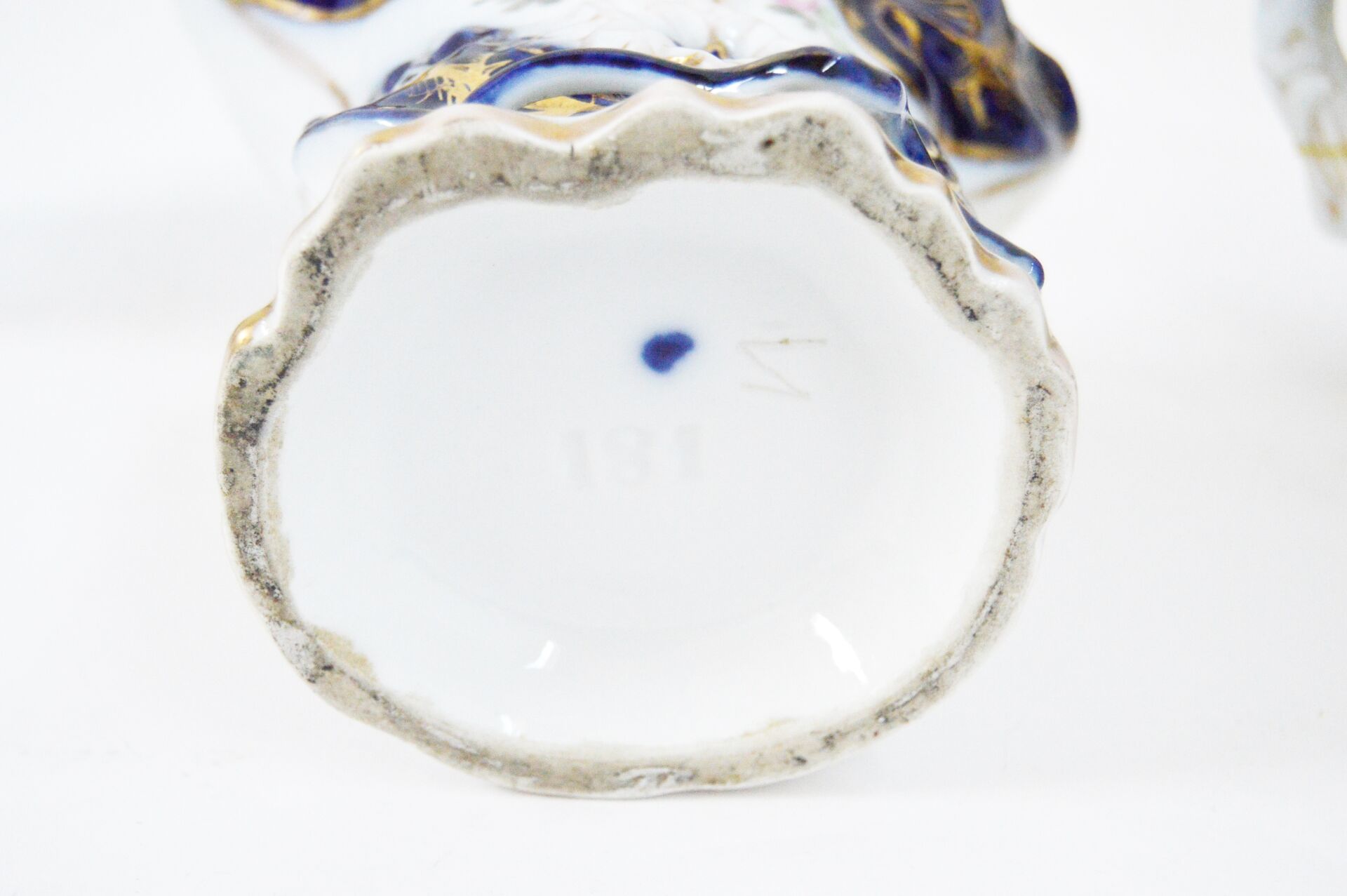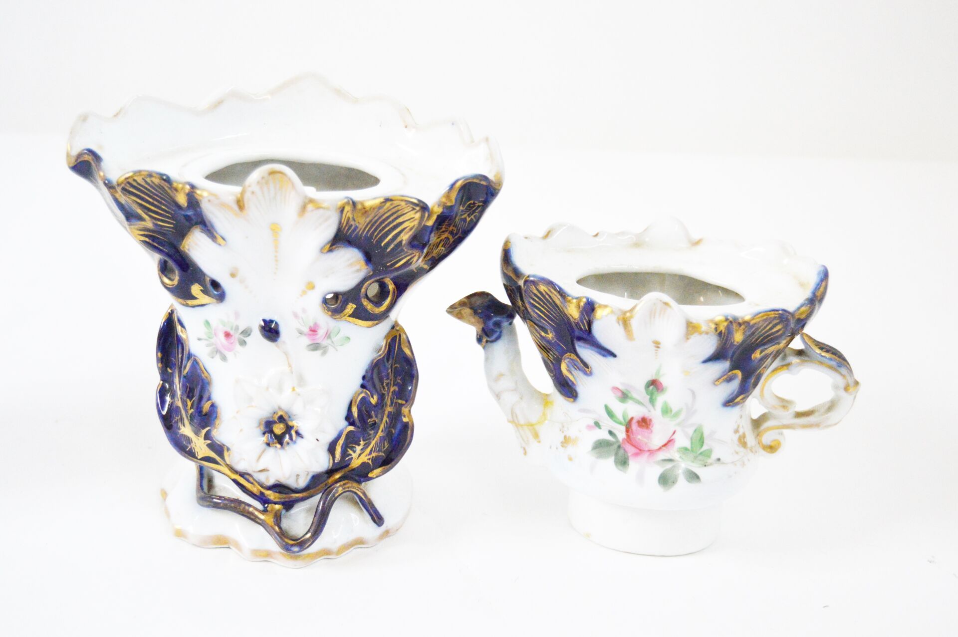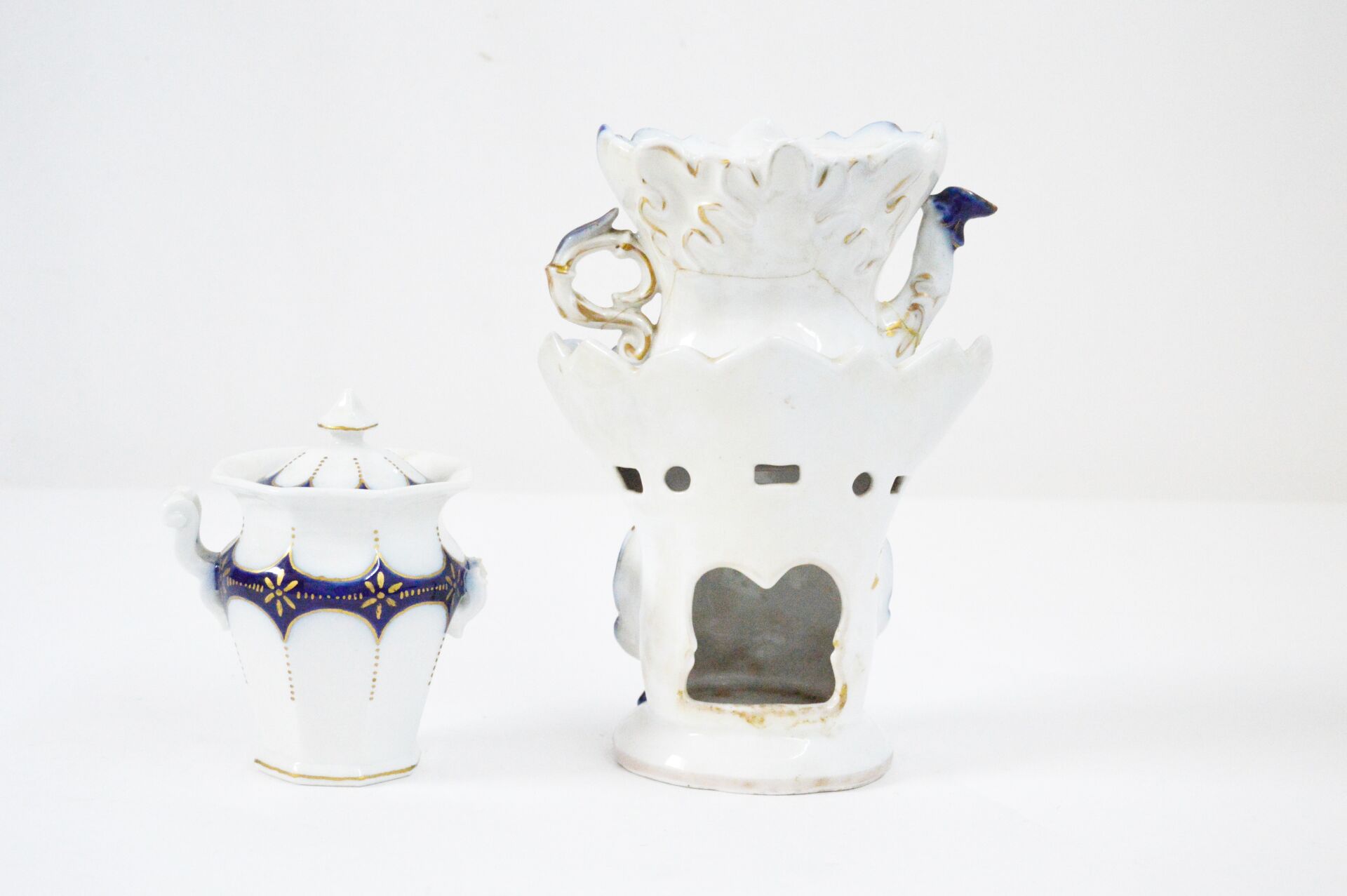 Tisanière en porcelaine émaillée bleue, blanche et dorée. On y joint un pot à sucres (accident). H : 11 cm ; D : 12,5 cm H : 15 cm , L : 16,5 cm ; l :11 cm