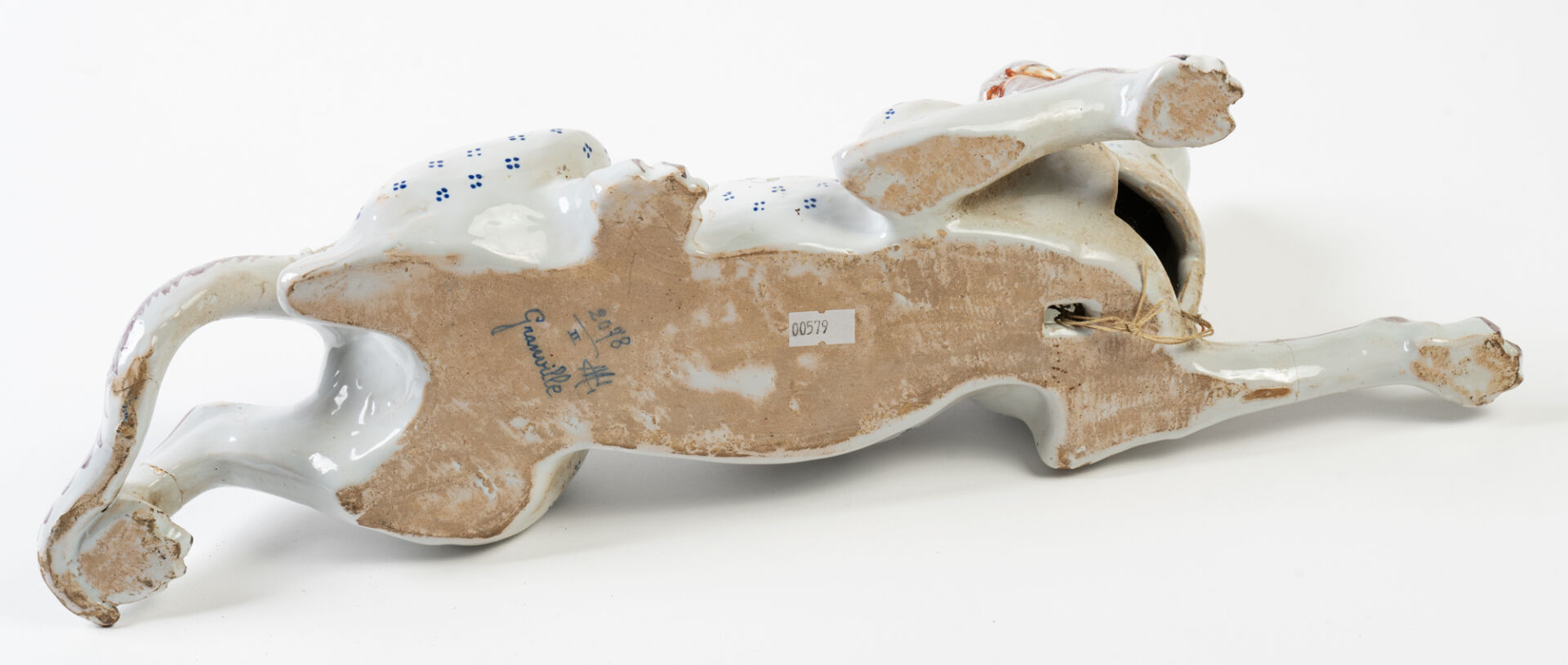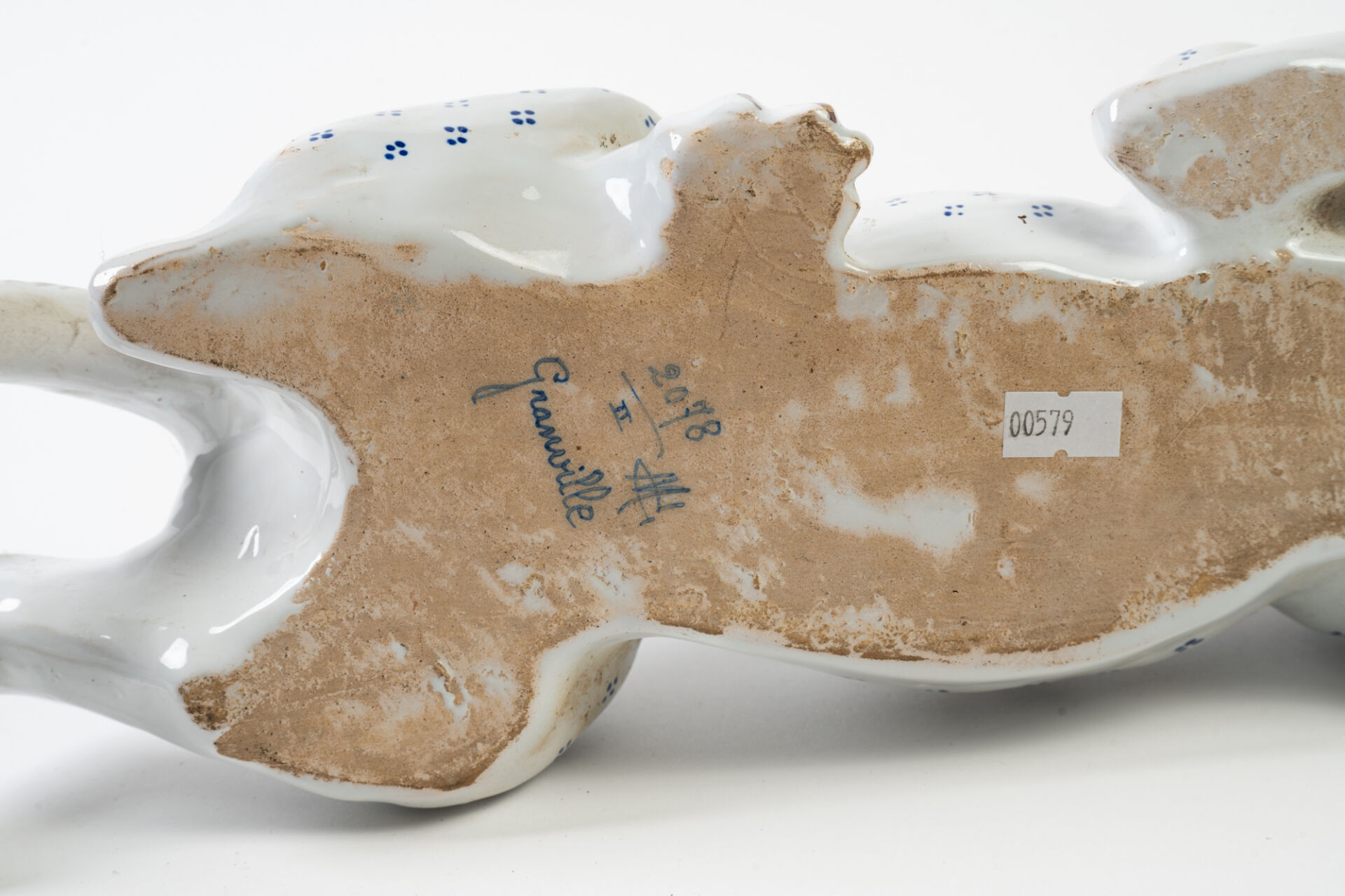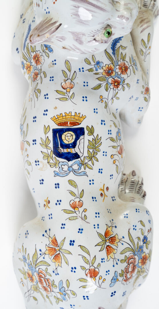 Géo MARTEL (1872-1942) à Desvres. Bouquetière d'applique en faïence émaillée en forme de chat à décor floral et portant le blason de la ville de Granville, avec yeux en verre. Monogrammée "GM", numérotée "2078" et titrée sous la base "Granville". Accidents.