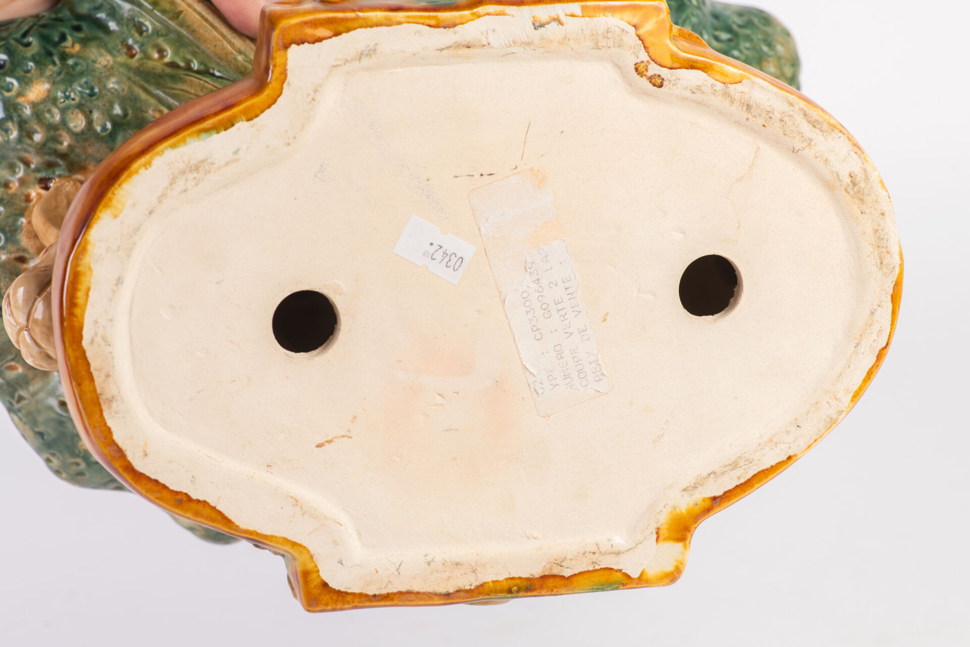 Italie. Coupe en céramique émaillée à décor de lapins et de feuillage dans le goût victorien. H : 15,5 cm ; L : 31 cm ; l : 22 cm