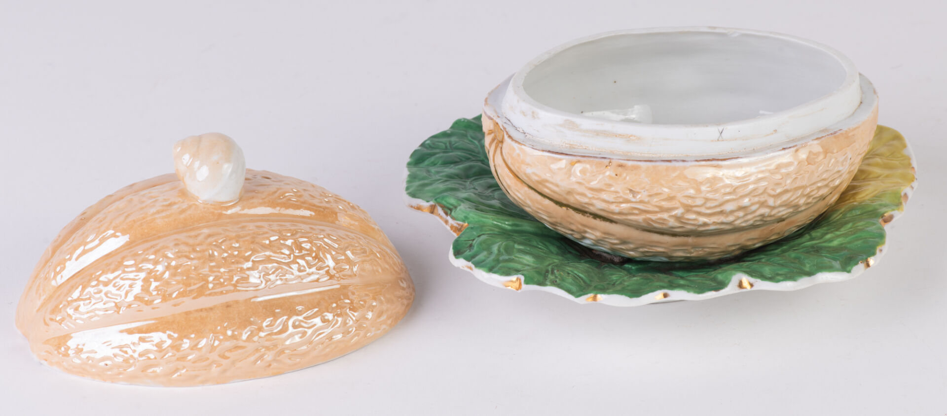 Centre de table en barbotine lustrée et émaillée représentant une noix surmontée un escargot sur une feuille de chou. H : 14 cm ; L : 19 cm ; l : 17 cm