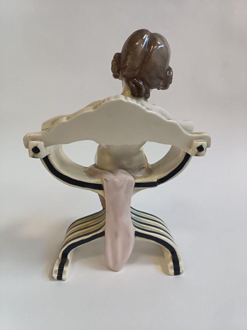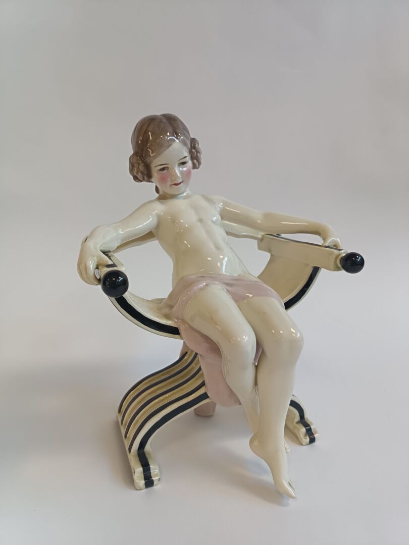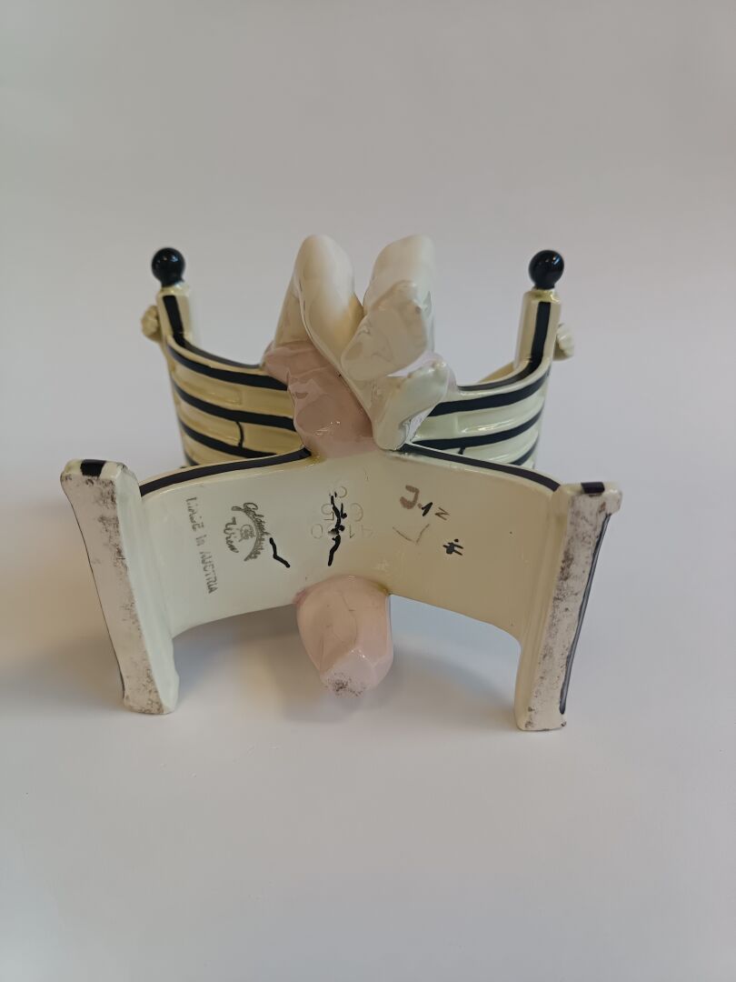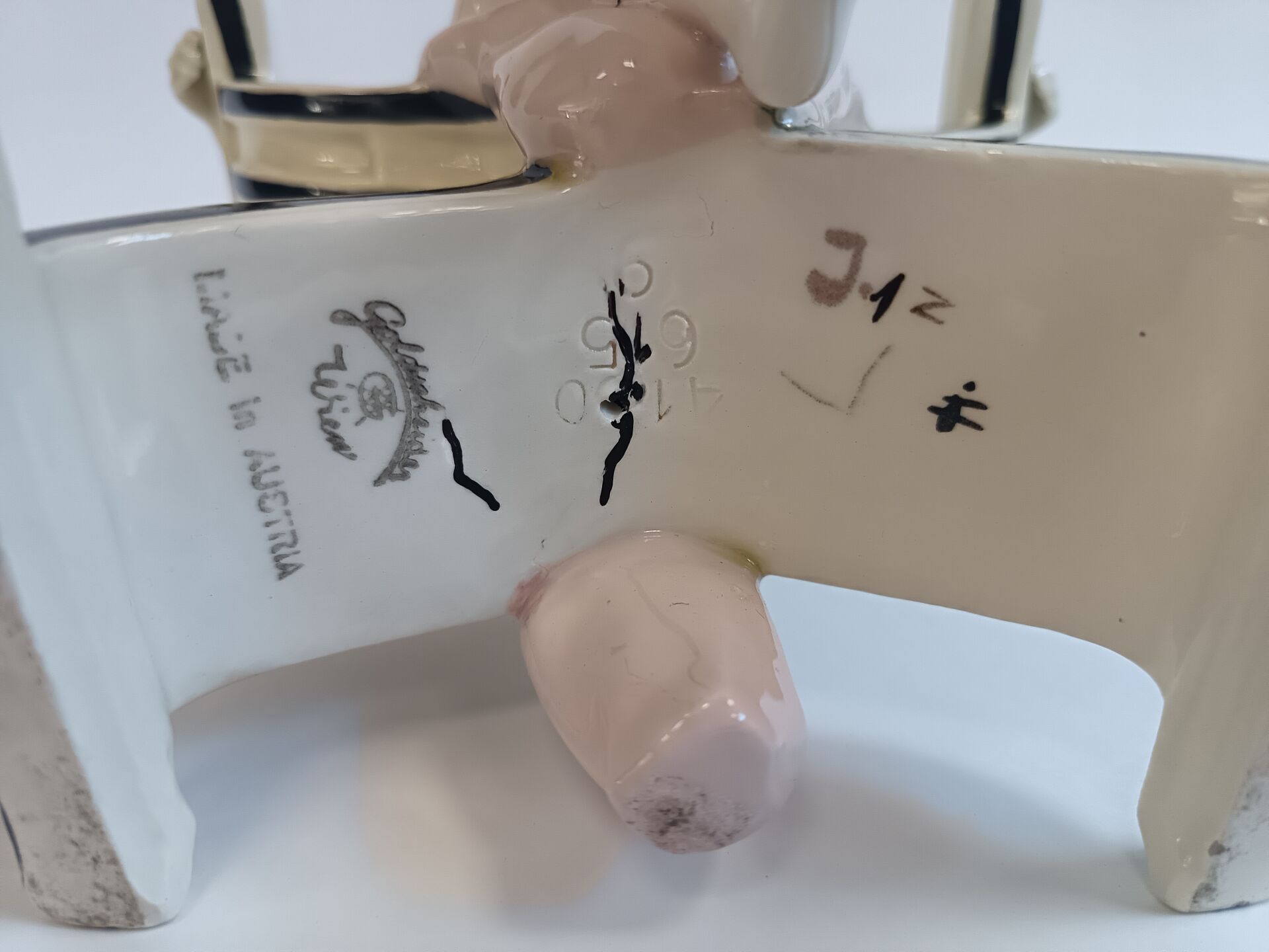Friedrich GOLDSCHEIDER (1845 - 1897), Autriche. "Enfant assis sur une siège curule". Sujet en porcelaine vernissée noir, blanc et beige. Signé "Goldscheider" sous la base. H : 22 cm ; L : 17 cm ; l : 15 cm