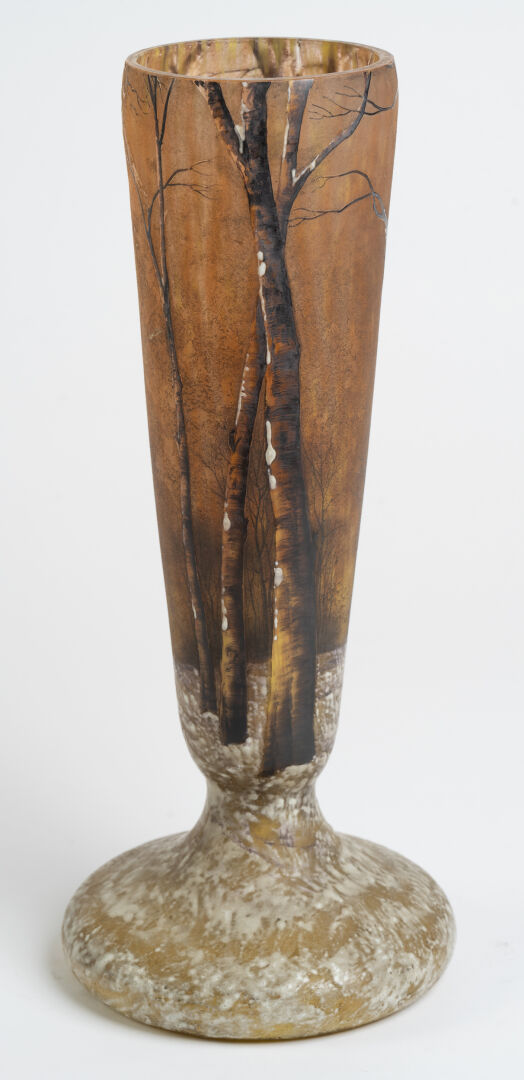 Daum Nancy. Vase balustre en verre double à décor dégagé à l'acide finement gravé et émaillé d'arbres sous la neige sur fond orangé. Vers 1910. Signé "Daum Nancy avec la croix de Lorraine" sous la base. H : 36 cm ; D : 16 cm