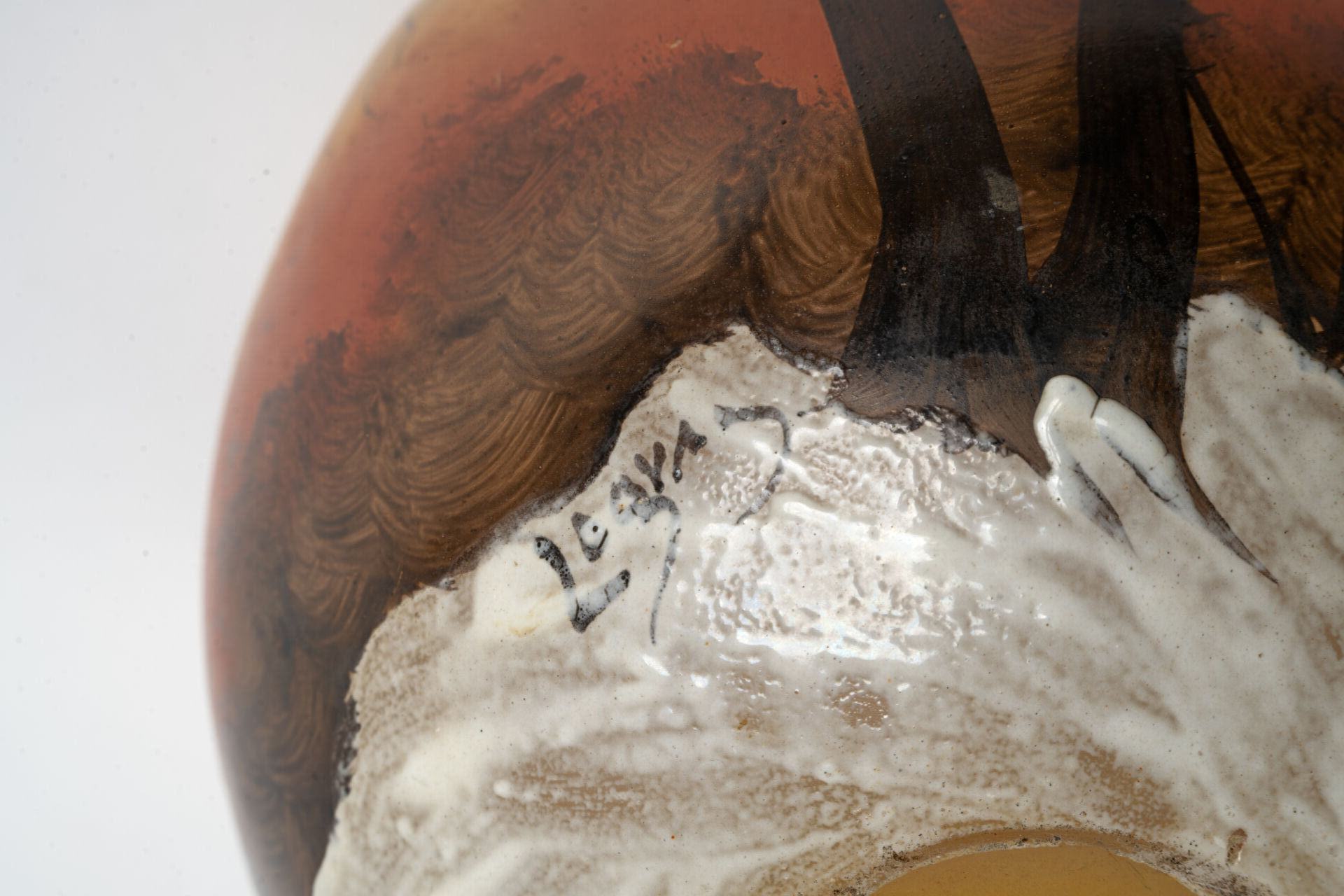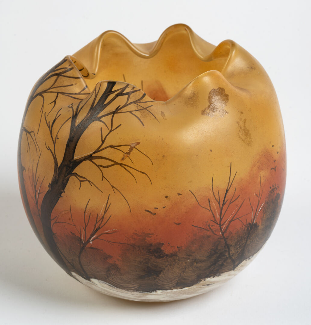 Legras, Nancy. Vase en verre émaillé d'arbres sous la neige sur fond orangé. Signé "Legras". H : 15 cm ; D : 15 cm