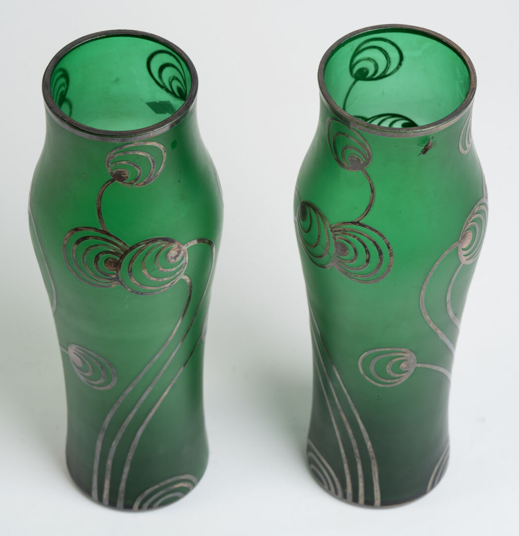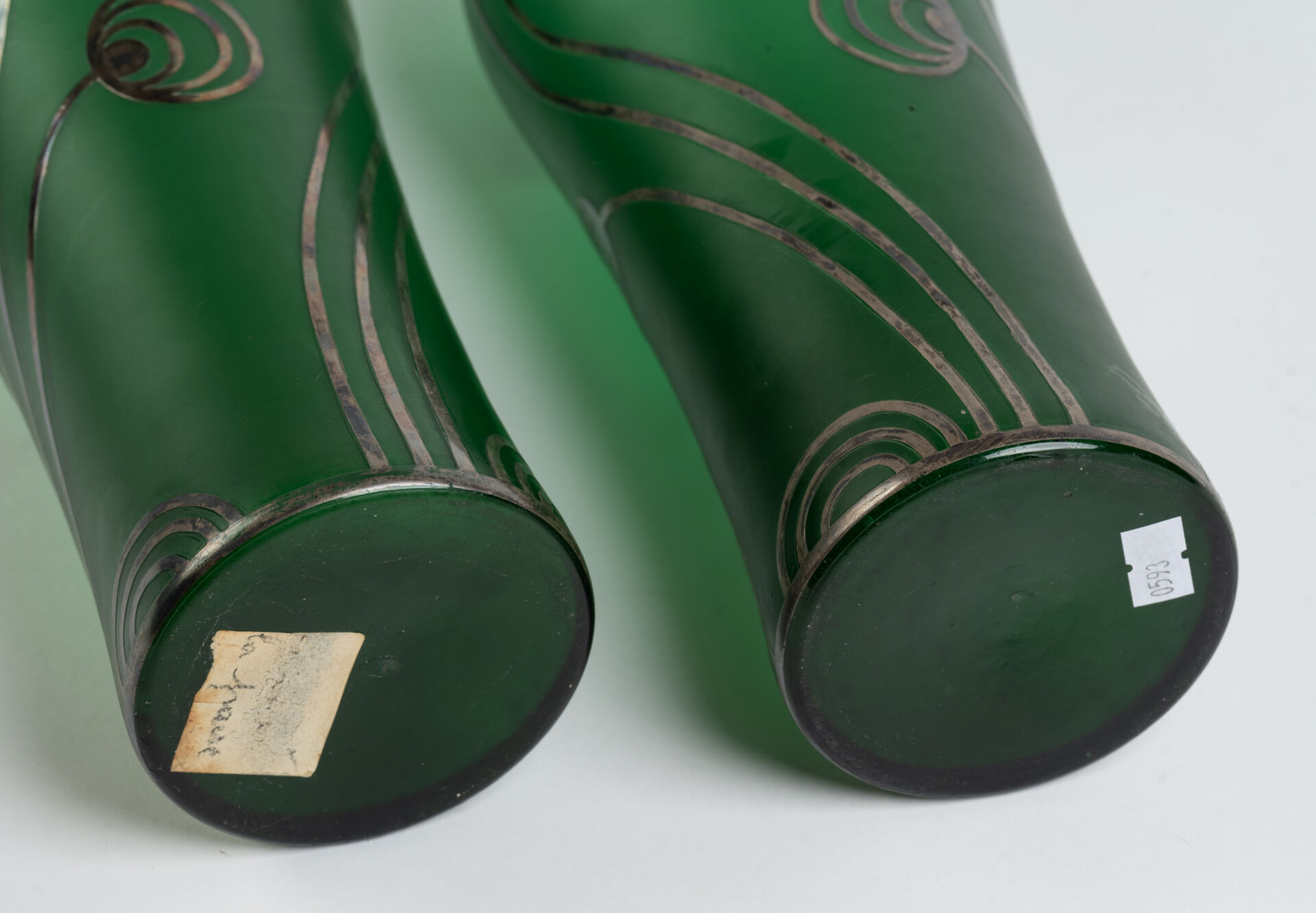 Paire de vases en verre vert et argenté à décor de végétaux et d'enroulements stylisés. Art Déco. H : 33 cm ; D : 11 cm