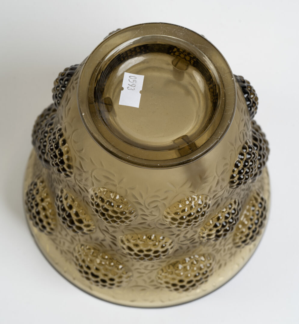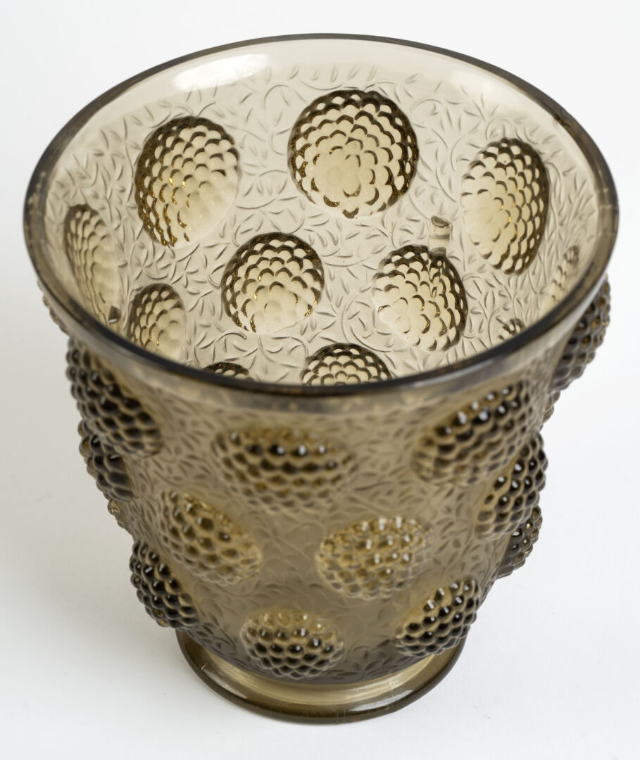 Verlys France. Vase à panse évasée en verre fumé moulé pressé à décor en léger relief de mûres. Signé à l'intérieur en léger relief. H :17 cm ; D 17 cm