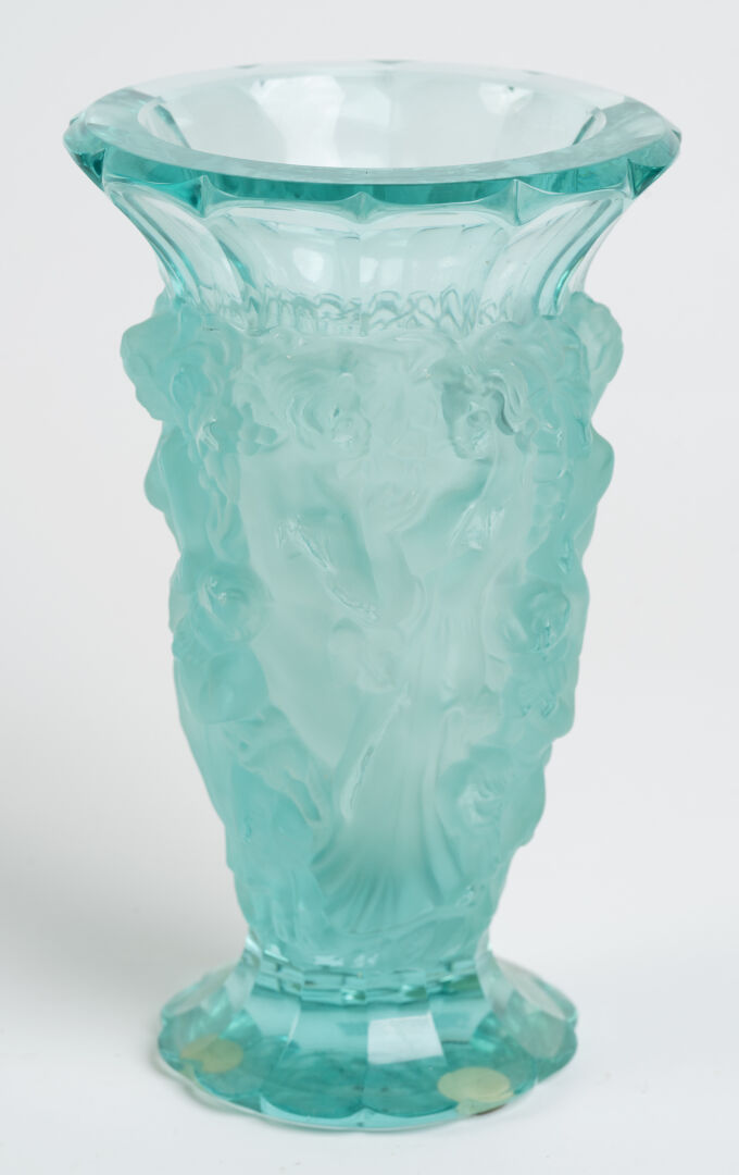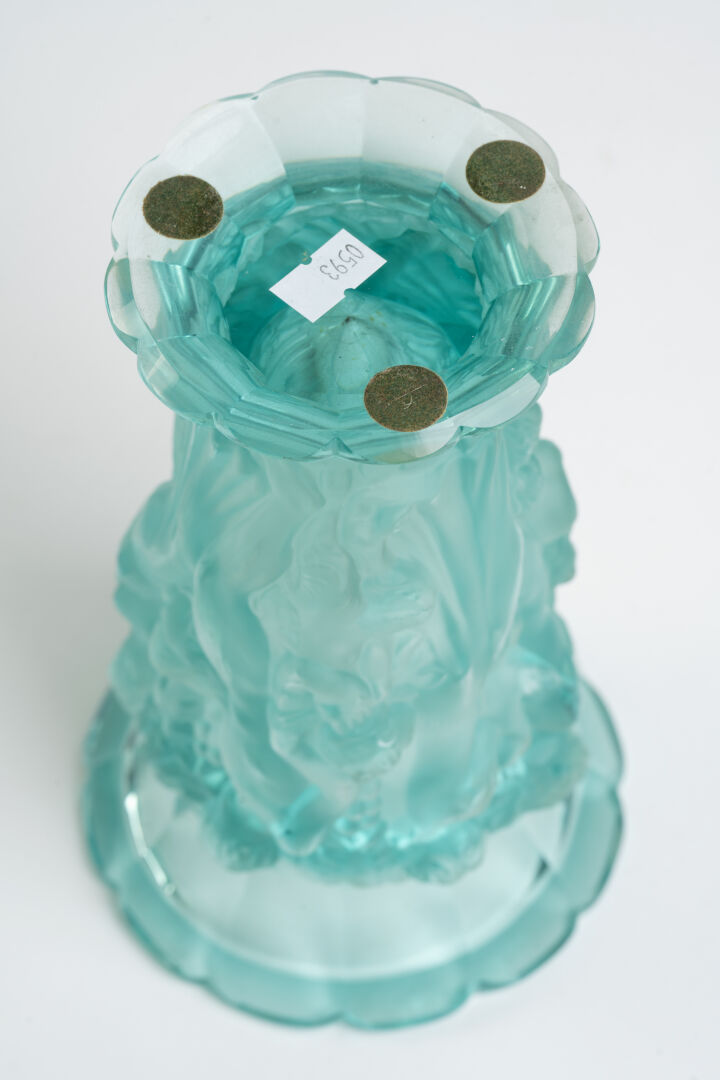 République Tchèque. Vase en verre pressé bleu à décor de femmes nues dépolies. H : 22 cm ; D : 13 cm