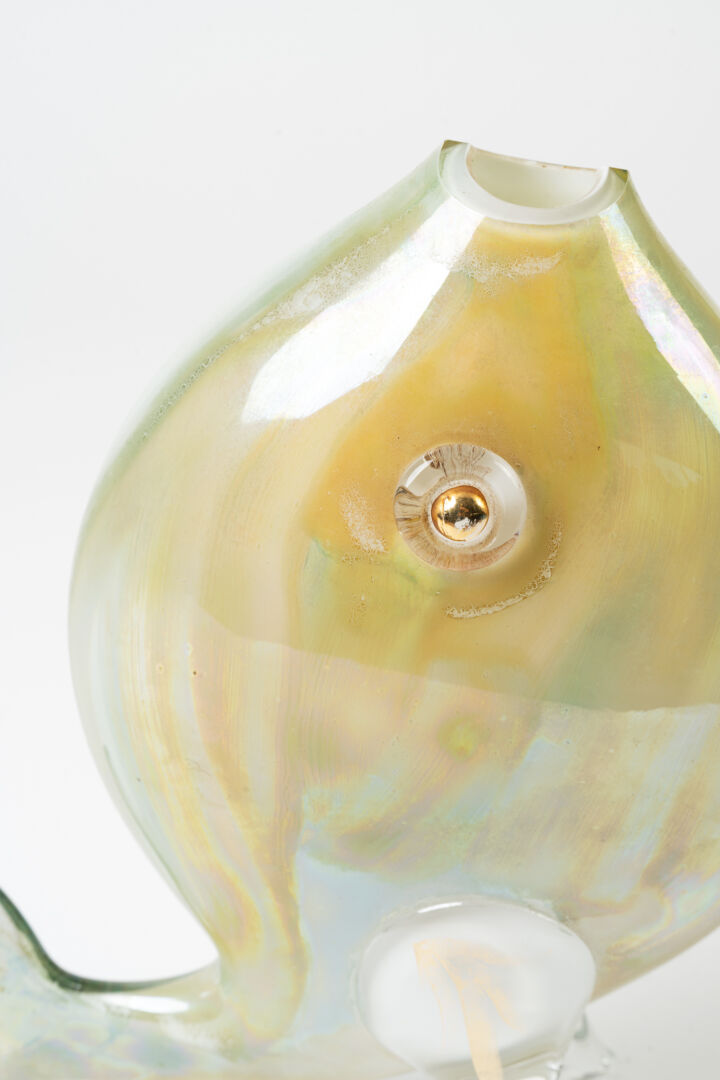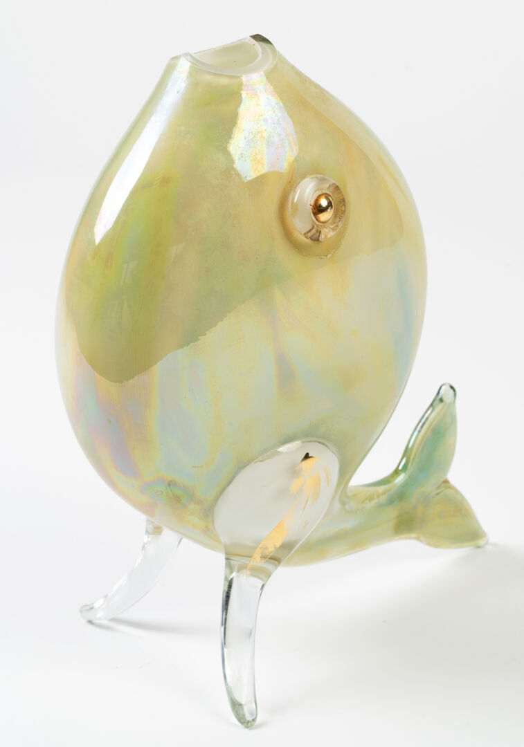 Dans le goût de Blenko Glass Company, USA. Poisson en verre soufflé. H : 32 cm ; L : 30 cm ; l : 14.5 cm