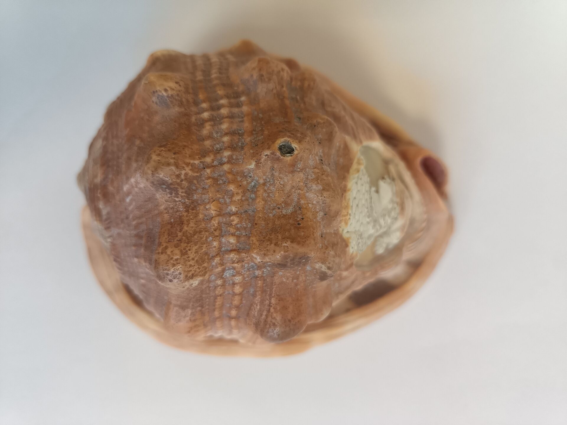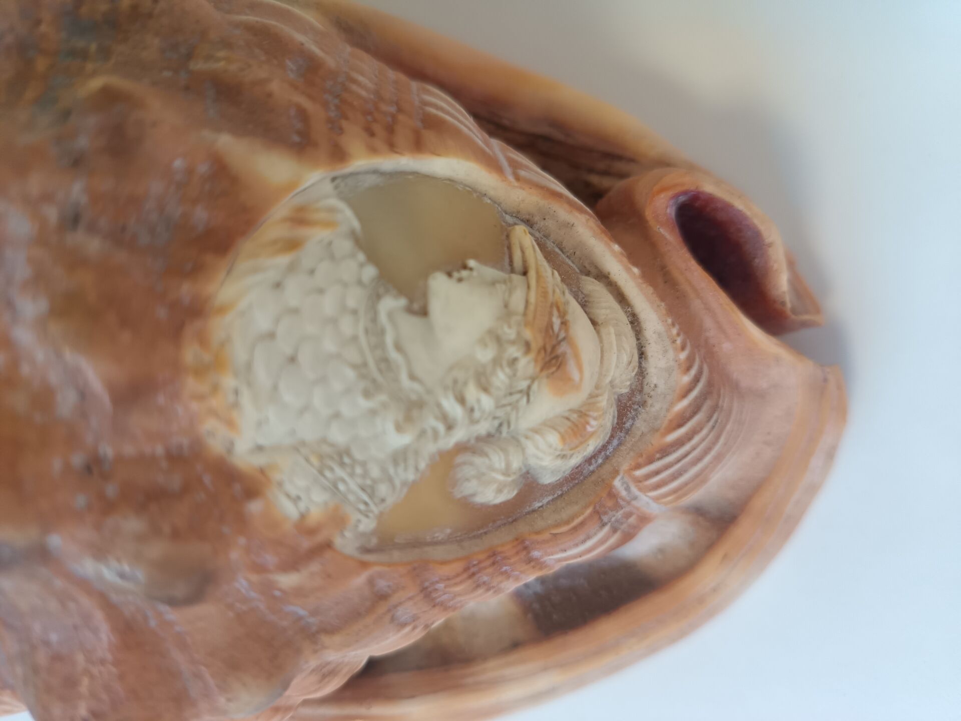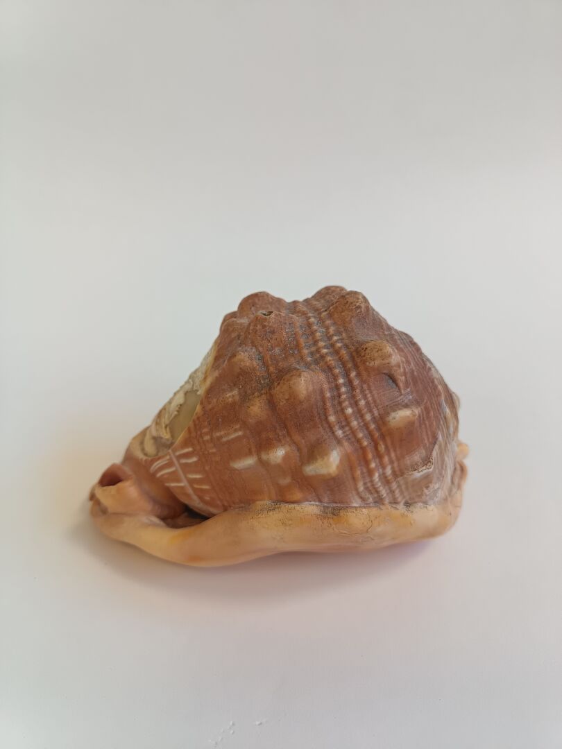 Joli portrait d'homme casqué. Coquillage sculpté à la manière d'un camée. H : 9 cm ; L : 15 cm ; l : 11 cm