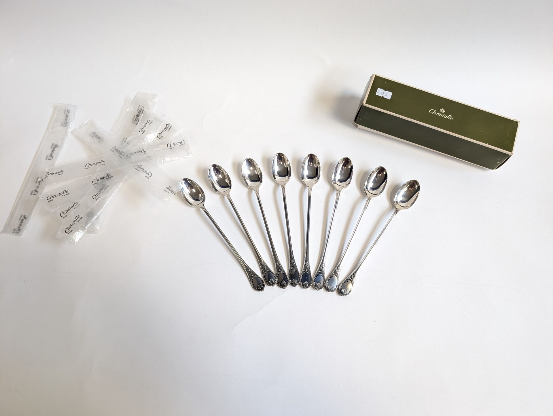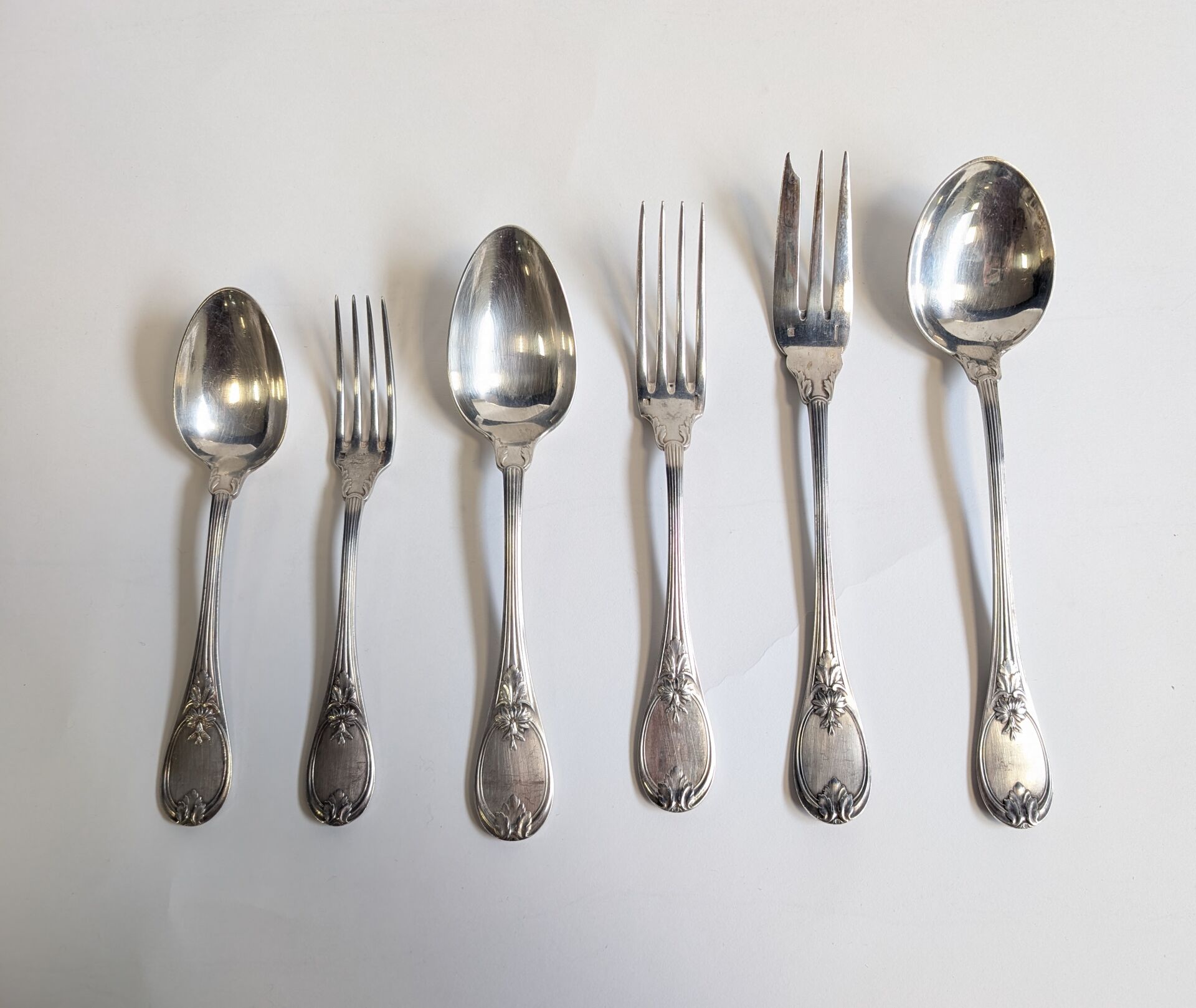 Christofle. Partie de ménagère en métal argenté de 50 pièces modèle "Trianon" comprenant 12 fourchettes, 12 cuillères, 12 fourchettes à dessert, 12 cuillères à dessert et deux couverts à service. On y joint six cuillères à mazagran.