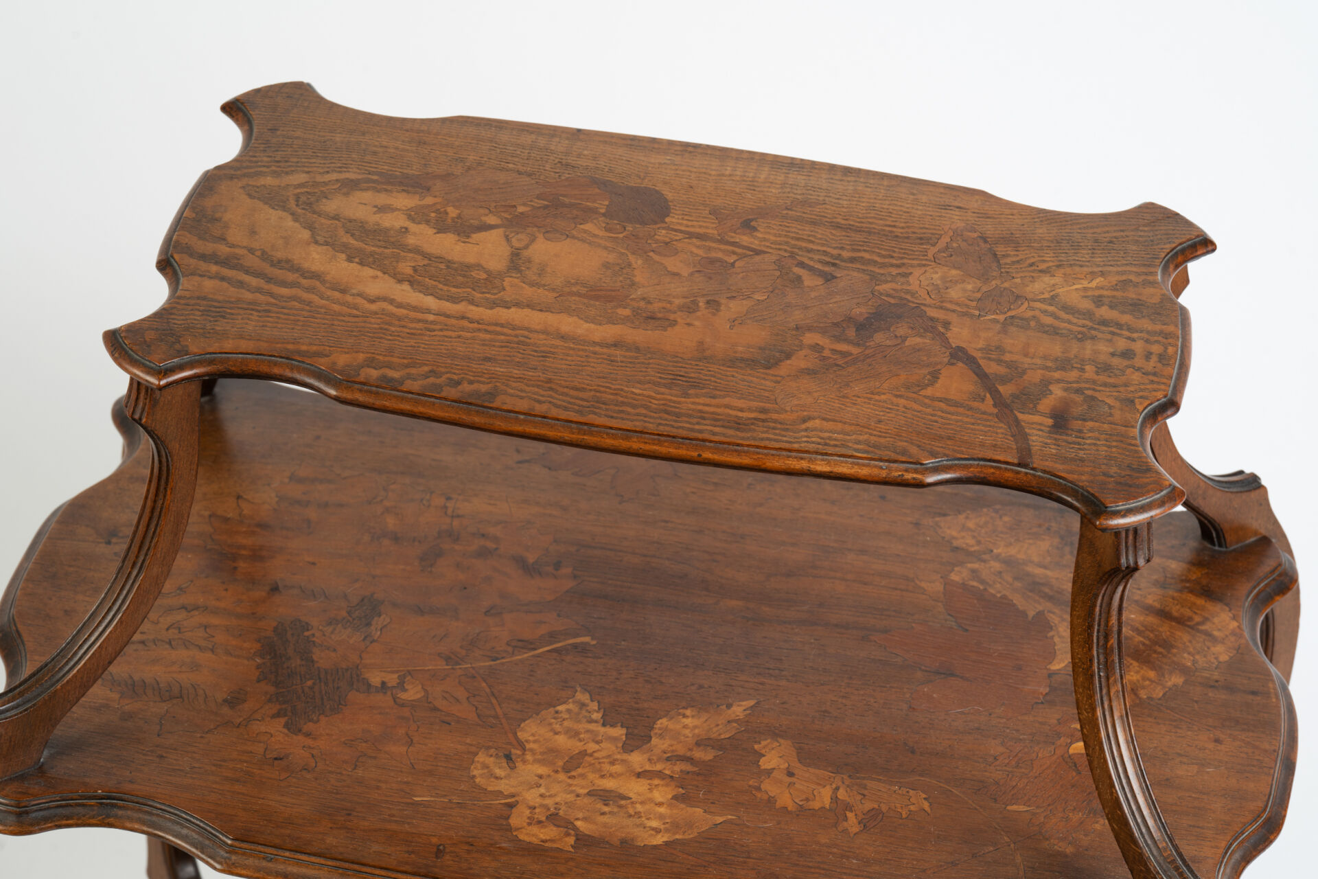 Dans le goût de Louis MAJORELLE (1859-1926). Table de salon à trois plateaux en bois et marqueterie à décor de feuilles. Début XXème. Art Nouveau. H : 69 cm L : 53 cm ; l : 31.5 cm (Plateau du haut) L : 69.5 cm ; l : 48 cm (Plateau du milieu) L : 53.5 cm ; l : 33 cm ( Plateau du bas) un peu abimé