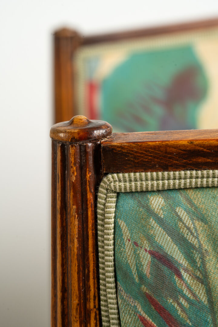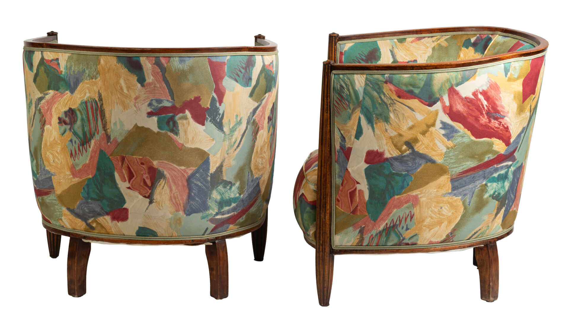 Paire de fauteuils en bois sculpté et garniture en tissu coloré. Art Déco. H : 69 cm ; L : 67 cm ; l : 54 cm