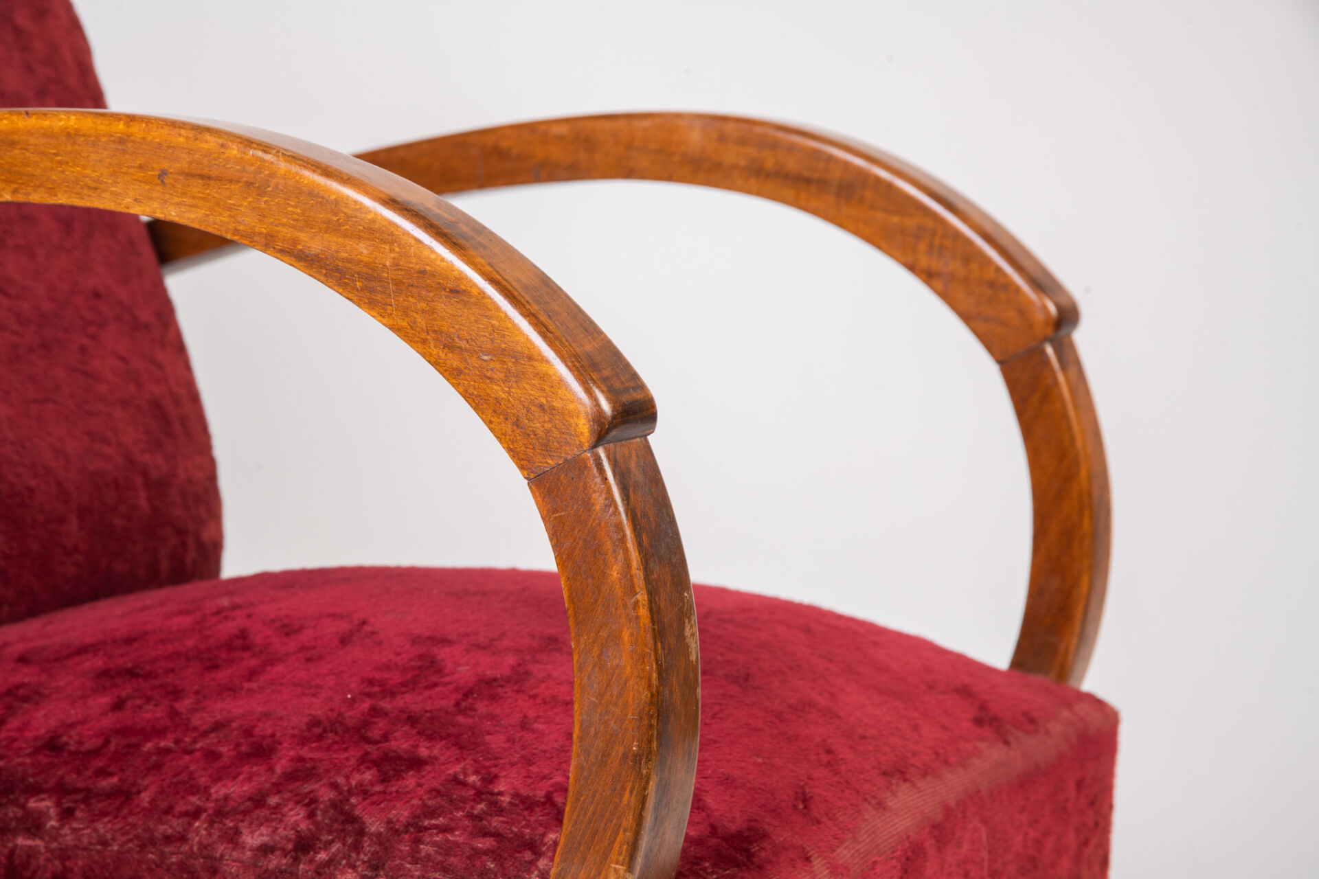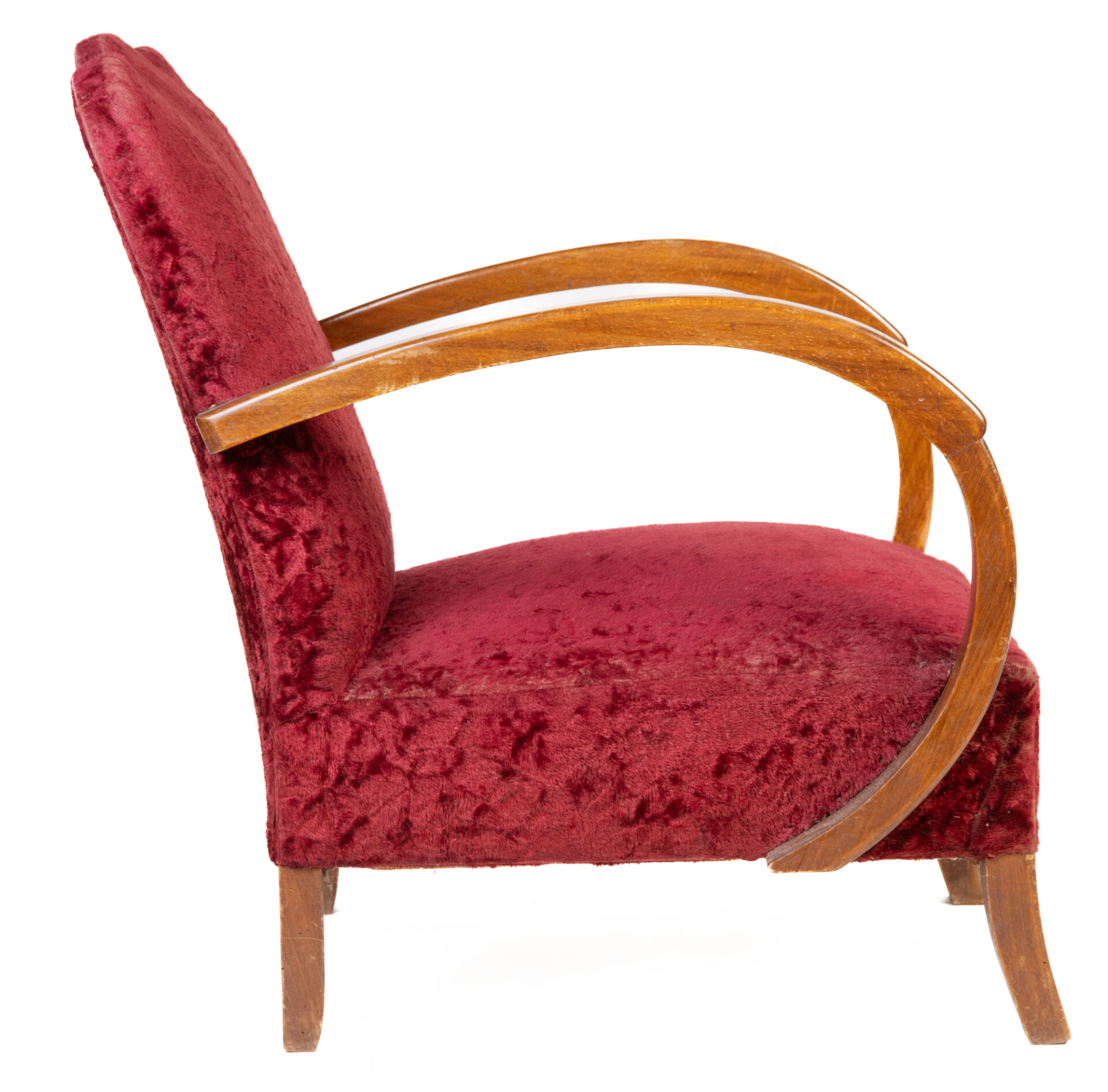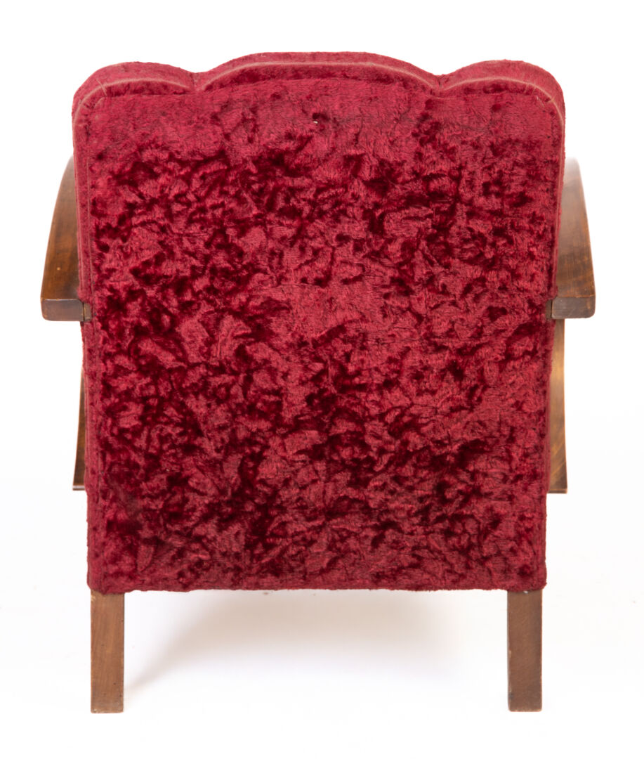 Chauffeuse club en bois et garniture en velours rouge, dans le goût Art Déco. Vers 1930. H : 75 cm ; L : 60,5 cm ; l : 70 cm