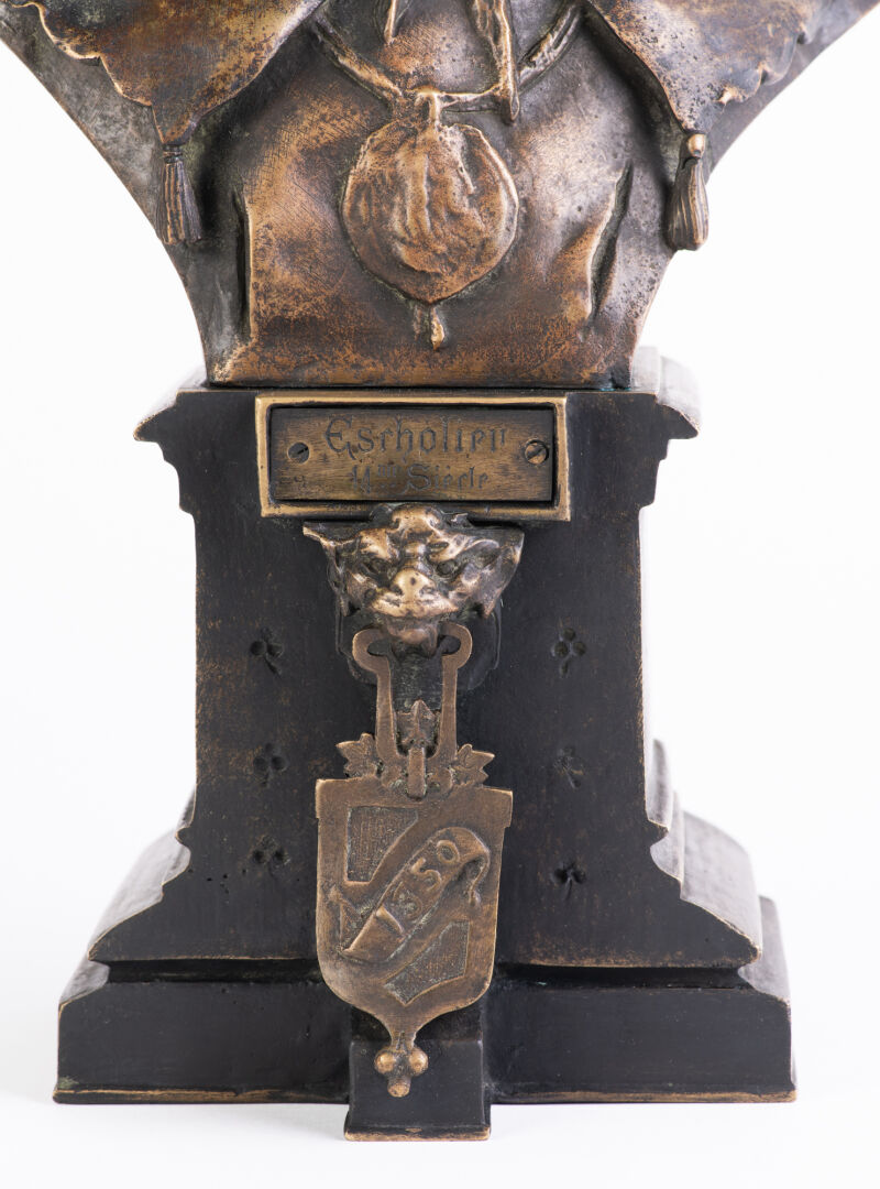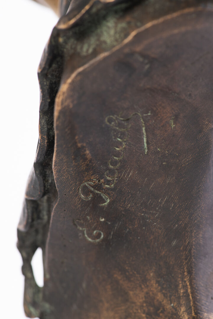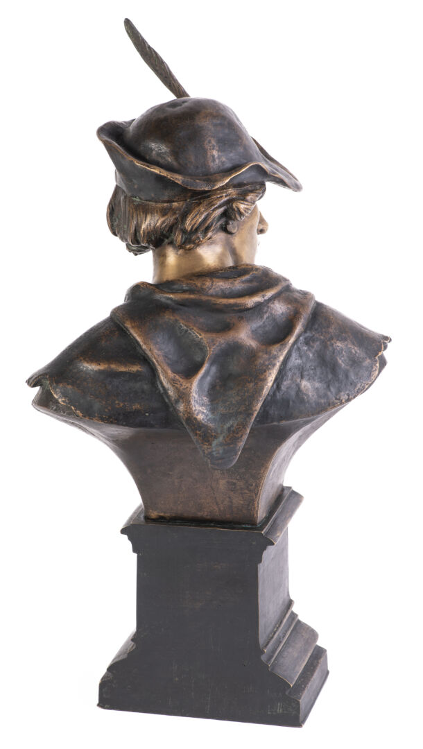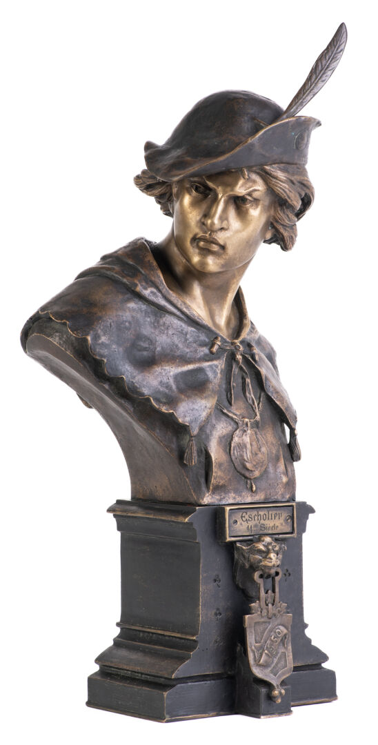 Emile Louis PICAULT (1833-1915). "Buste d'Escholier, 14ème siècle". Bronze à patine brune et dorée, titré et signé. H : 41,5 cm ; L : 32 cm ; l : 11,5 cm