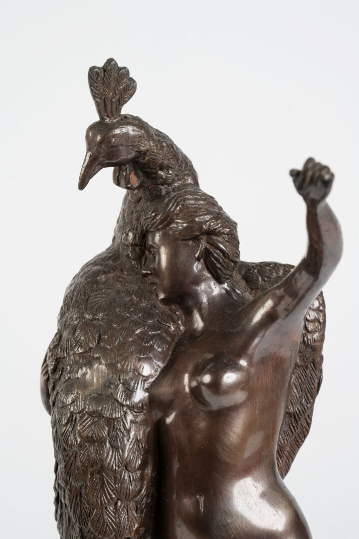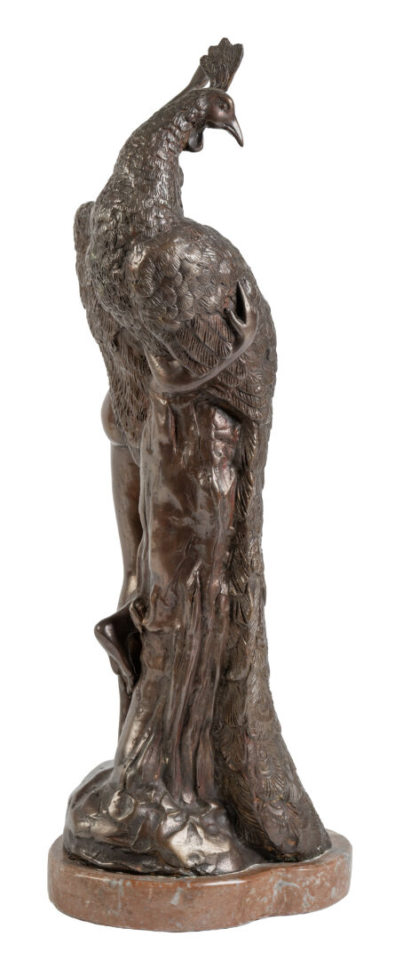 École du XIXème. "Femme au paon". Sujet en bronze à patine brune. H : 50 cm ; D : 20 cm